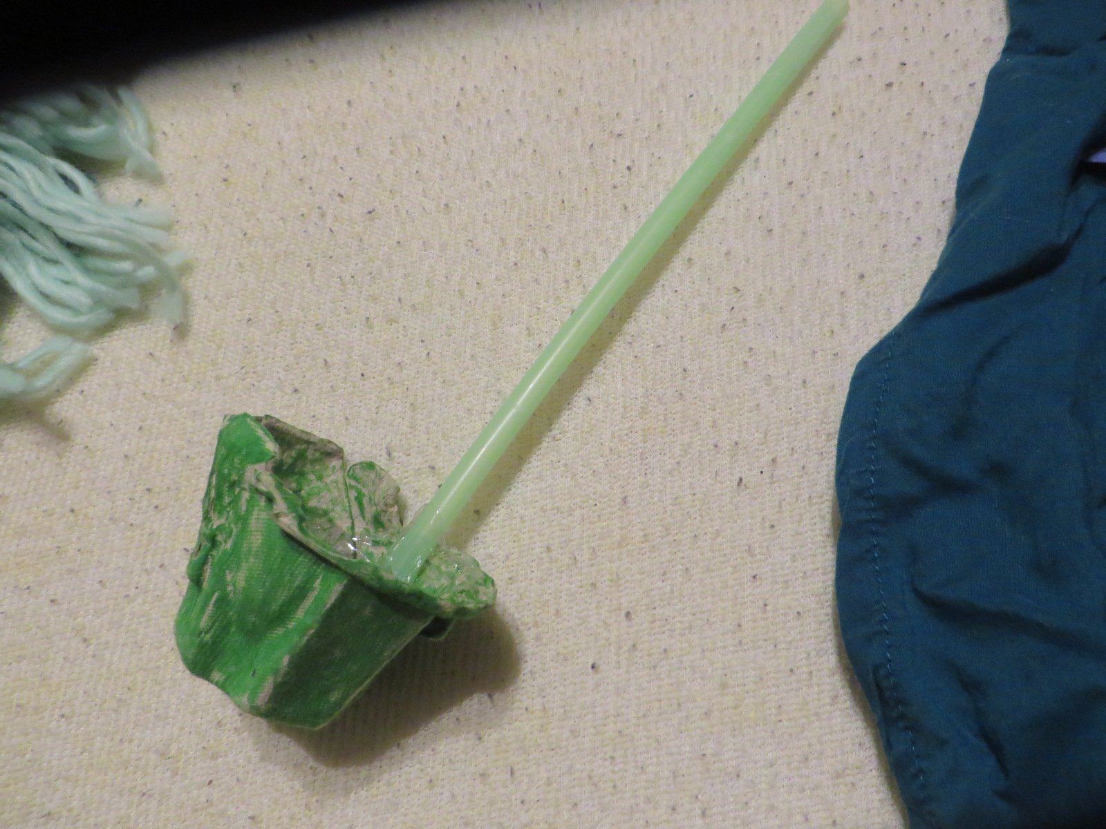 Predám doma vyrobenú masku VODNÍKA. Skladá sa z trička, na ktorom sú našité papierové rybky z výkresov, a z krepového papiera také "strapce". Klobúk je papierový a oblepený zeleným krepovým papierom. K tomu je aj taká "akože fajka" a vlasy sme urobili zo zelenej vlny :).