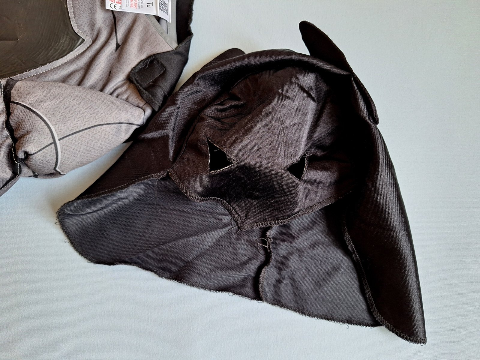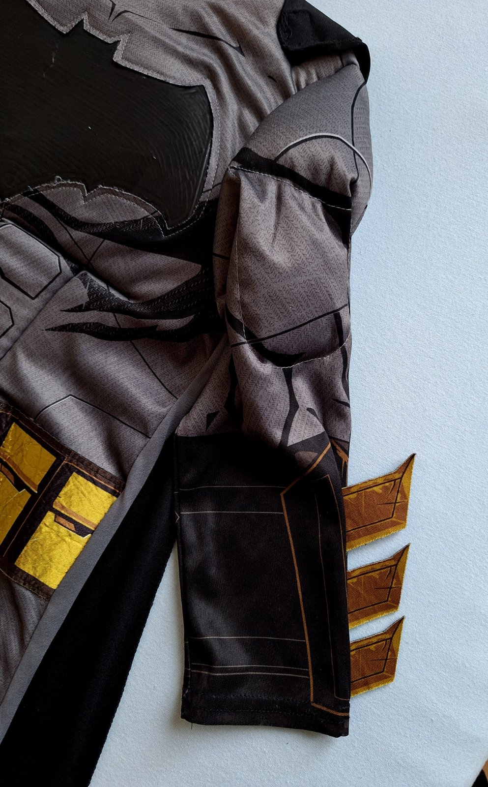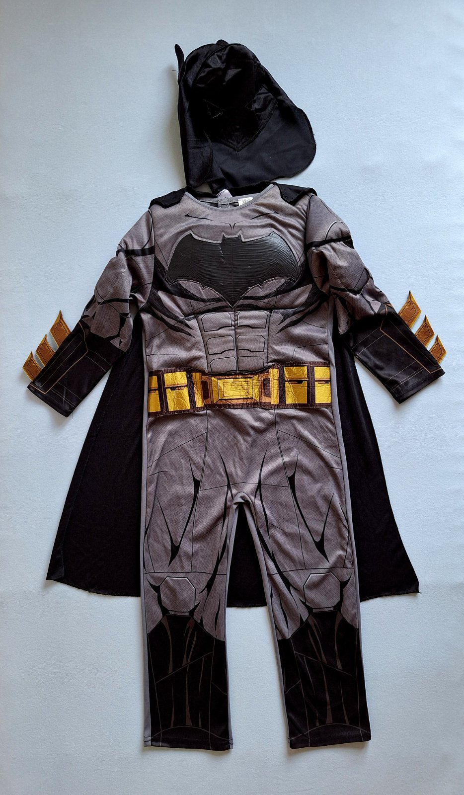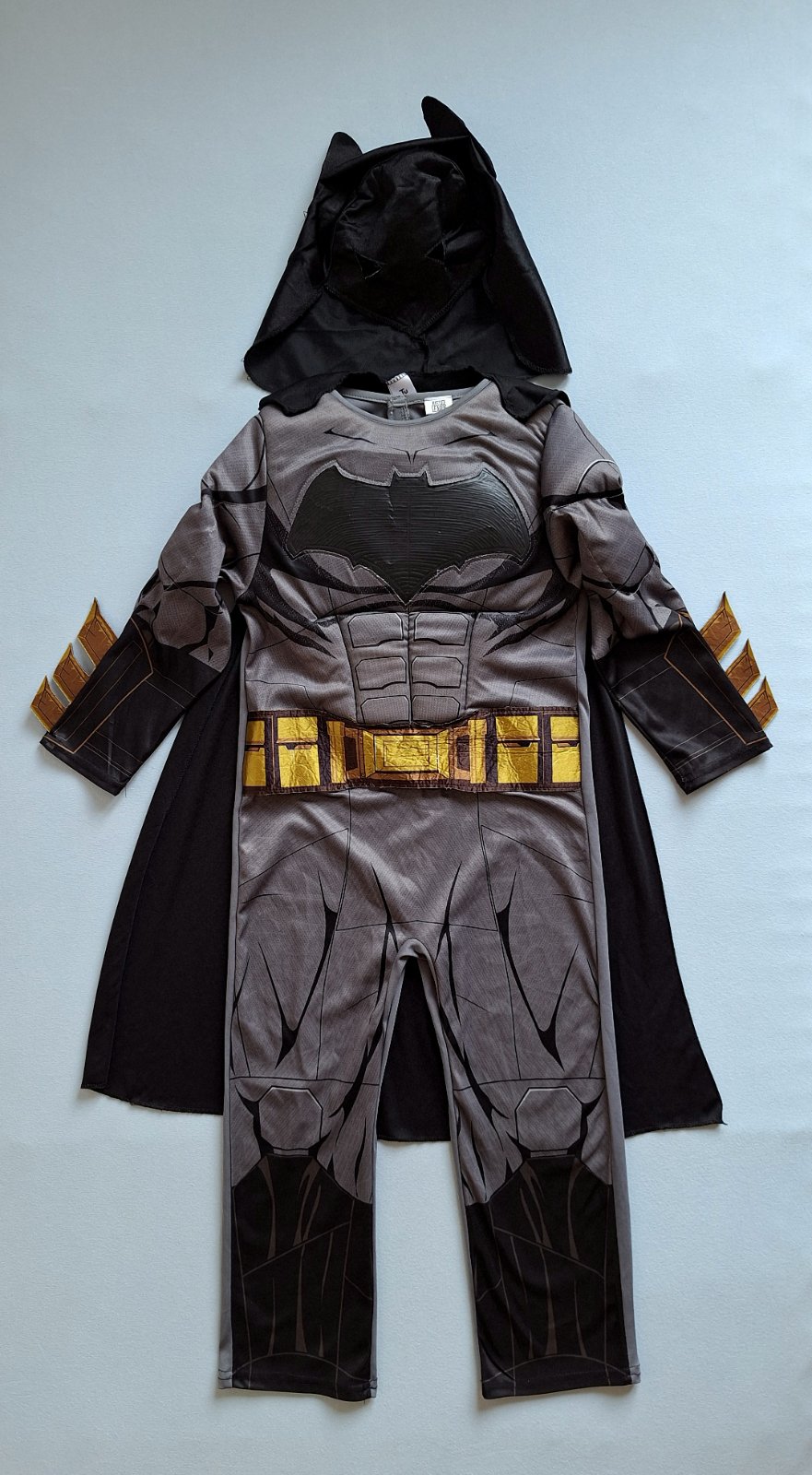 Exkluzívny 3-dielny kostým Batmana (overal + maska + plášť) je v top stave bez poškodení. Kostým je elastický s čiernym znakom na hrudi. Hruď a svaly sú silne vystužené, zapína sa na chrbte na suché zipsy. Na ramenách je na suché zipsy prichytený plášť. Maska sa navlieka na hlvičku jako čiapka,pekne drží.