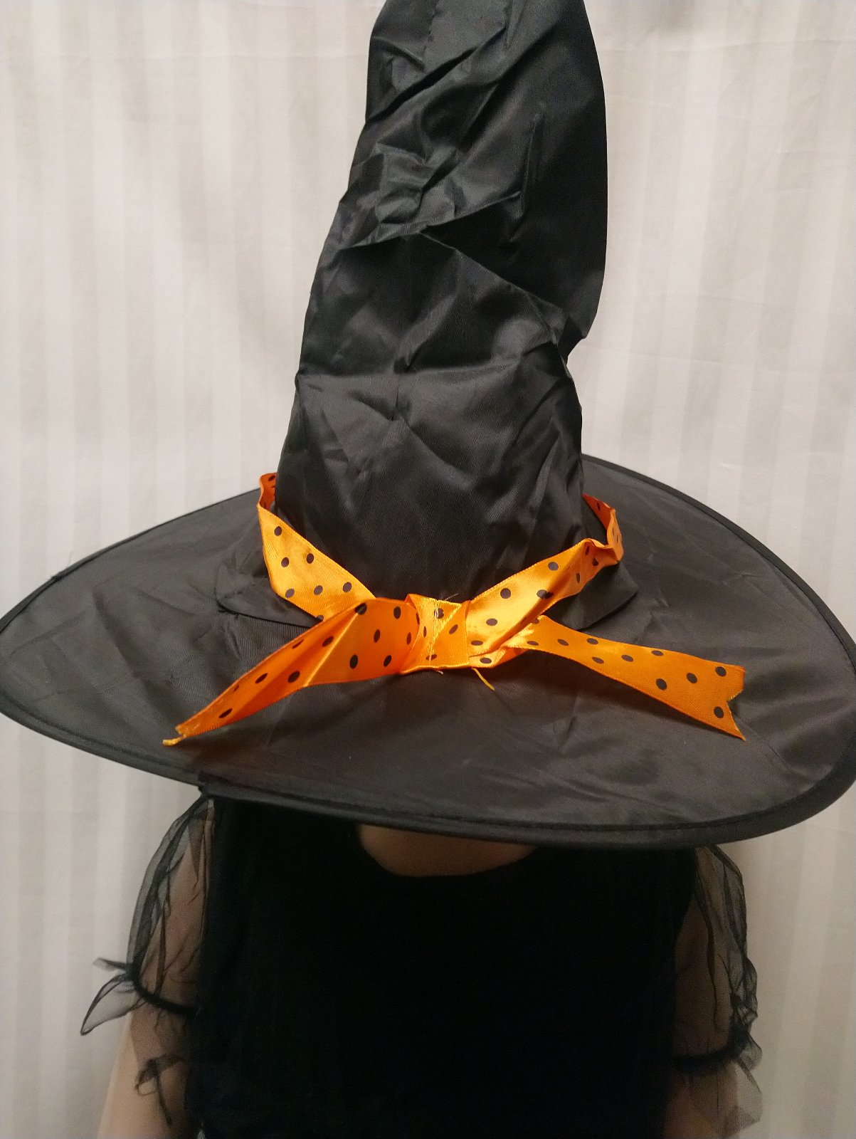 2. čierny čarodejnícky klobúk s oranžovou stuhou,