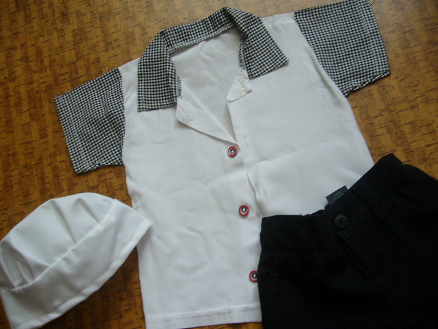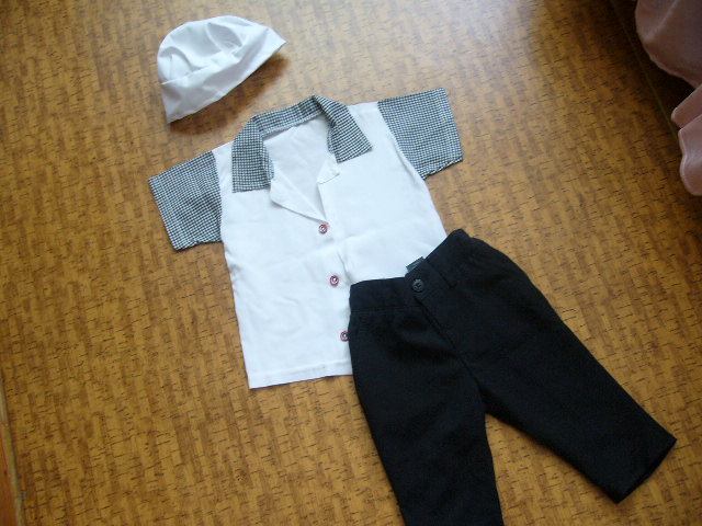 Karnevalovy kostym KUCHAR. Nohavice su zn.Next,na stitku pise 6mesiacov, ale oblecie aj ovela starsie dieta.,podla rozmerov. Pas ma regulovatelnu gumu.V klude meria 22x2, napne sa na 25x2.Dlzka nohavic 36cm.Kosela meria pod pazuchami 27x2.Dlzka 34cm.Ciapka ma obvod 42cm.Raz pouzite,bez poskodeni. Cena spolu 9.50 +postovne