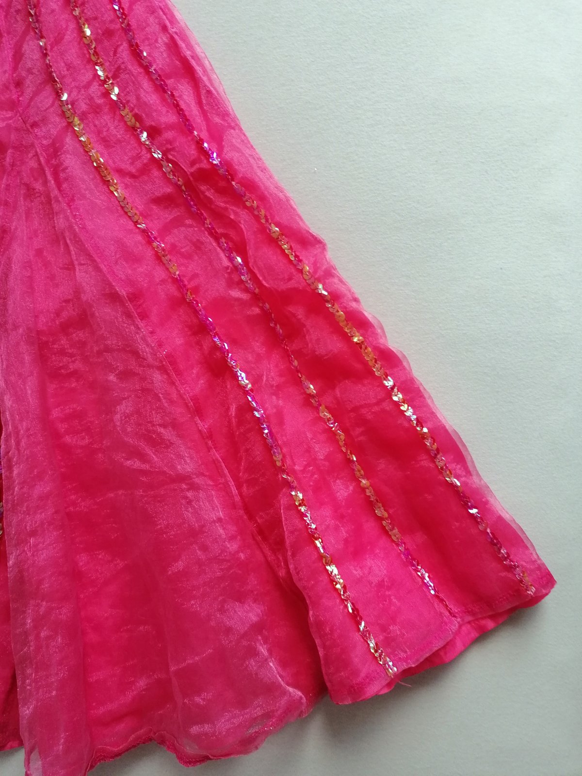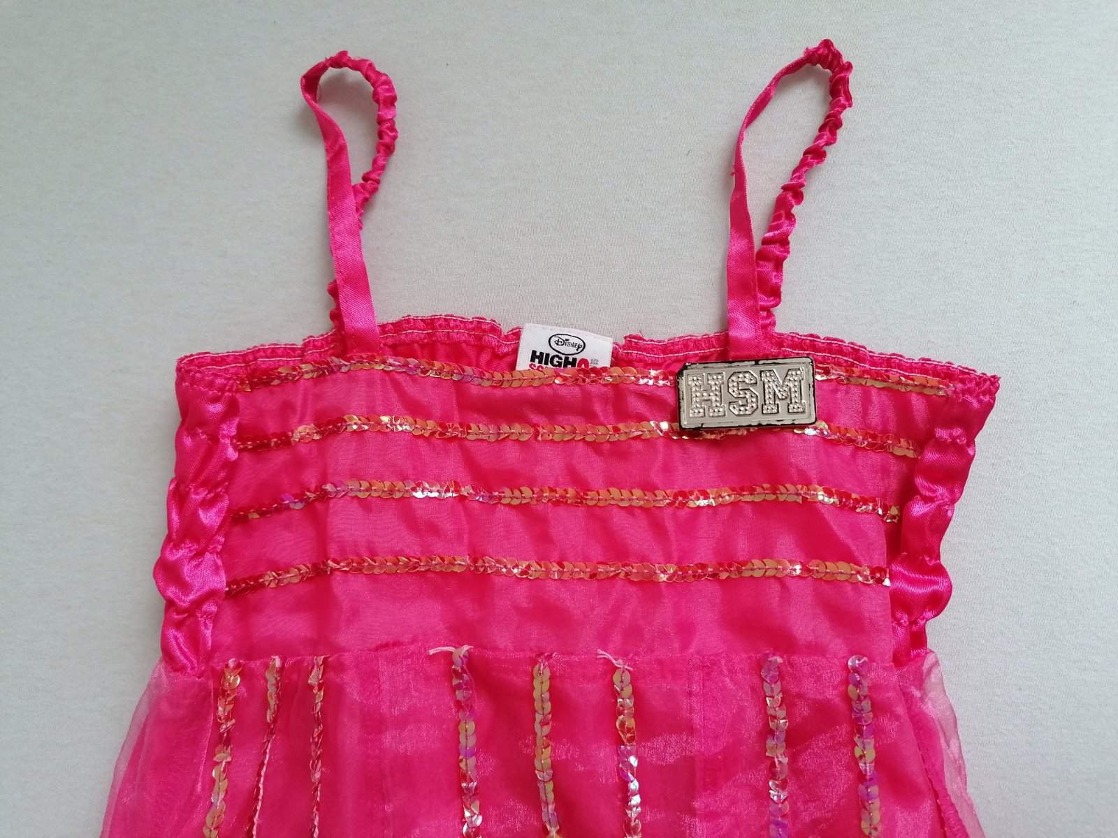 Originál šaty z filmu High School Musical sú zdobené trblietavými flitrami, živôtik vzadu nazberkaný do gumiček, pekne sa prispôsobia postave. Sukňa je dvojvrstvová, strom dole sa pekne rozširuje. Stav: Top stav bez poškodení, len brošňa so znakom HSM je mierne po krajoch ošúchaná (nič vážne, vyzerá to jako naschvál)