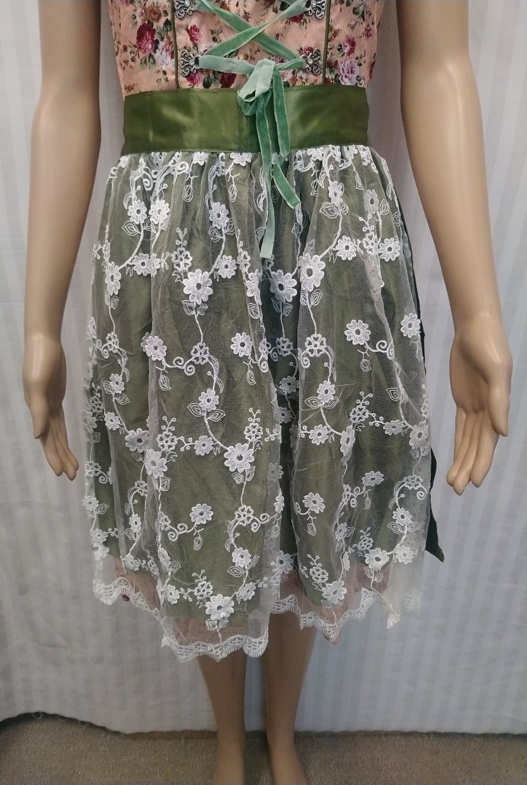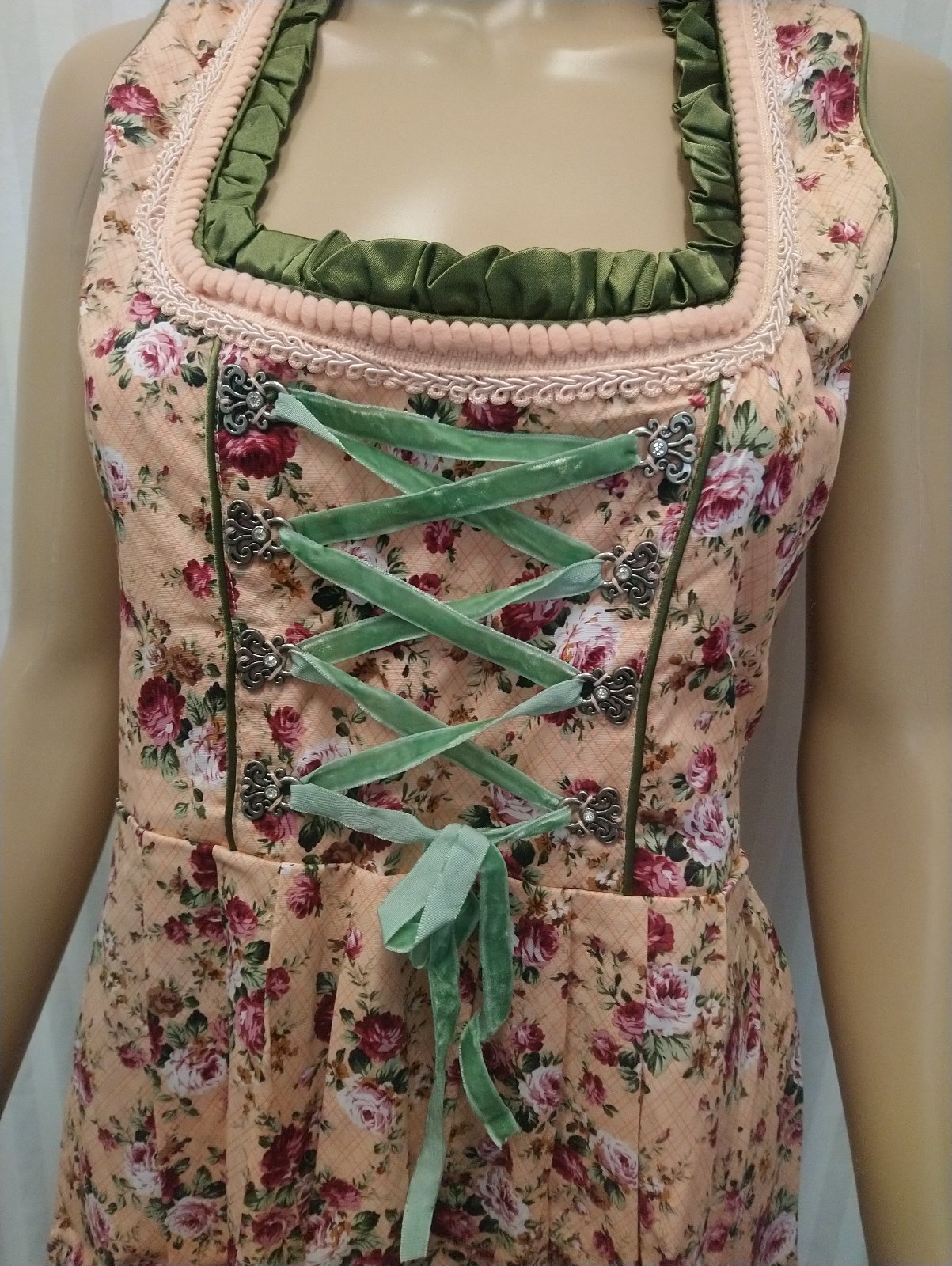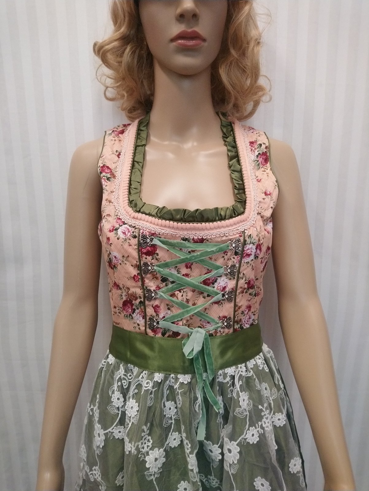 1. luxusný brokátový dirndl bavorský kroj s kvetmi Dirndline, krásne ružové šaty s kvetinovým motívom, zelené lemovanie, zips na boku,