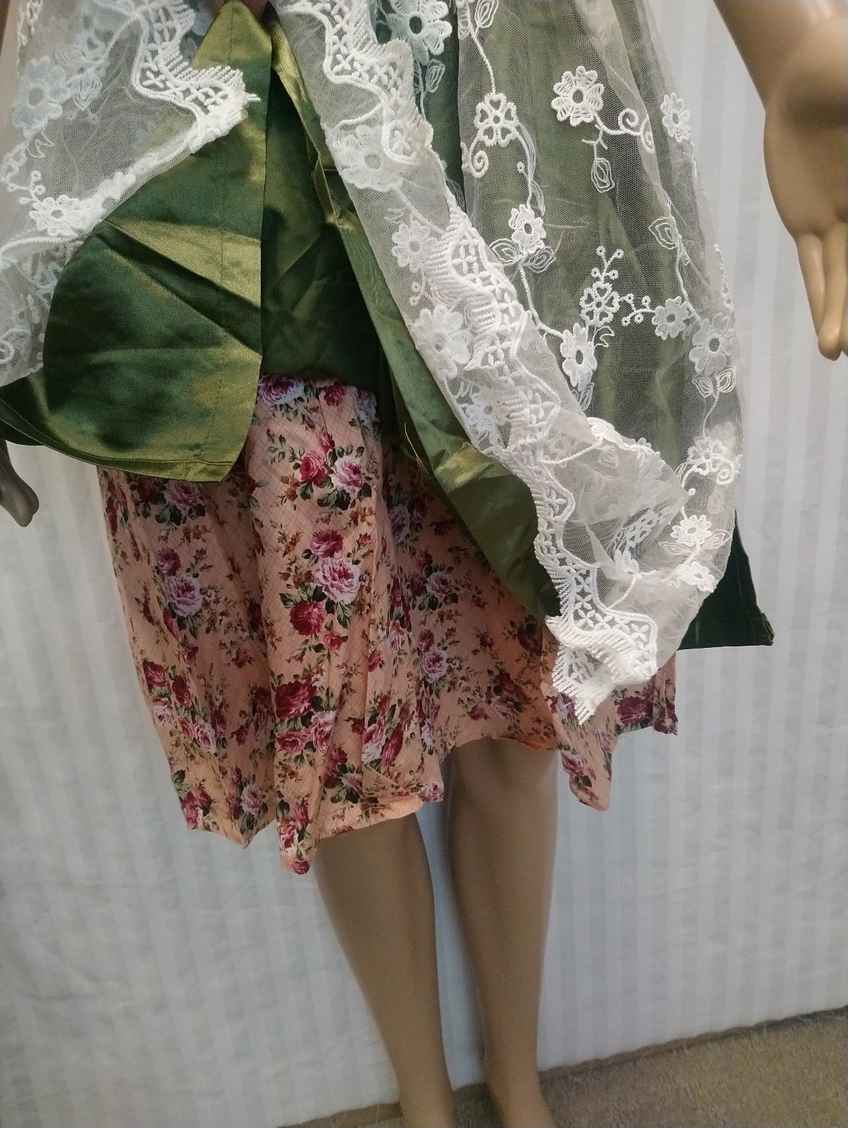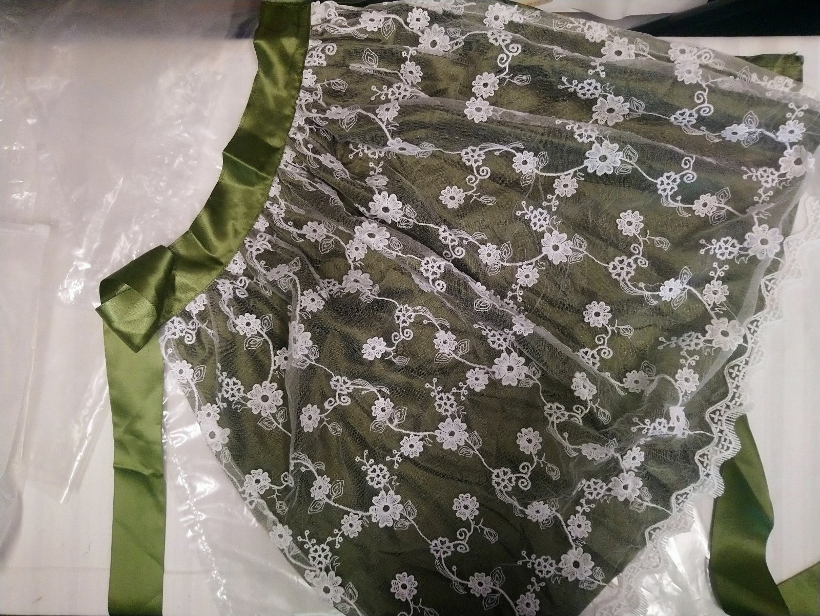 2. zelená zástera dvojvrstvá, vrchná vrstva biela čipkovaná látka,