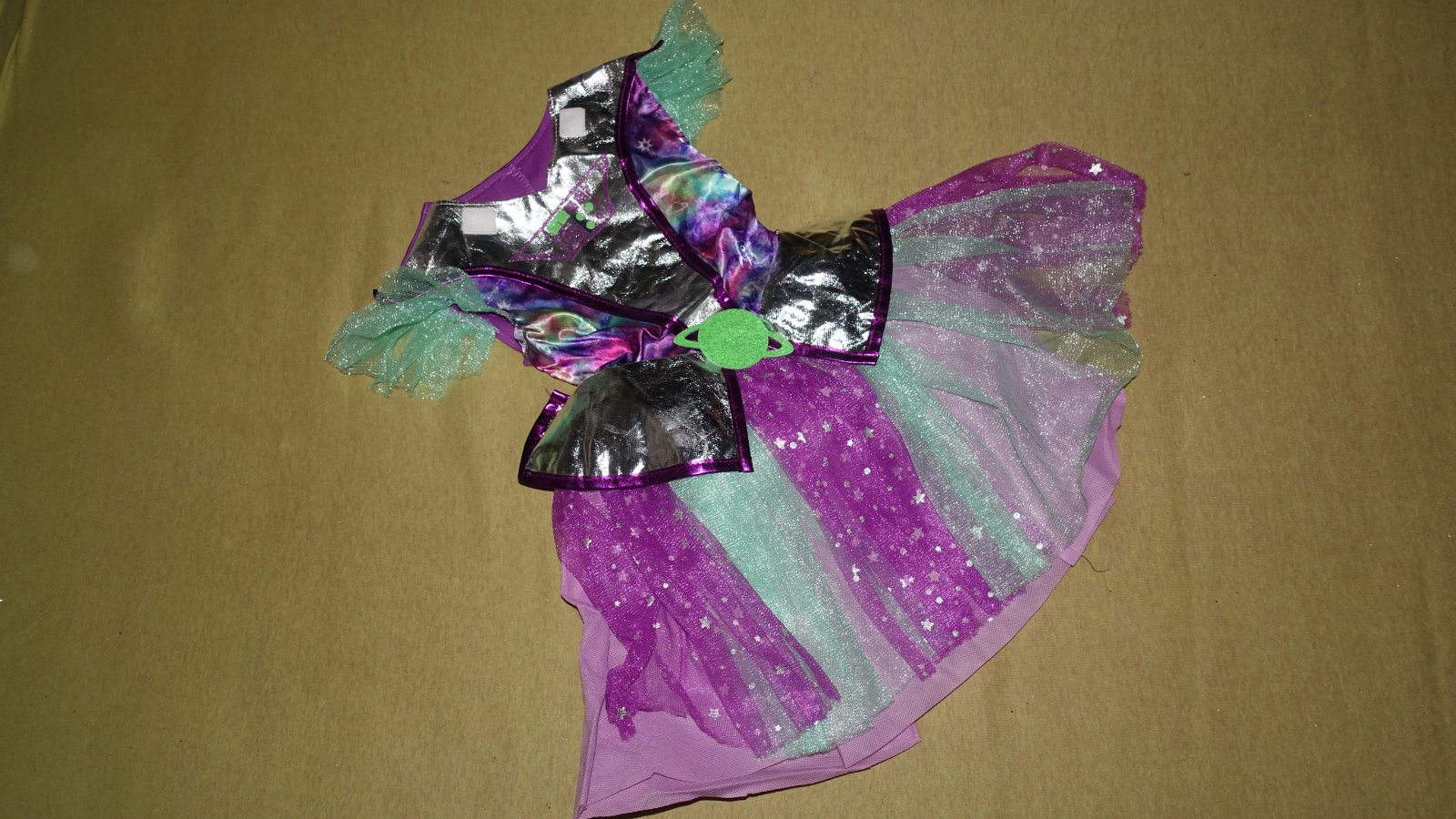 Pekny kostymcek "Adorable Alien" vo velmi dobrom stave- chyba vlecka (ostali po nej suche zipsy na pleciach). Velkost je uvedena na 3-4roky.
