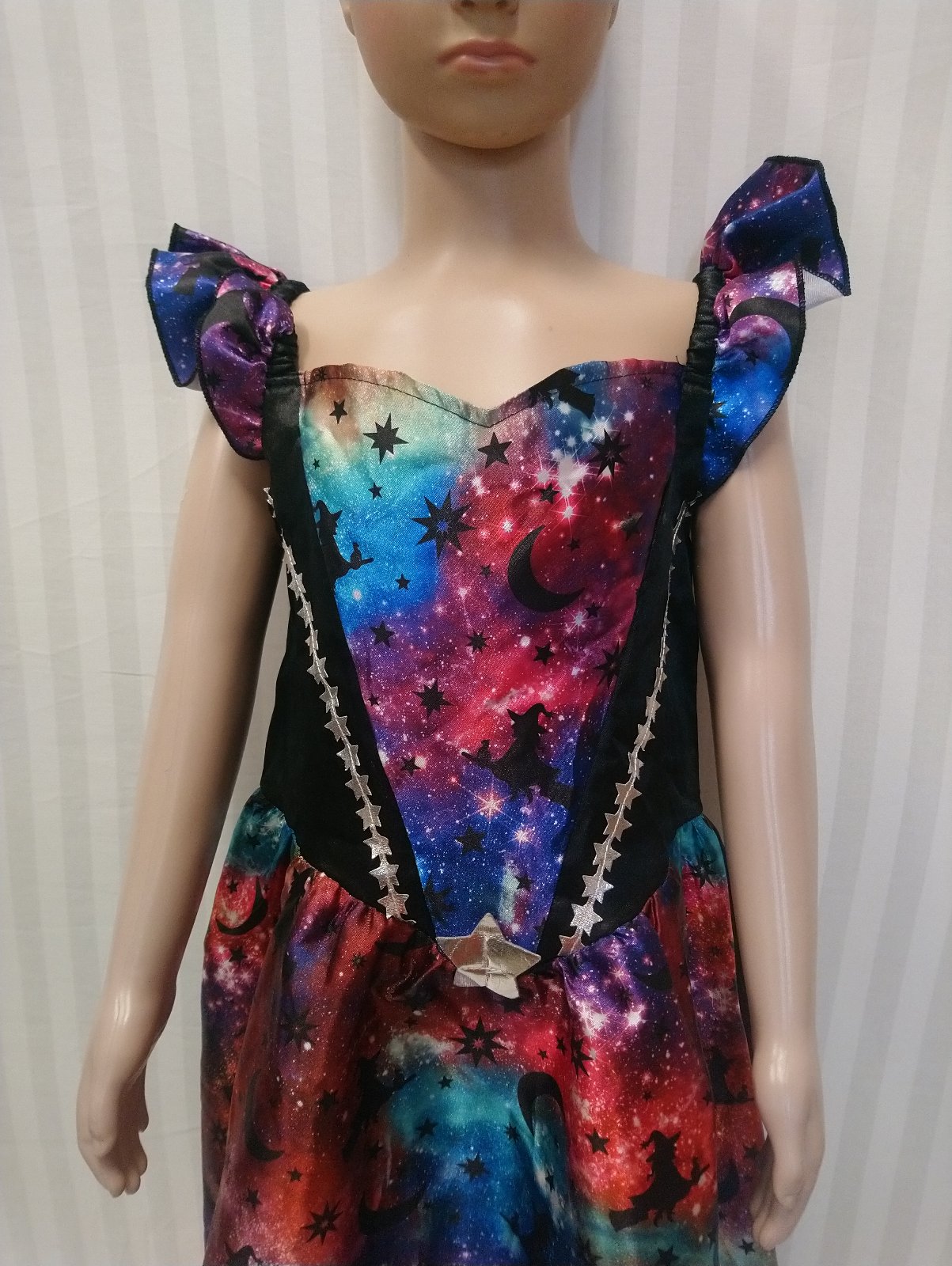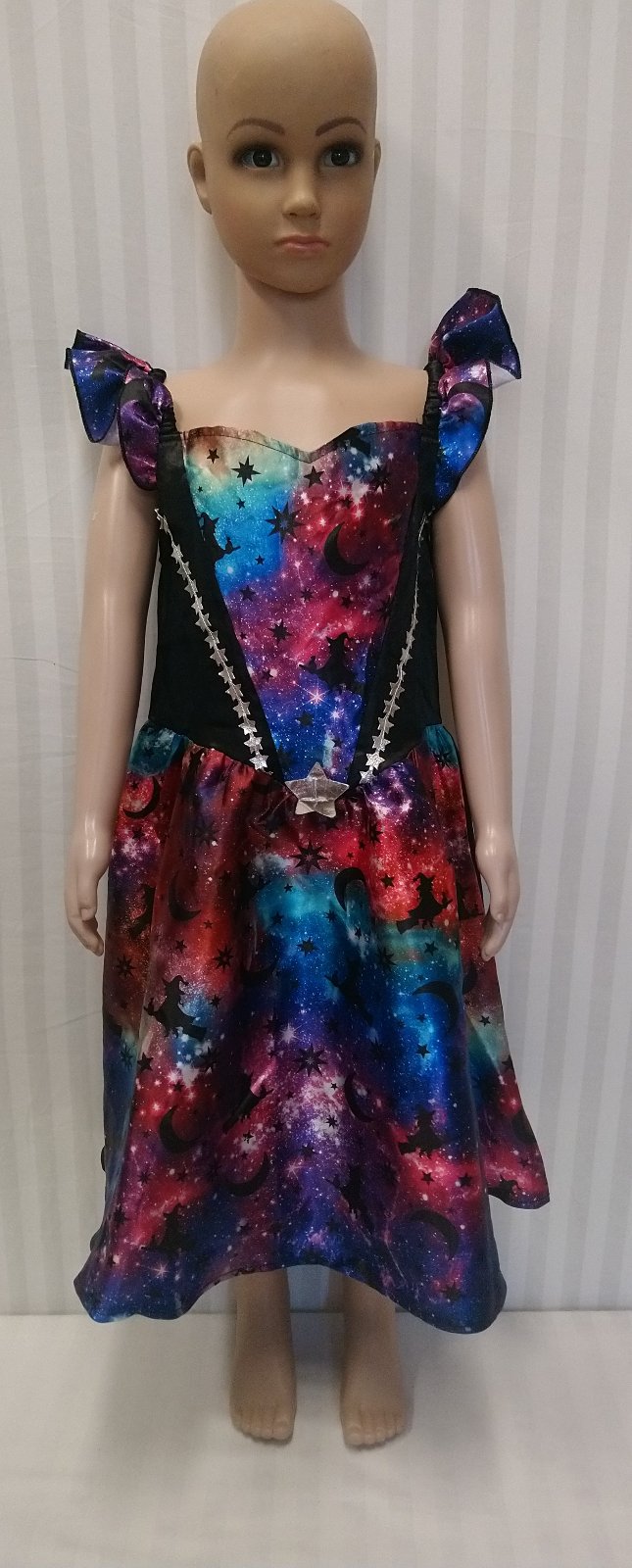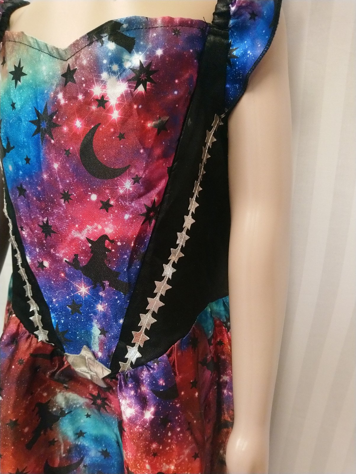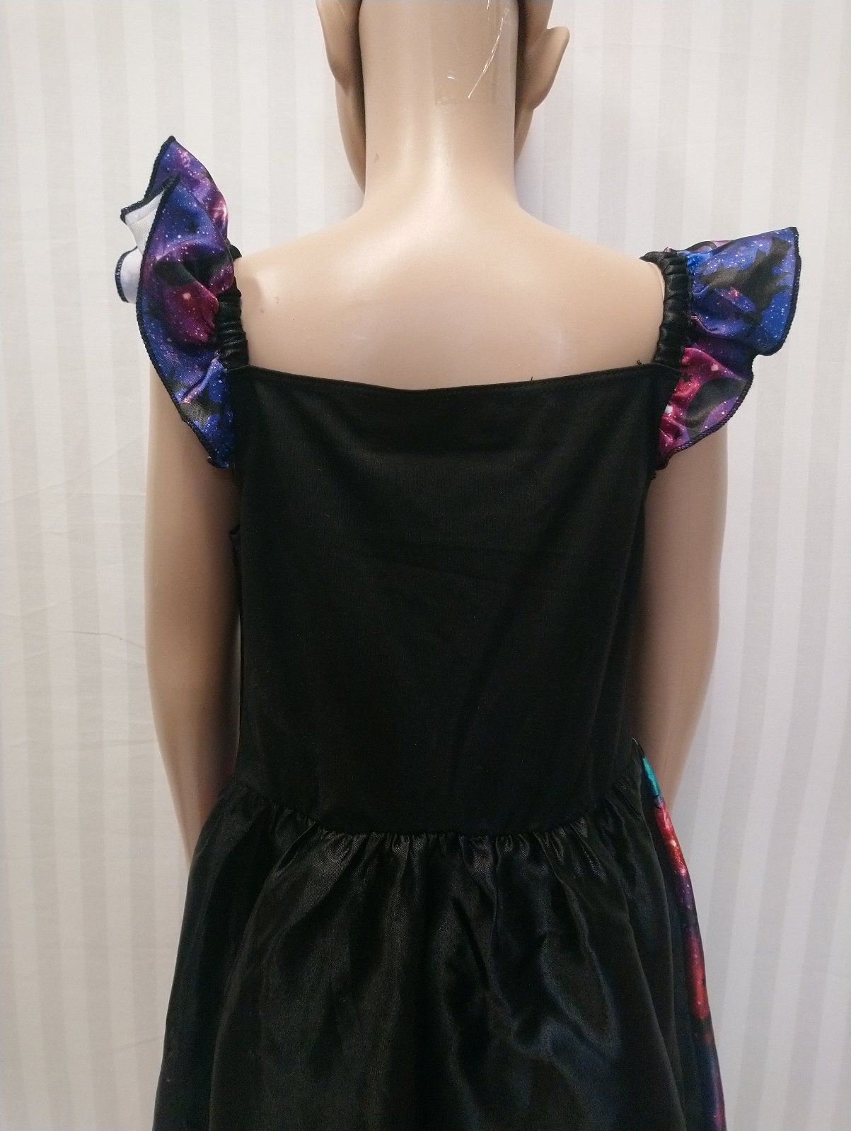 1. šaty na ramienka, vzadu čierne, vpredu motív galaxia, vpredu horná časť ozdobená striebornými hviezdičkami,