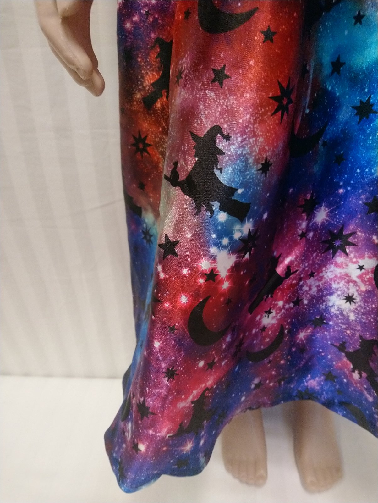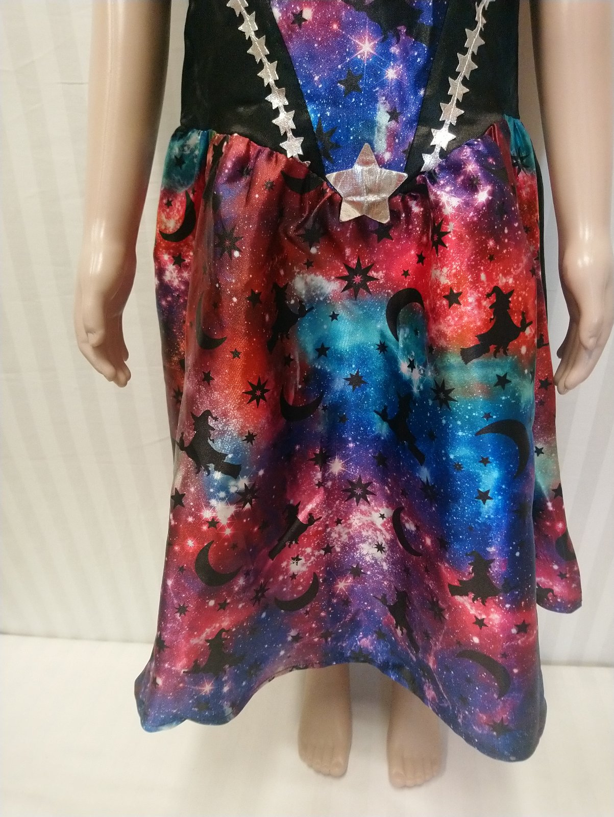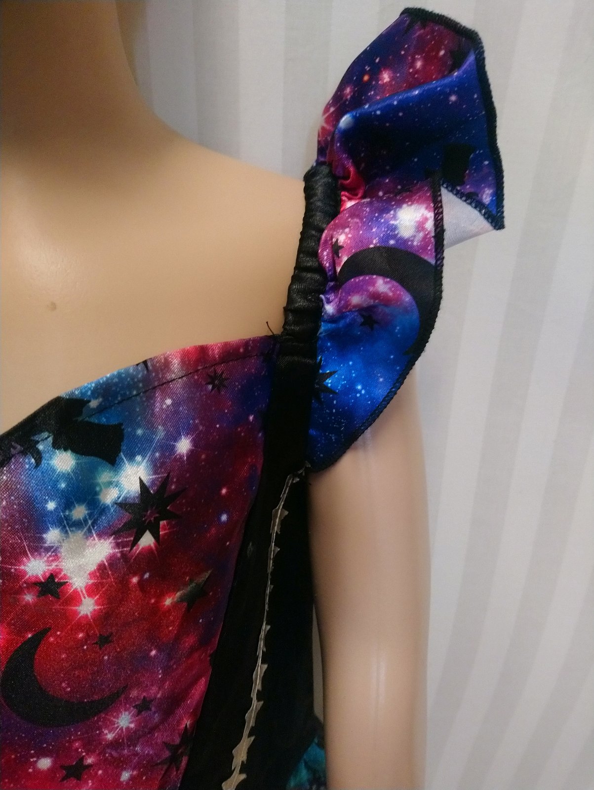 1. šaty na ramienka, vzadu čierne, vpredu motív galaxia, vpredu horná časť ozdobená striebornými hviezdičkami,