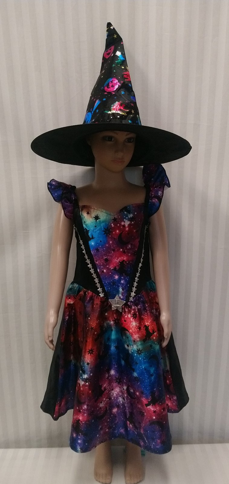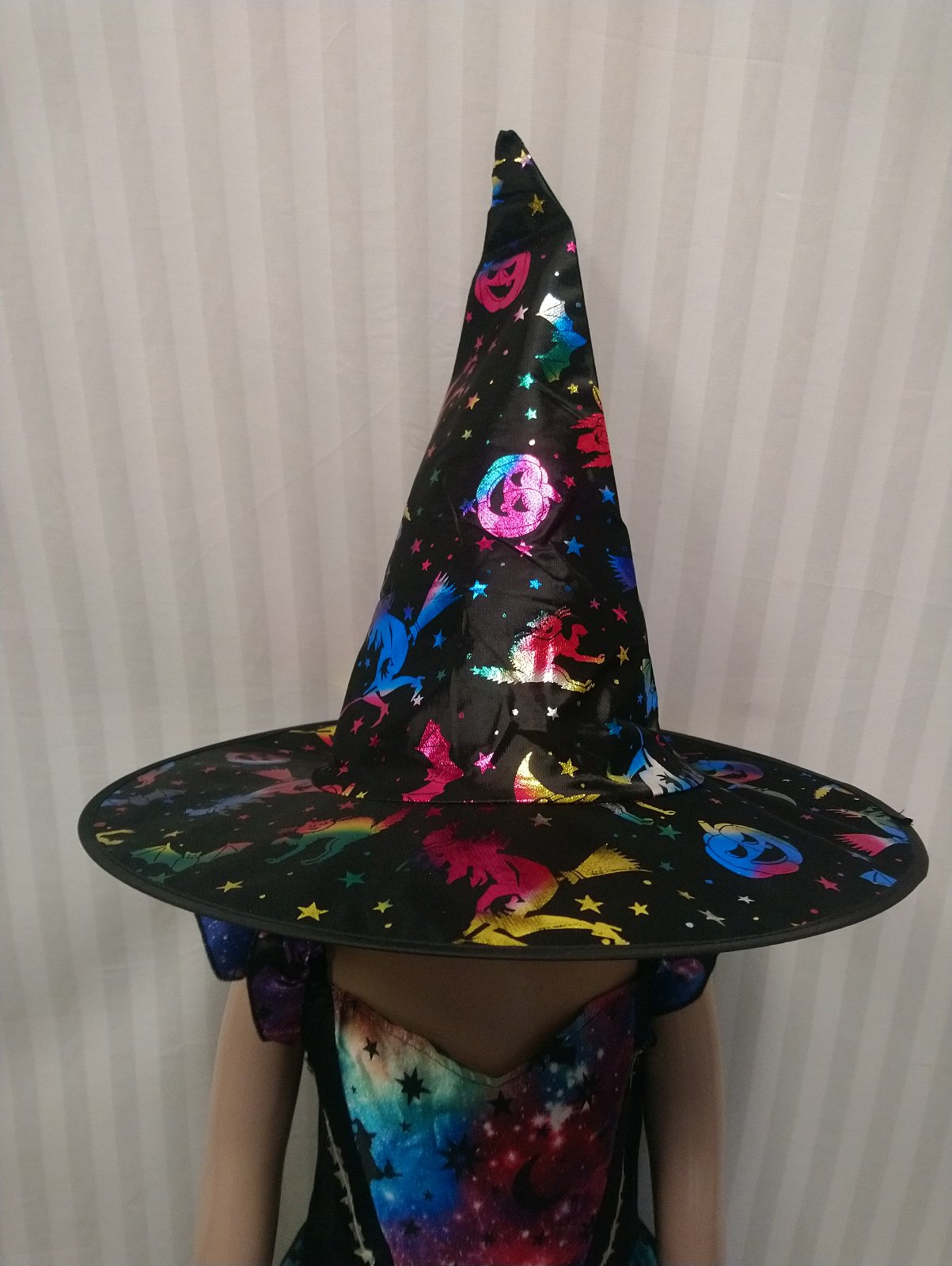 2. špicatý čarodejnícky klobúk, podklad čierny s pestrofarebným motívom,