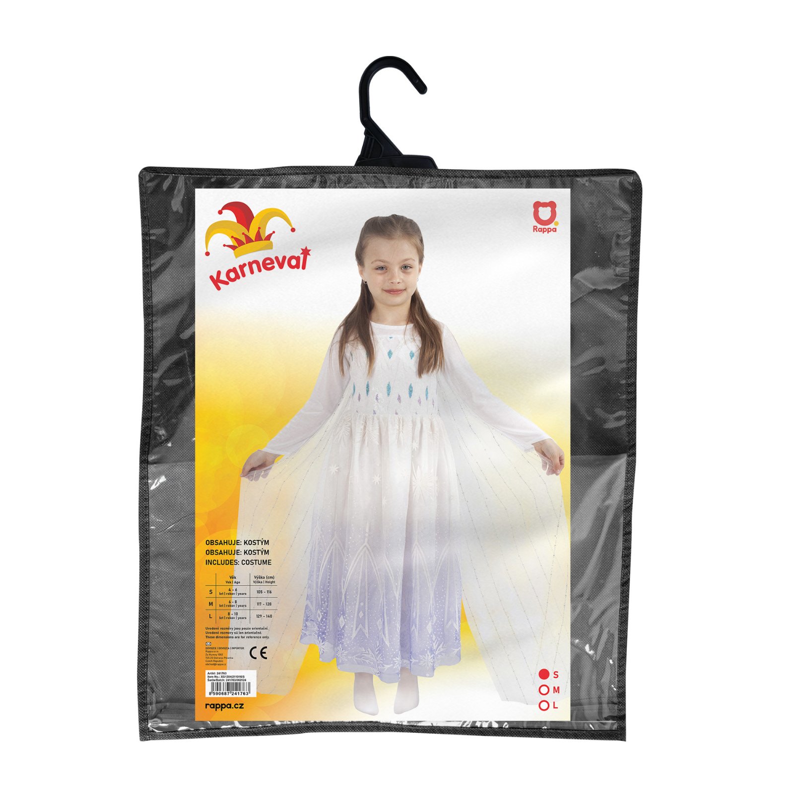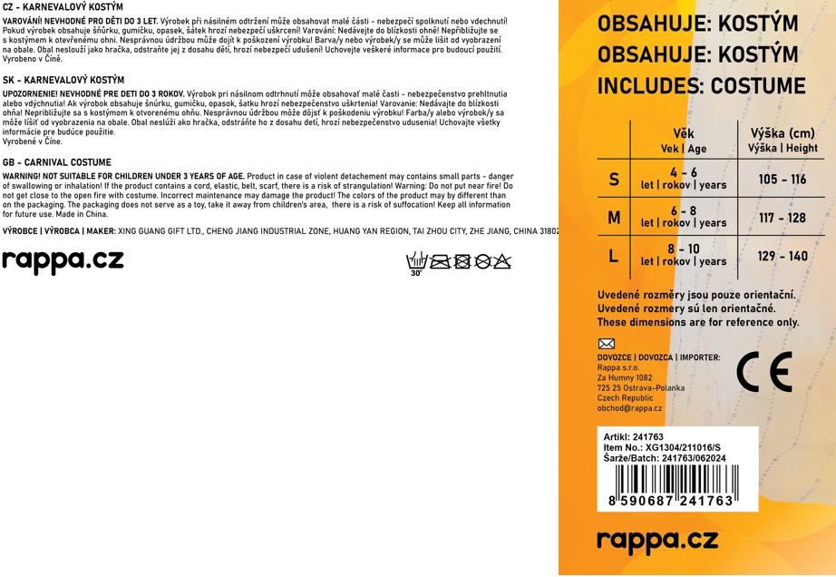 Kostým vo veľkosti S je určený pre dievčatká vo vekovom rozmedzí 4-6 rokov (105-116 cm).