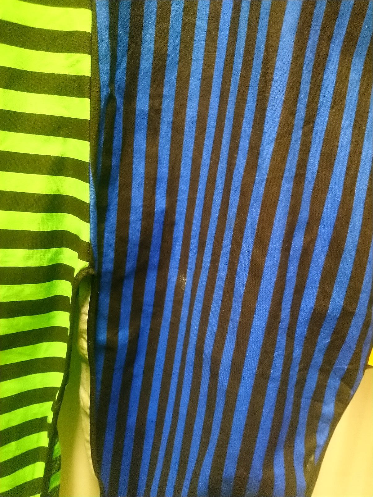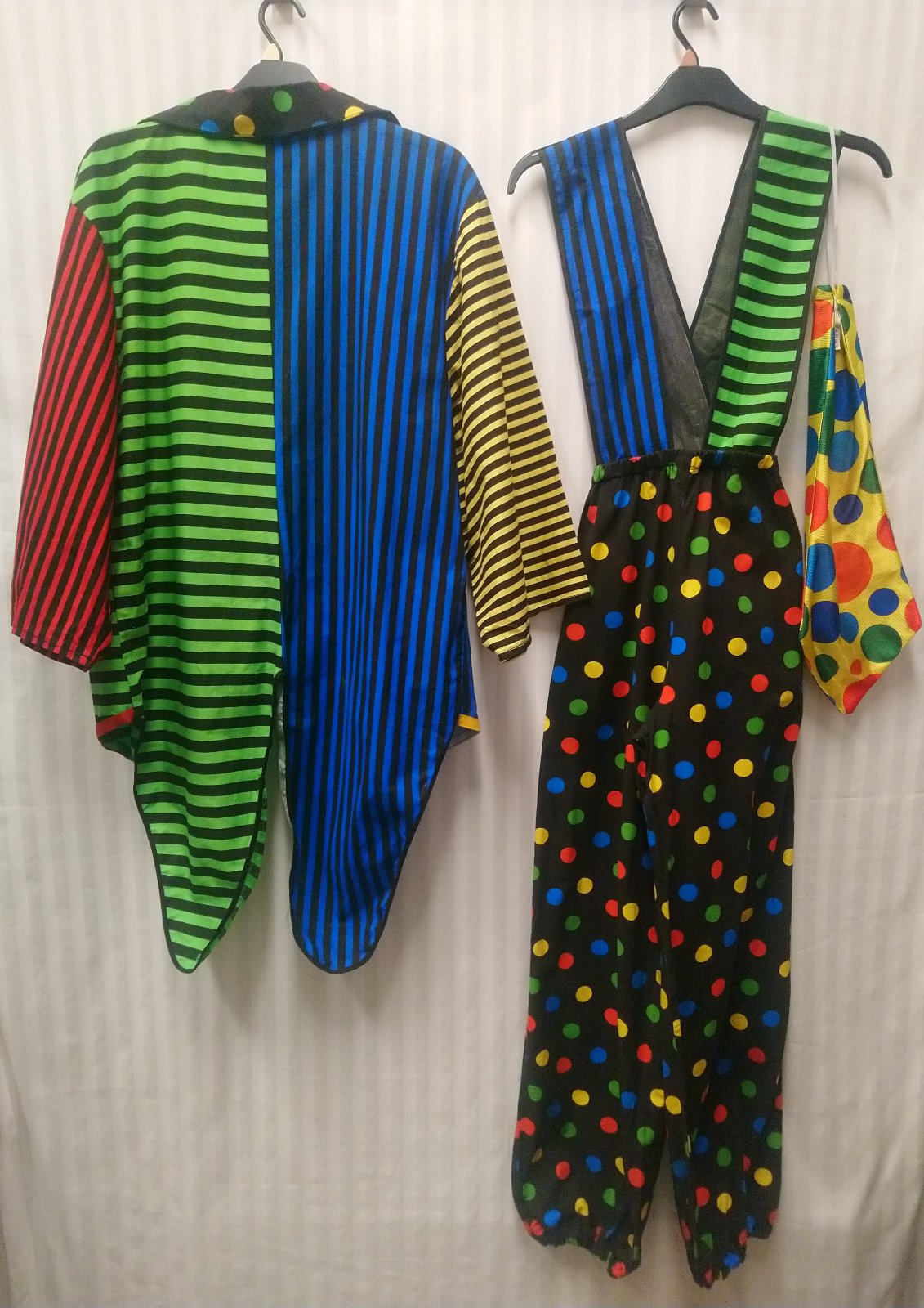 2. klaunské farebné nohavice na traky, v páse na gumu, dole nohavice zakončené do gumičky, no bokoch hore vrecká,