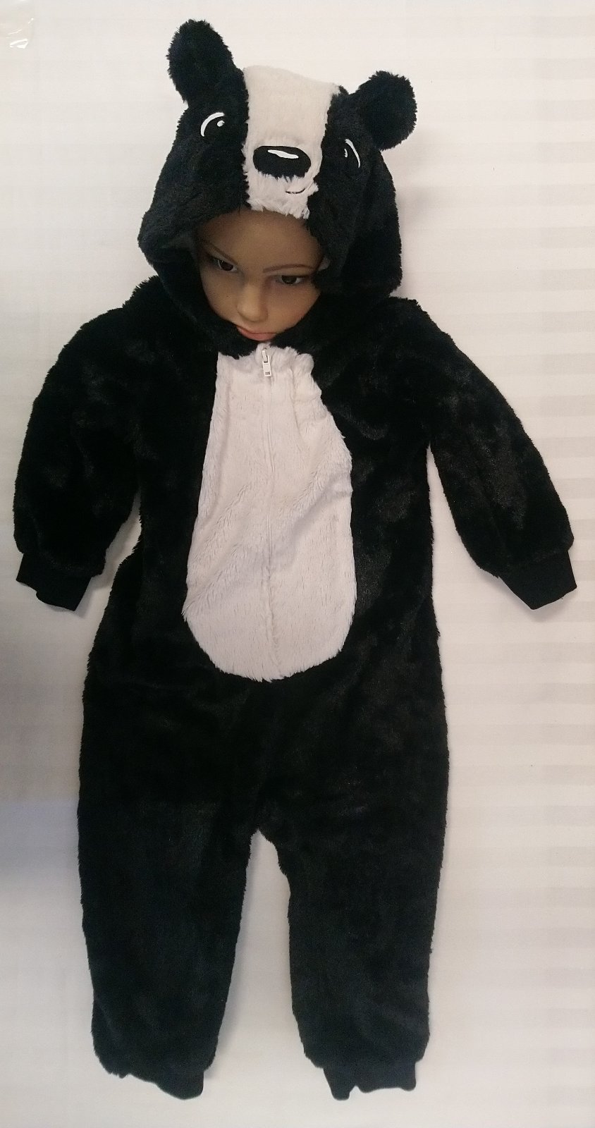 kostým fleesový overal Panda obsahuje čierno biely fleesový overal v celosti, ručičky a nožičky sú "odkryté", nožičky svetlý kruh na bruchu, overal má vpredu zapínanie na zips je podšitý tenkou látkou, je stredne hrubý,