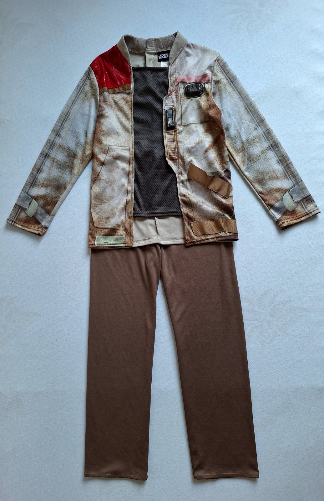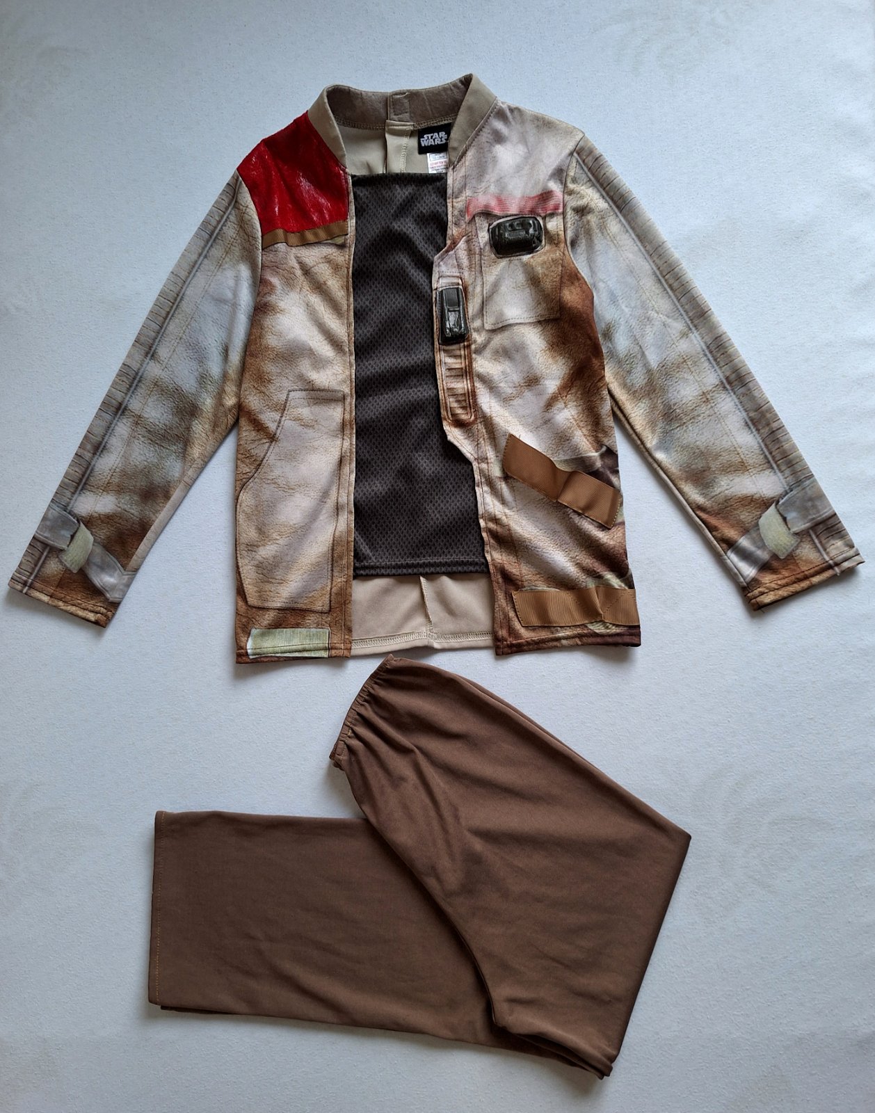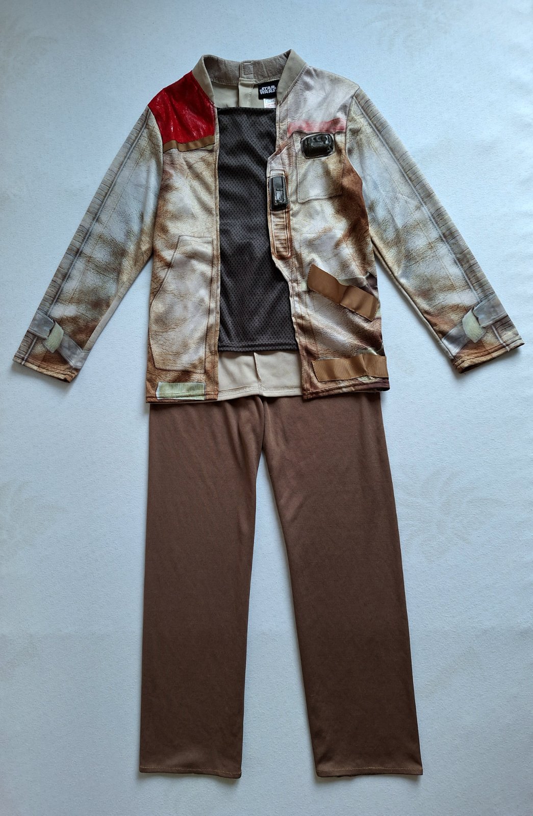 Kostým Finna z Hviezdnych vojen je v top stave, bez poškodení a známok nosenia, veľmi pekný, Pozostáva z kabátika a nohavíc v páse do gumy. Pekne elastický, prispôsobí sa. Na vrchnom diely rôzne aplikácie z pevnejšieho materiálu.