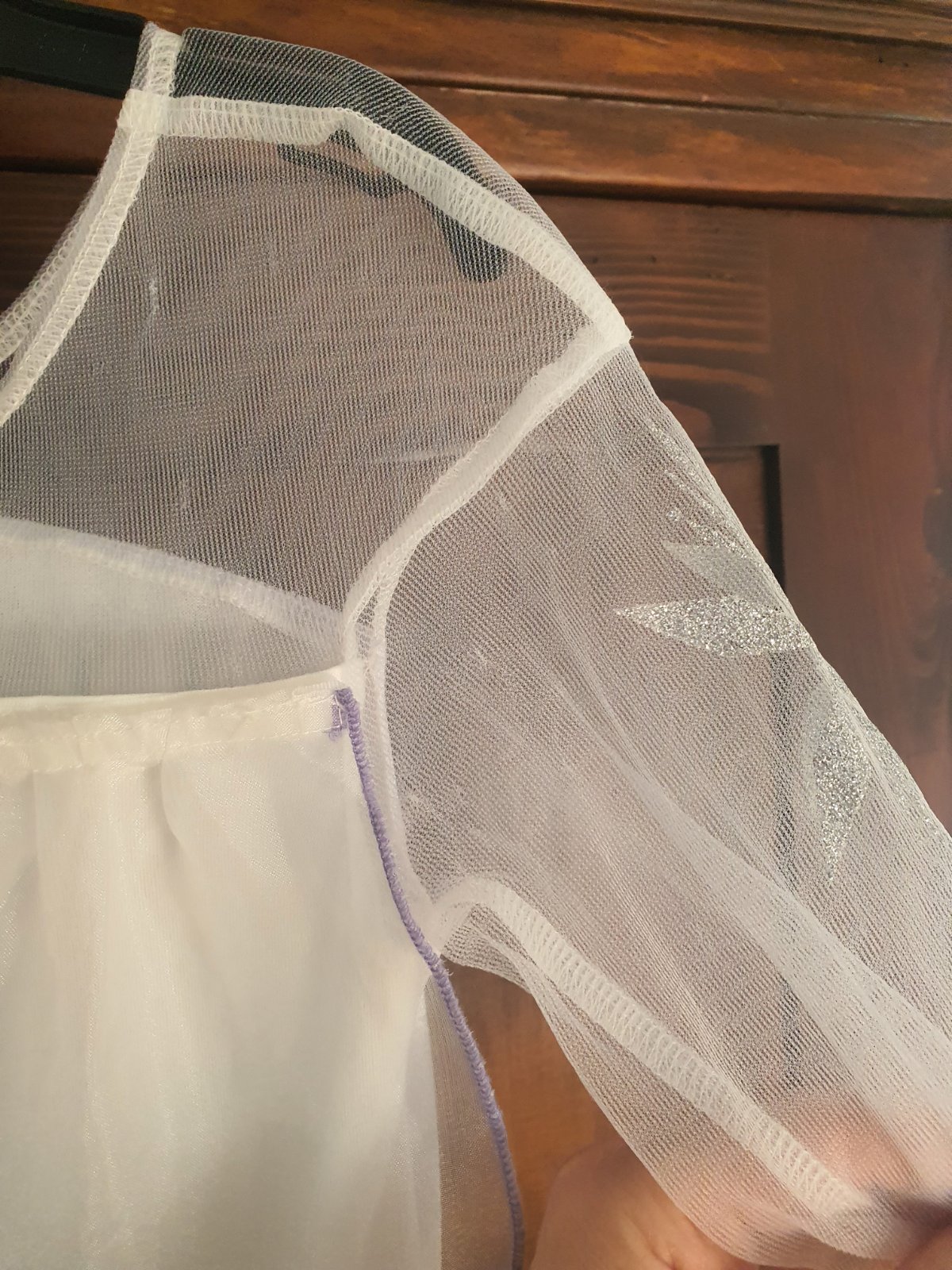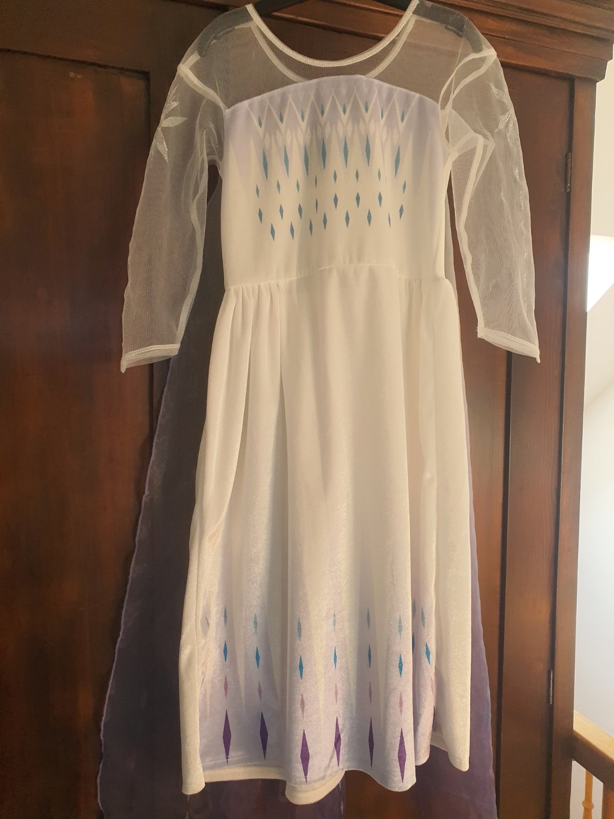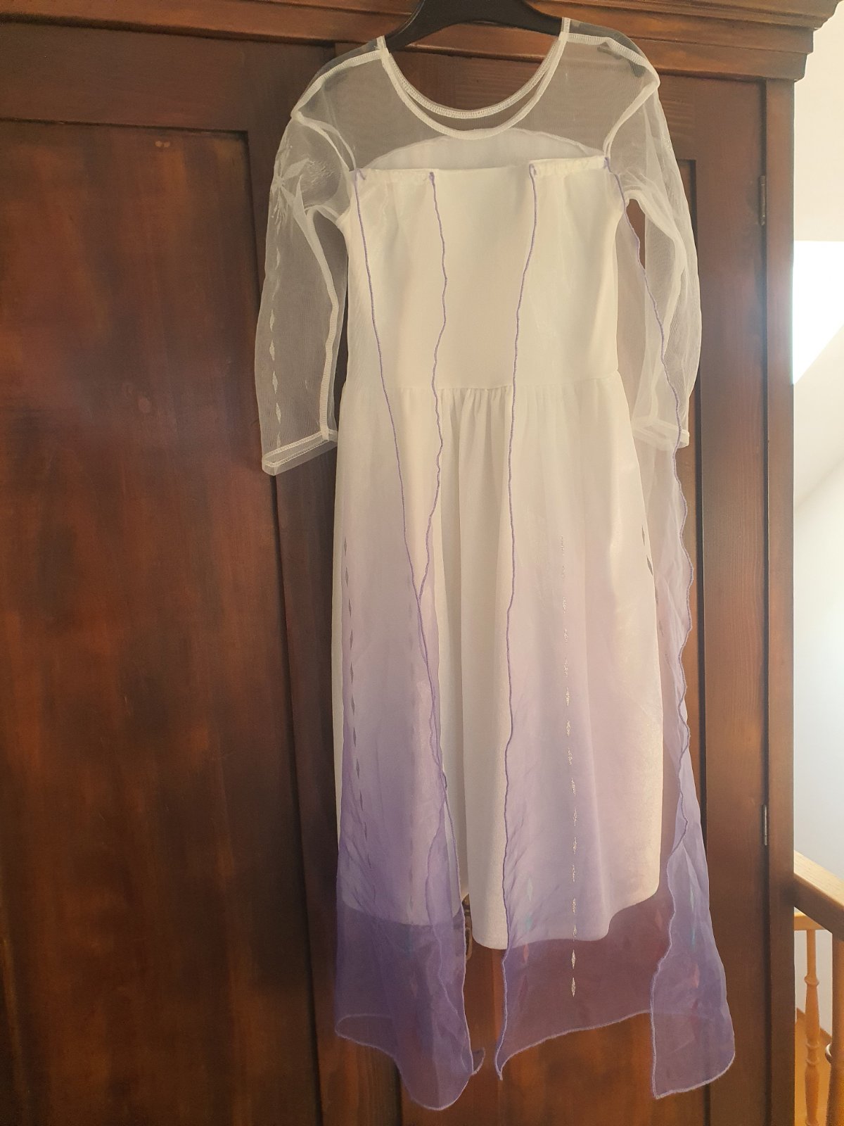 Kostým veľkosť 110/116. Pár krát oblečený. Vlečka je na suchý zips. Na rukávoch je od suchécho zipsu vytiahaná látka na pár miestach - odfotené.