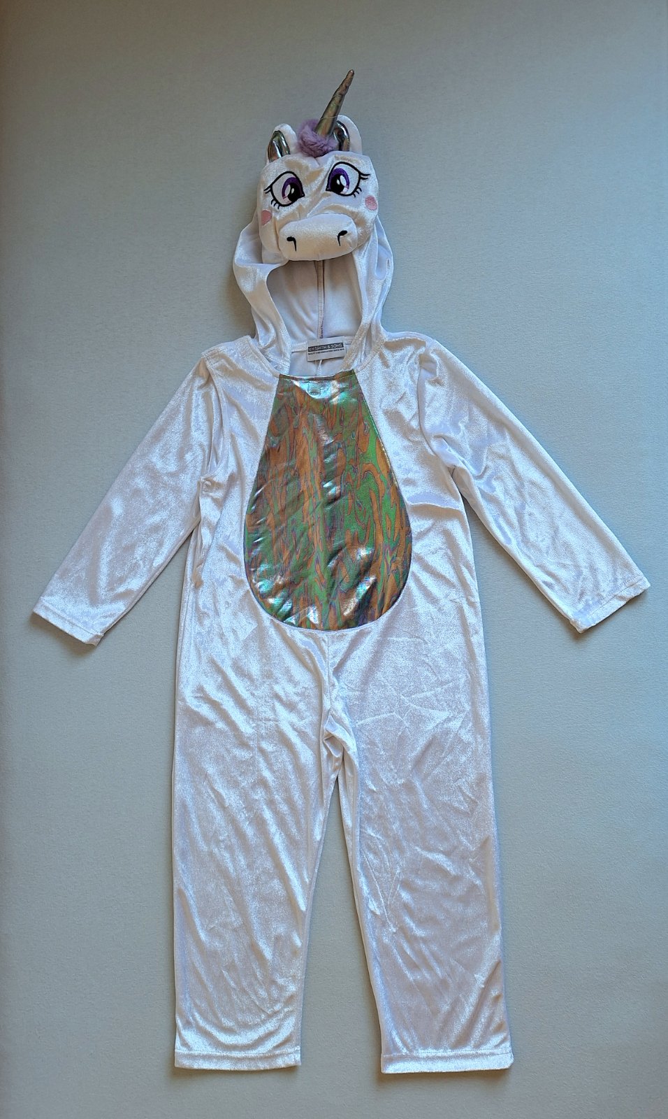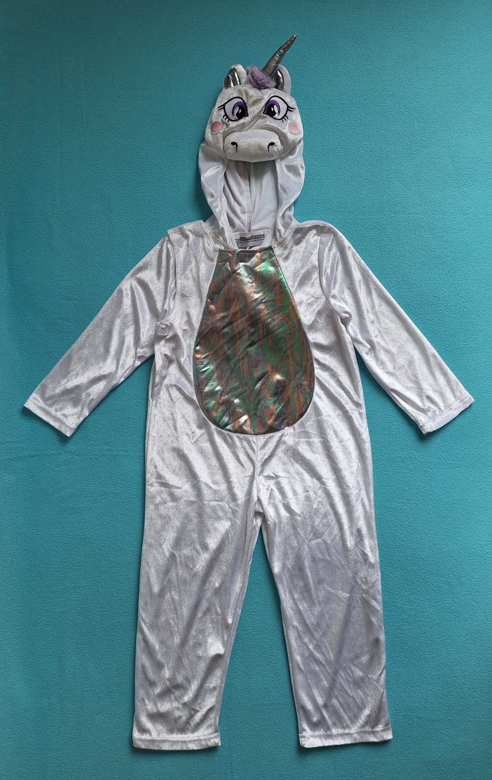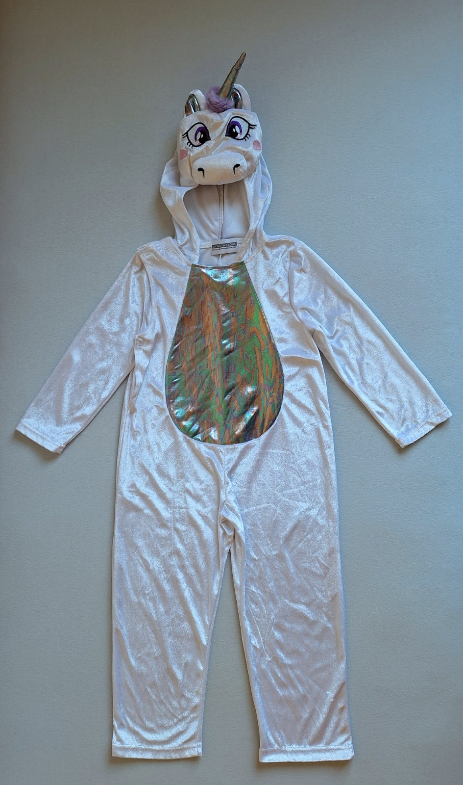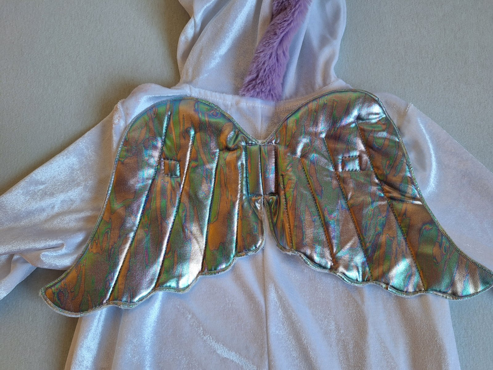 Značkový kostým je v top stave bez poškodení a známok nosenia, veľmi pekný, ako nový. Hlavička na kapucni silne vystužená, rovnako krídla na chrbte, ktoré sa upevňujú na suché zipsy. Pekne doplnený dúhovou striebornou látkou na brušku, krídlach a hlavičke. Zapínanie vpredu na suché zipsy.