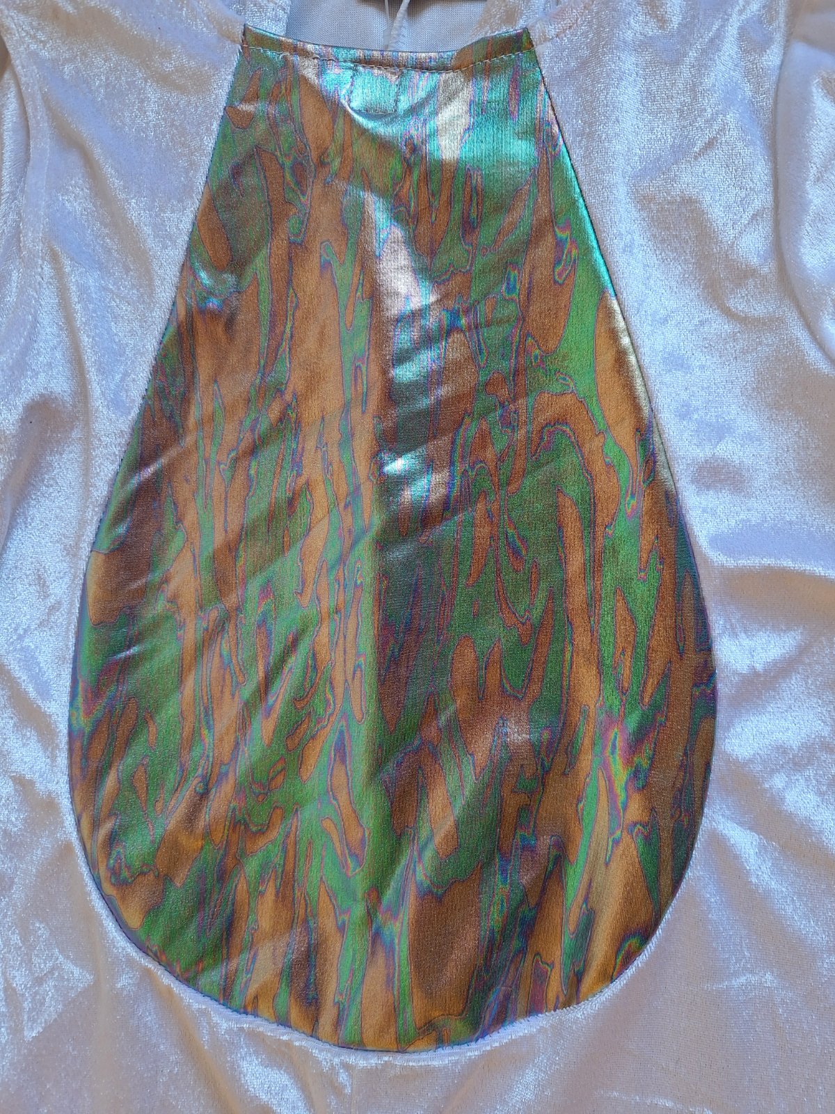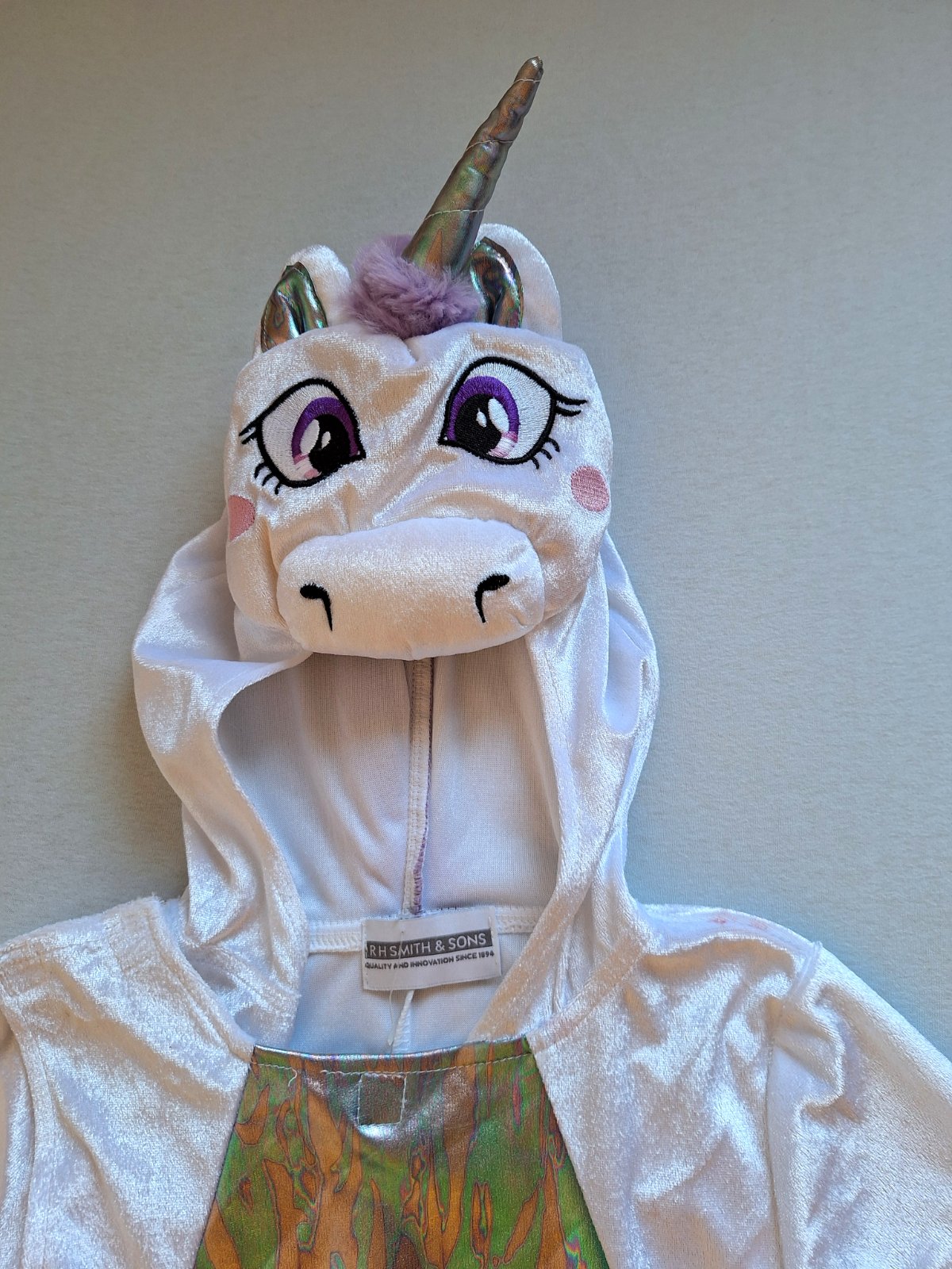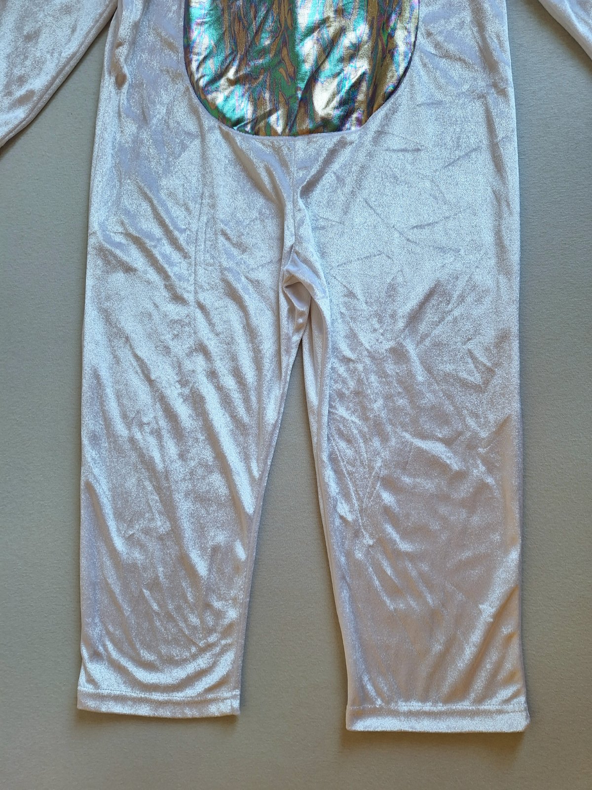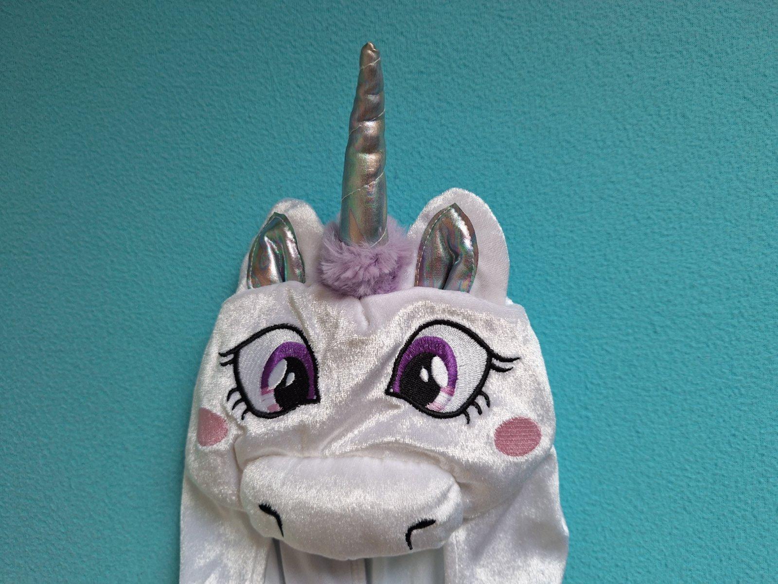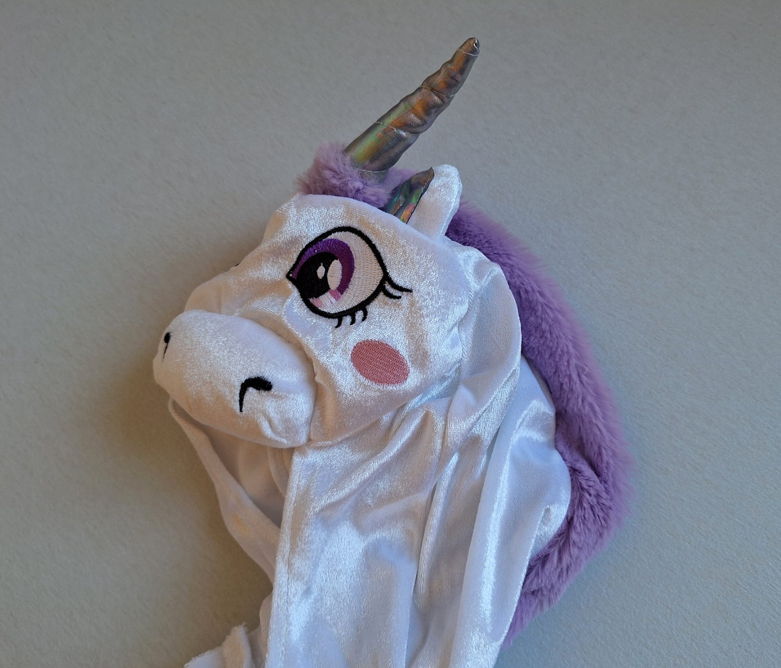 Značkový kostým je v top stave bez poškodení a známok nosenia, veľmi pekný, ako nový. Hlavička na kapucni silne vystužená, rovnako krídla na chrbte, ktoré sa upevňujú na suché zipsy. Pekne doplnený dúhovou striebornou látkou na brušku, krídlach a hlavičke. Zapínanie vpredu na suché zipsy.