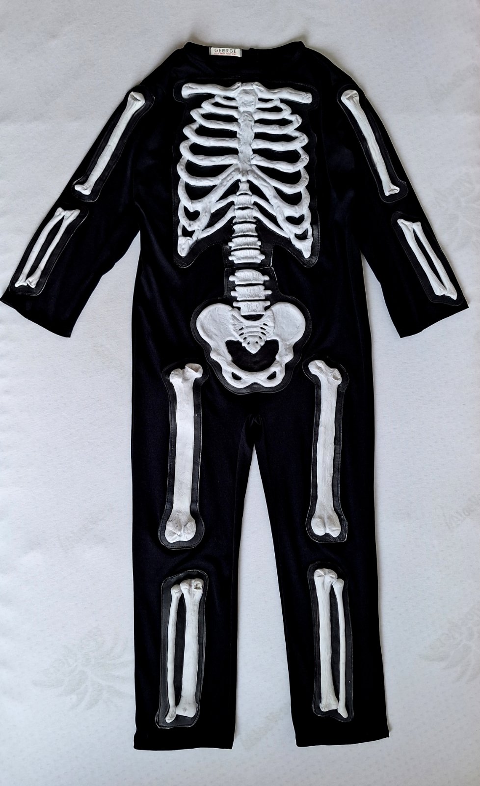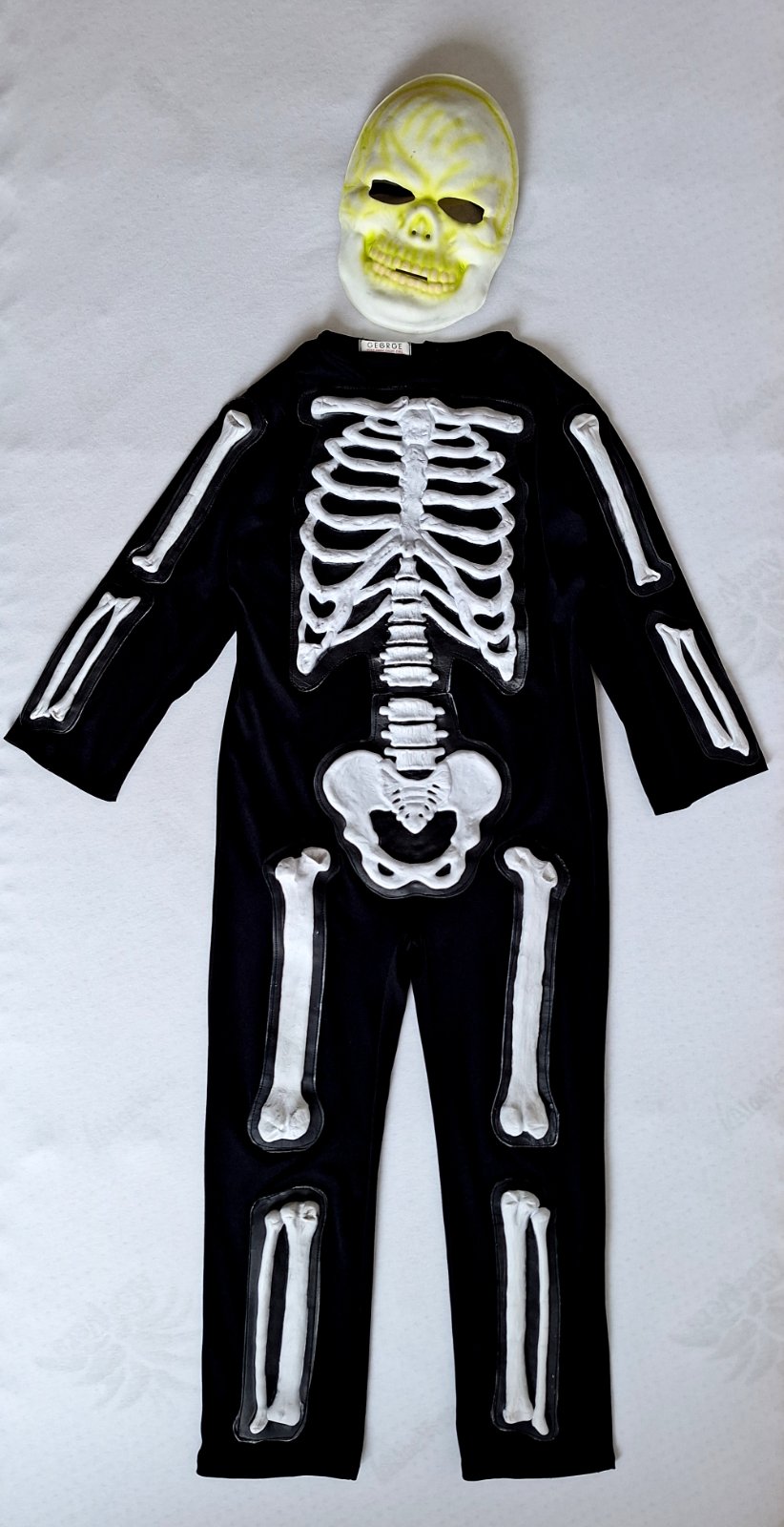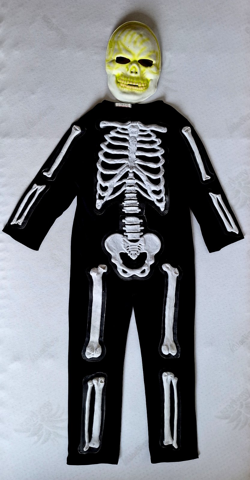 Kostým je v top stave bez poškodení, overal je celo-elastický, prispôsobí sa postave. Aplikácie kostí a lebiek sú z 3D mäkkej penovej hmoty. Maska na tvár je prichytená na hlave gumičkou. Zapínanie vzadu na 3 suché zipsy.