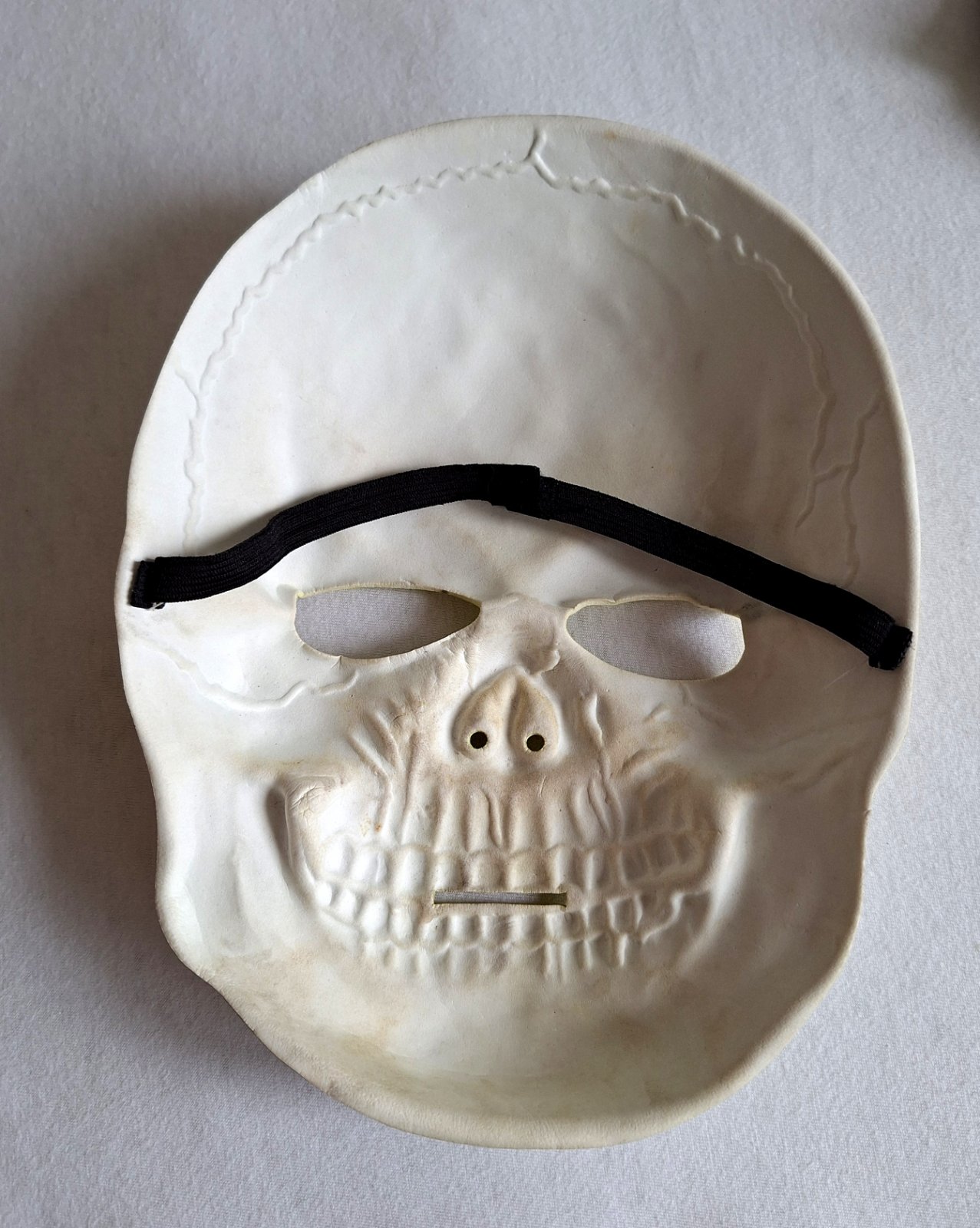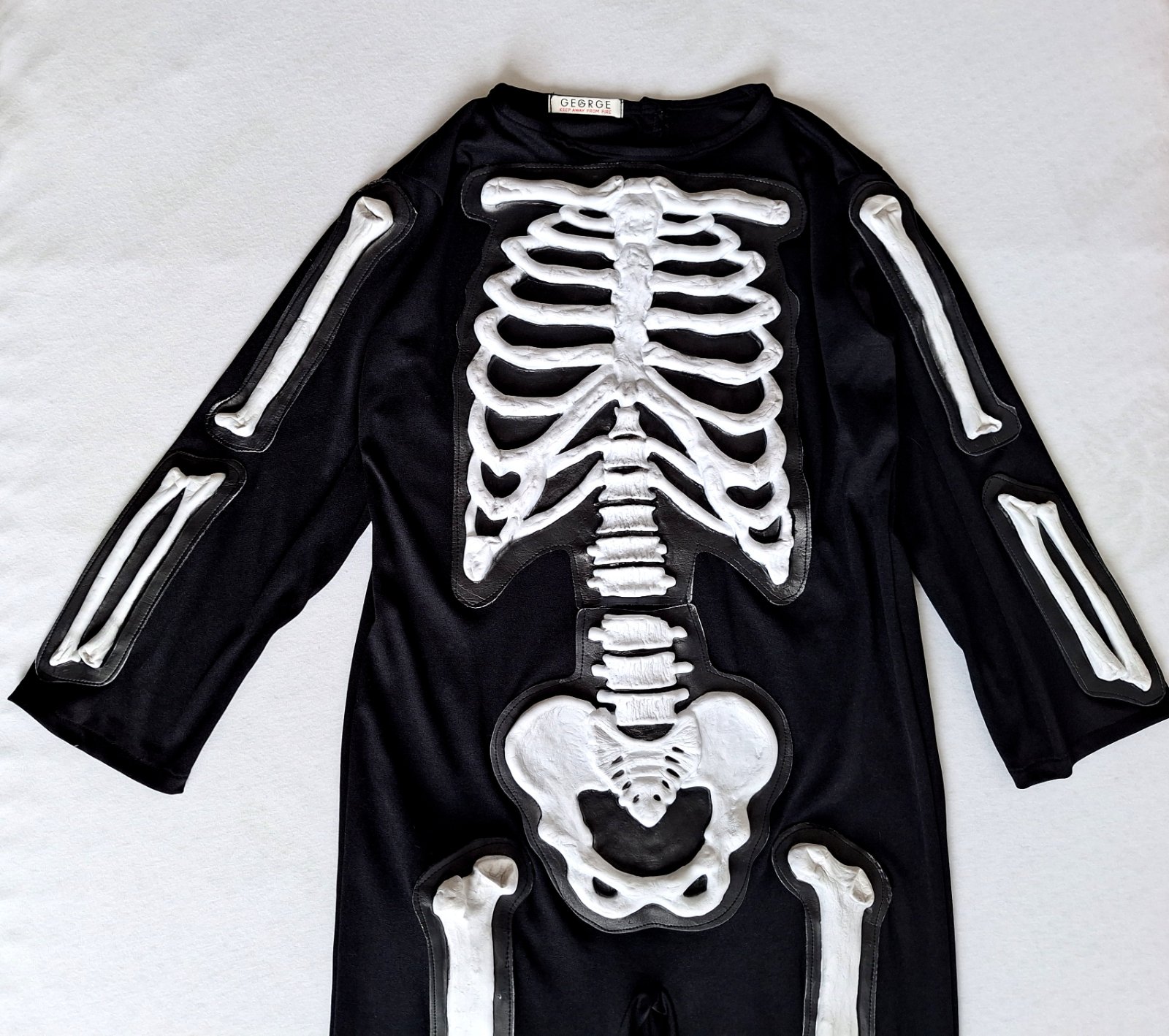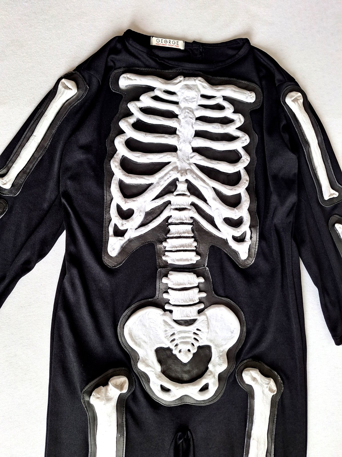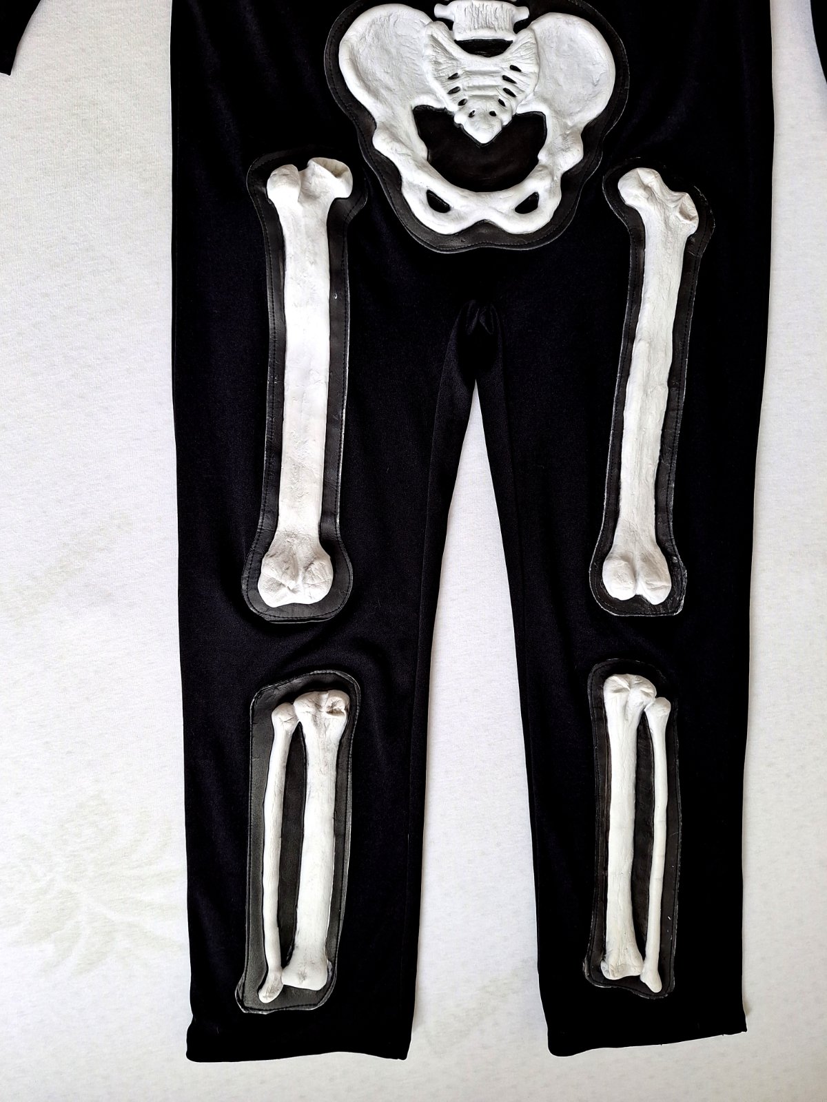 Kostým je v top stave bez poškodení, overal je celo-elastický, prispôsobí sa postave. Aplikácie kostí a lebiek sú z 3D mäkkej penovej hmoty. Maska na tvár je prichytená na hlave gumičkou. Zapínanie vzadu na 3 suché zipsy.