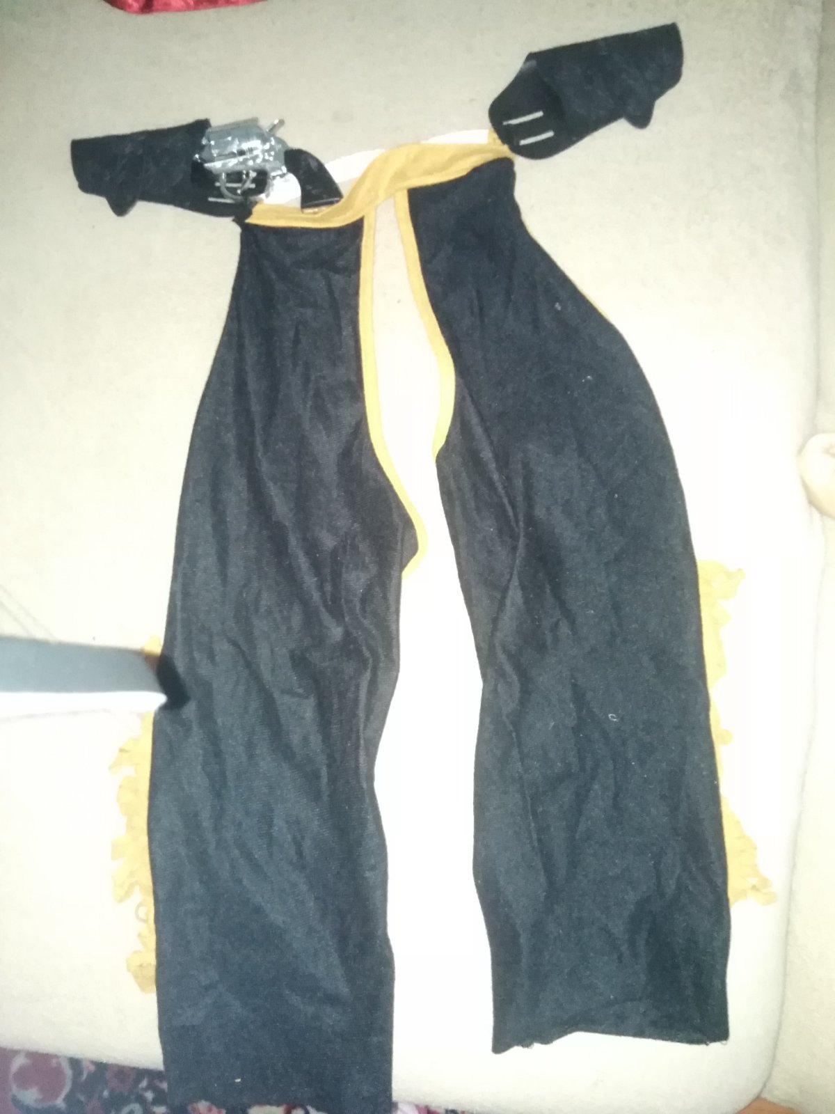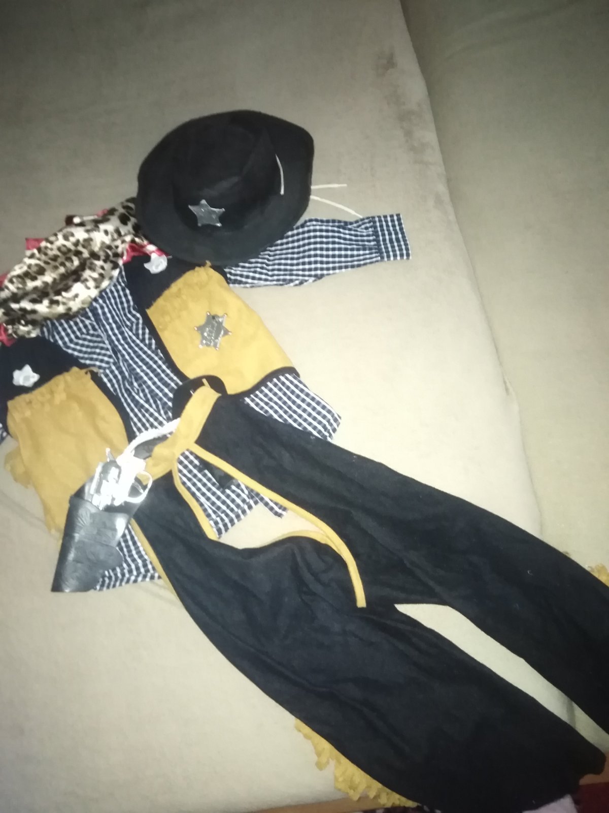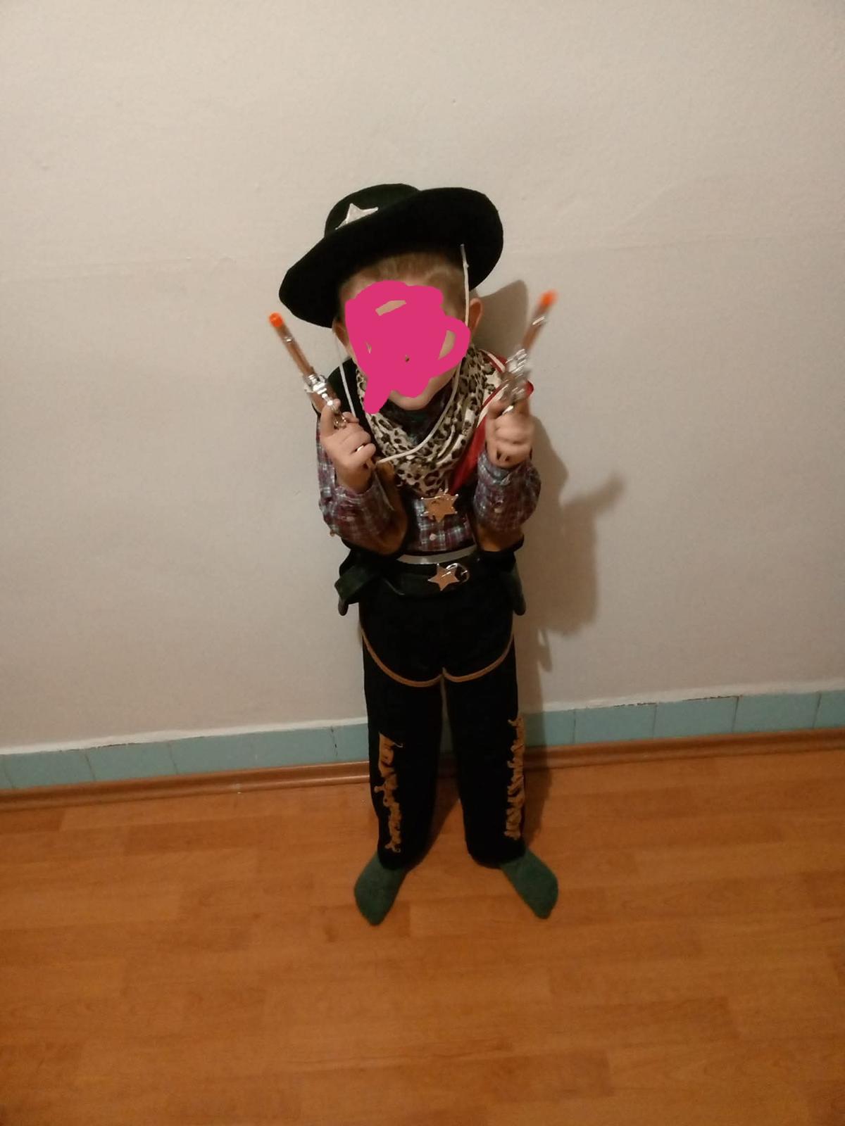 Kostým je používaný. Dosivane plastové držiaky na pištoľ. Košeľa je veľkosť 116. Ale syn mal inú.