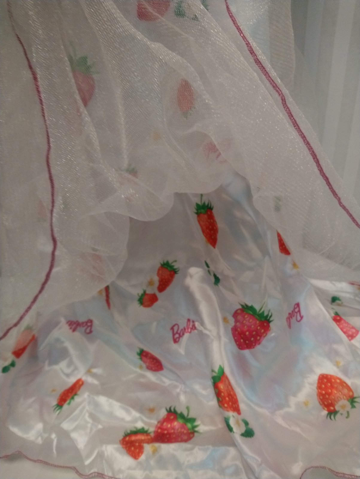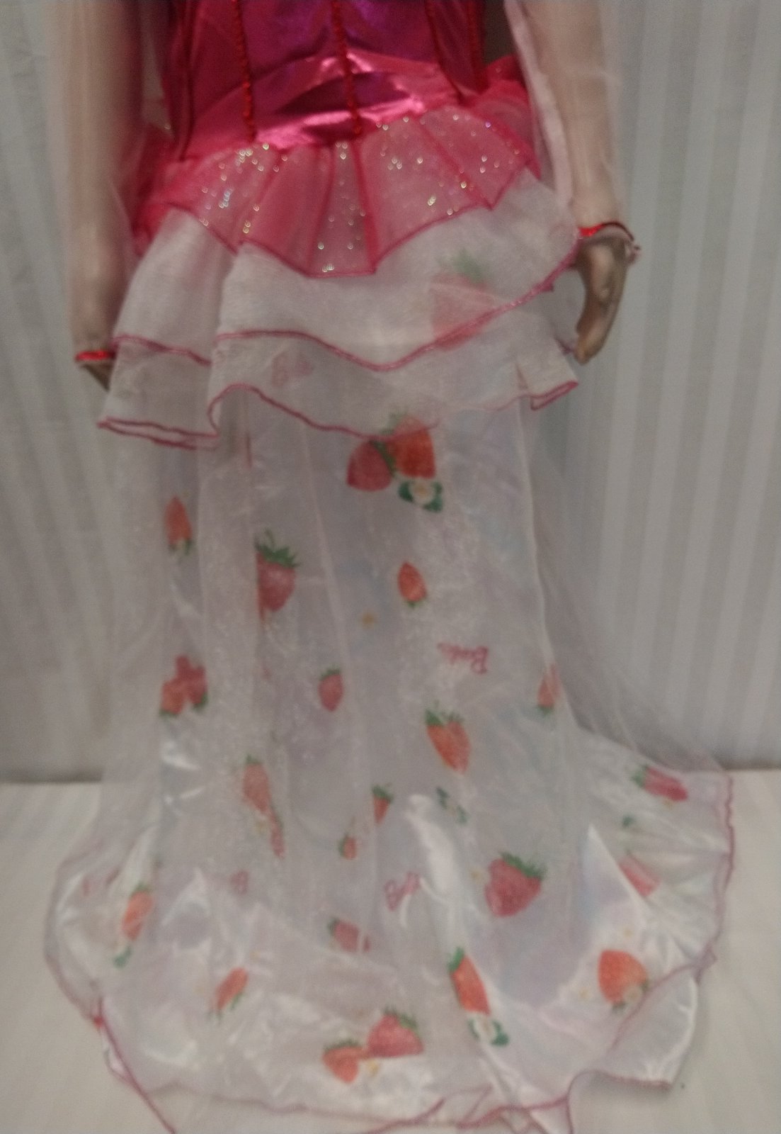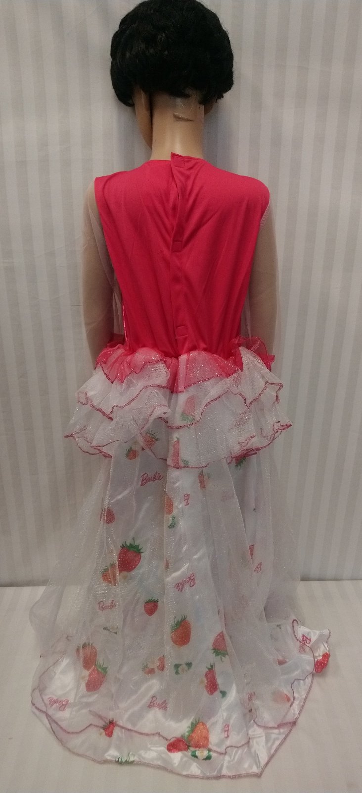 kostým Princess Barbie obsahuje jednodielne dlhé ružovo biele šaty s jahôdkovým vzorom so zapínaním suchý na zips vzadu, vzadu v páse je gumička, vrchná časť je elastická sýto ružová s priesvitnými rukávmi, ozdobená kvetmi a flitrami, dlhá dvojvrstvová sukňa, spodná látková, biela s farebným jahôdkovým vzorom a nápismi Barbie, vrchná tylová lesklá biela,