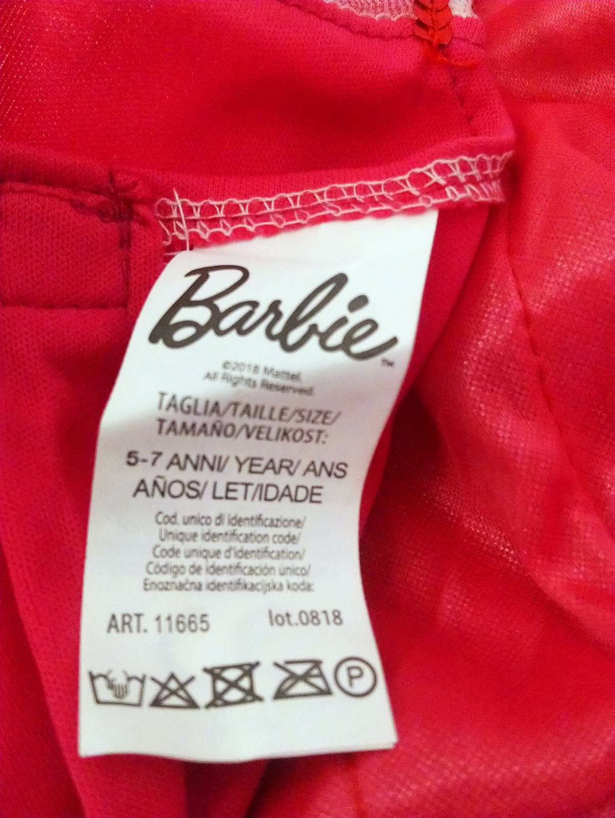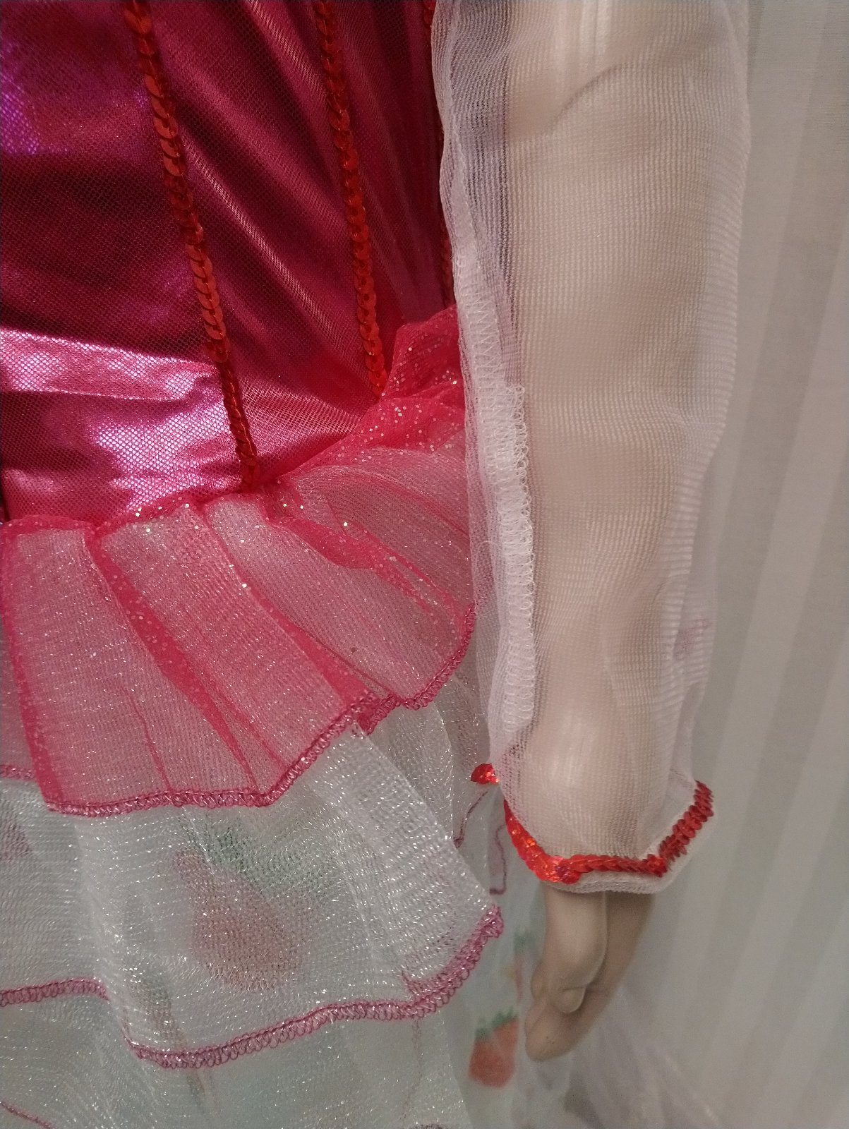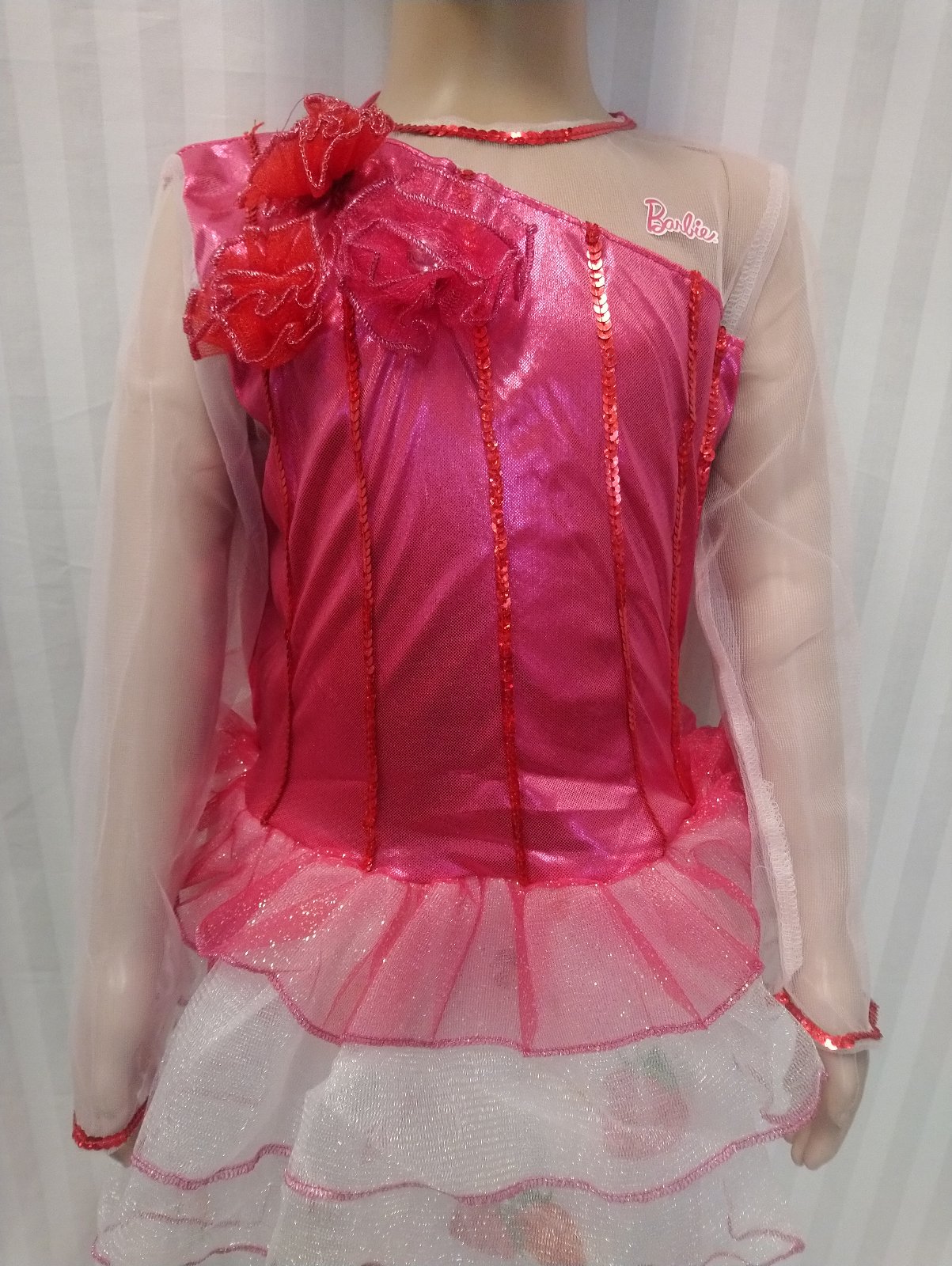 kostým Princess Barbie obsahuje jednodielne dlhé ružovo biele šaty s jahôdkovým vzorom so zapínaním suchý na zips vzadu, vzadu v páse je gumička, vrchná časť je elastická sýto ružová s priesvitnými rukávmi, ozdobená kvetmi a flitrami, dlhá dvojvrstvová sukňa, spodná látková, biela s farebným jahôdkovým vzorom a nápismi Barbie, vrchná tylová lesklá biela,