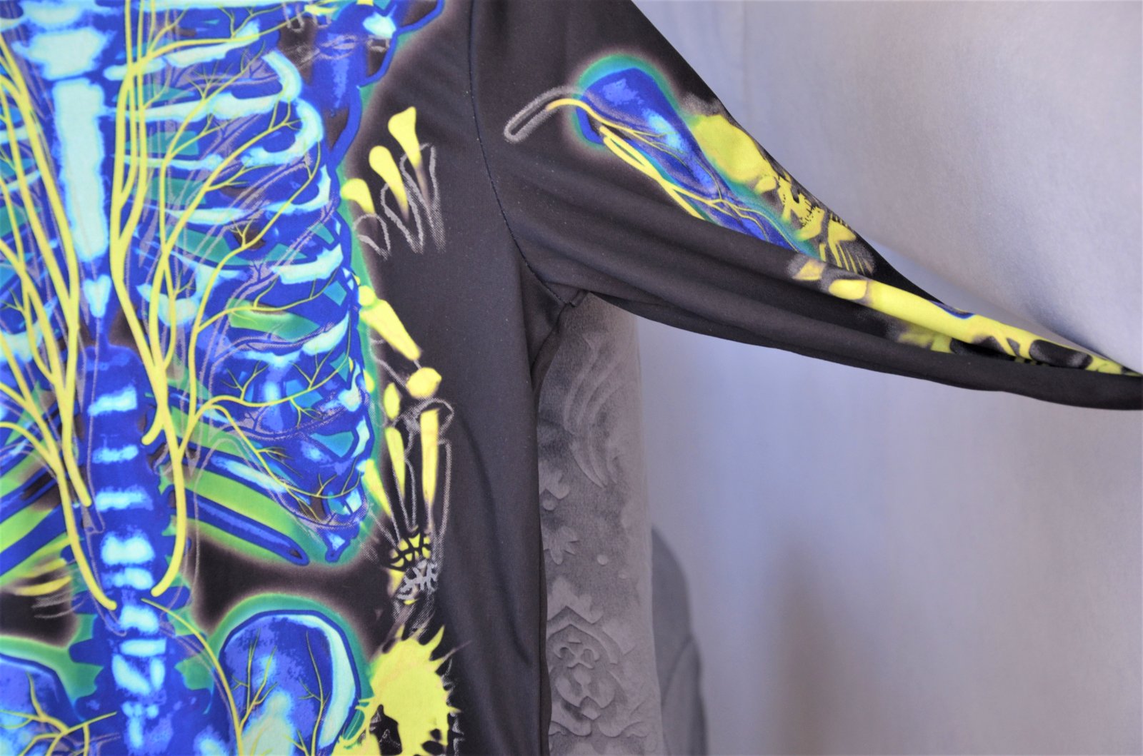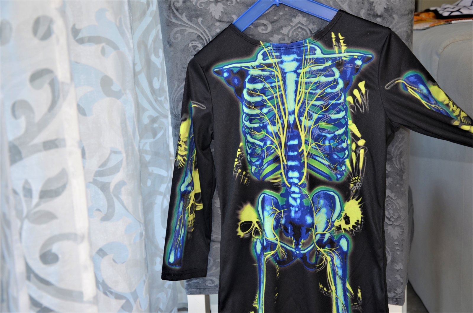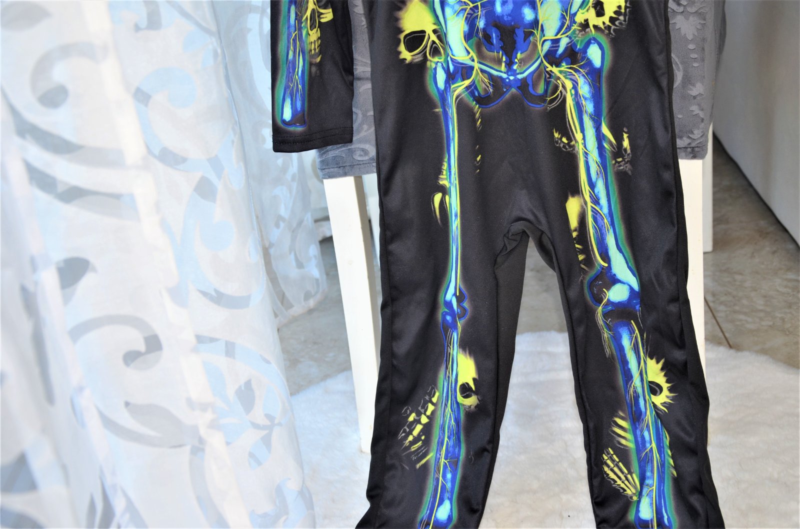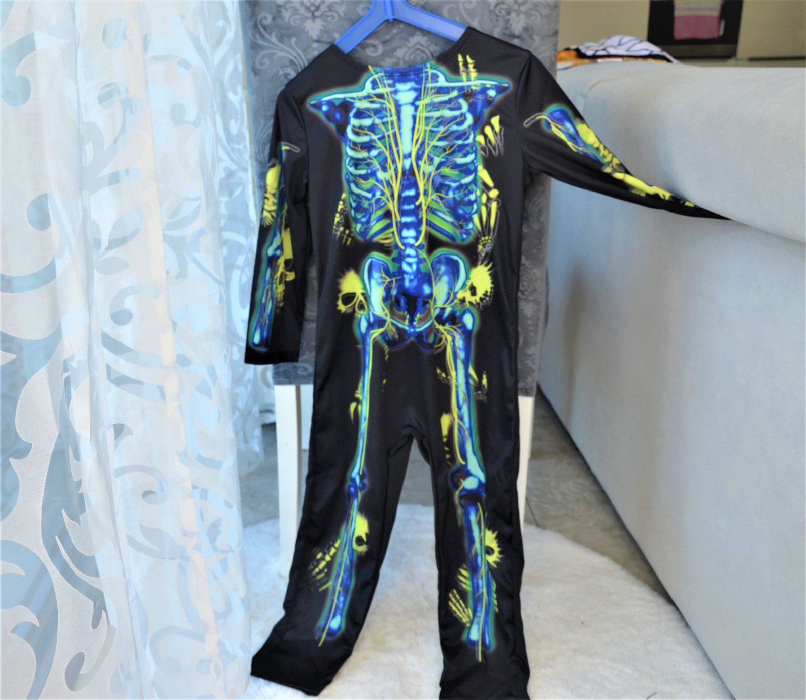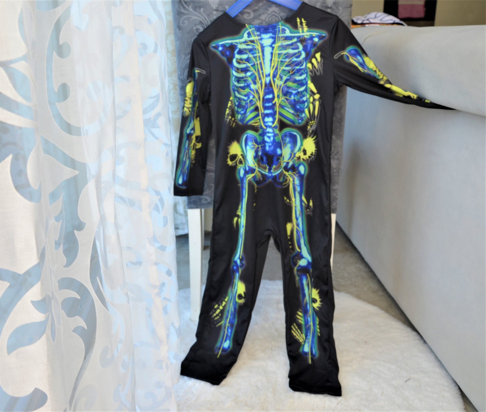 raz oblečený,jedná sa o overal,materiál-polyester-v tme svieti,dĺžka 94cm,šírka pod pazuchami 2x 32cm,rukáv od krku 48cm,vzadu na krku sa zapína na suchý zips..kuk aj na iné moje inzeráty