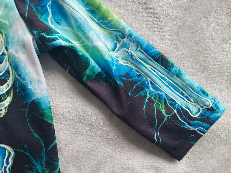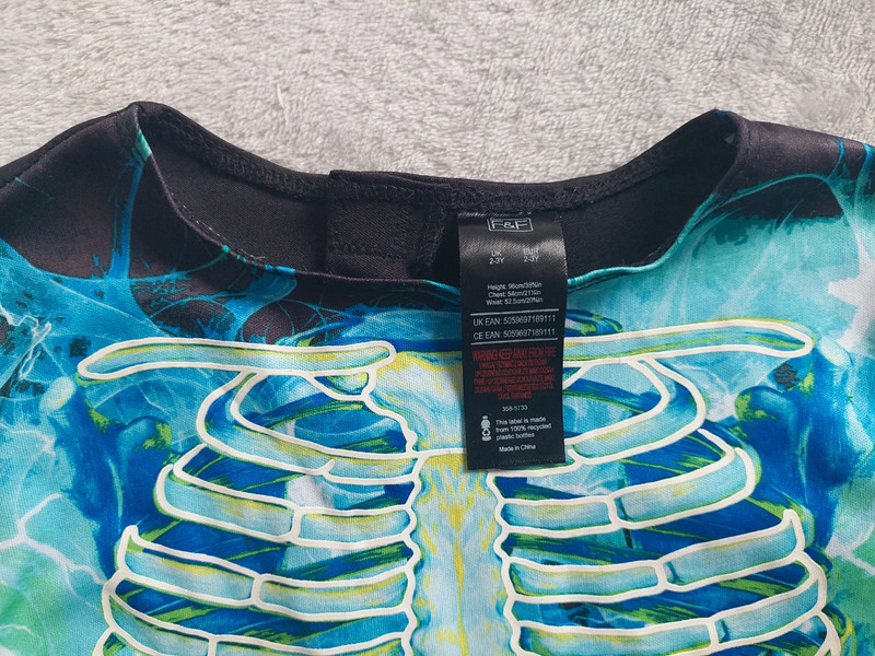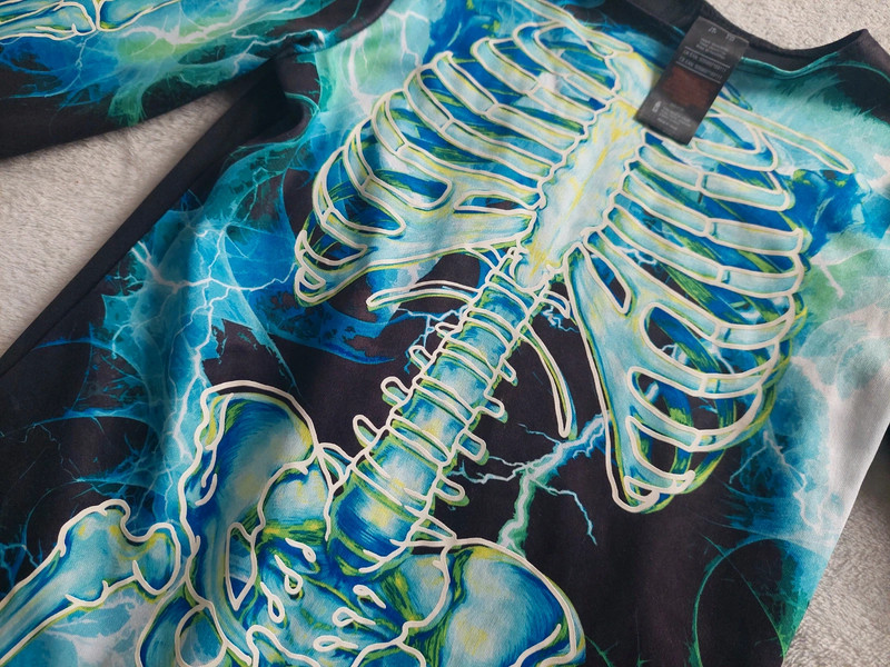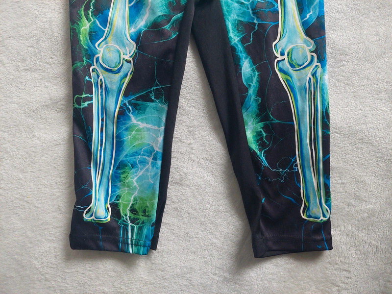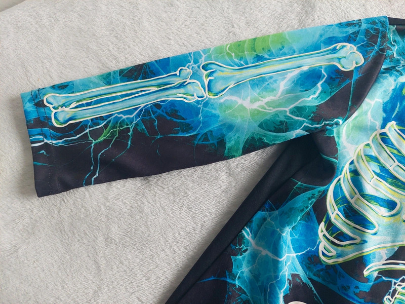 Stav: top stav, bez poškodení a známok nosenia. Krásny farebný kostým malej kostry, po nabití svieti v tme. Mierne elastický, krásne sýte farby.