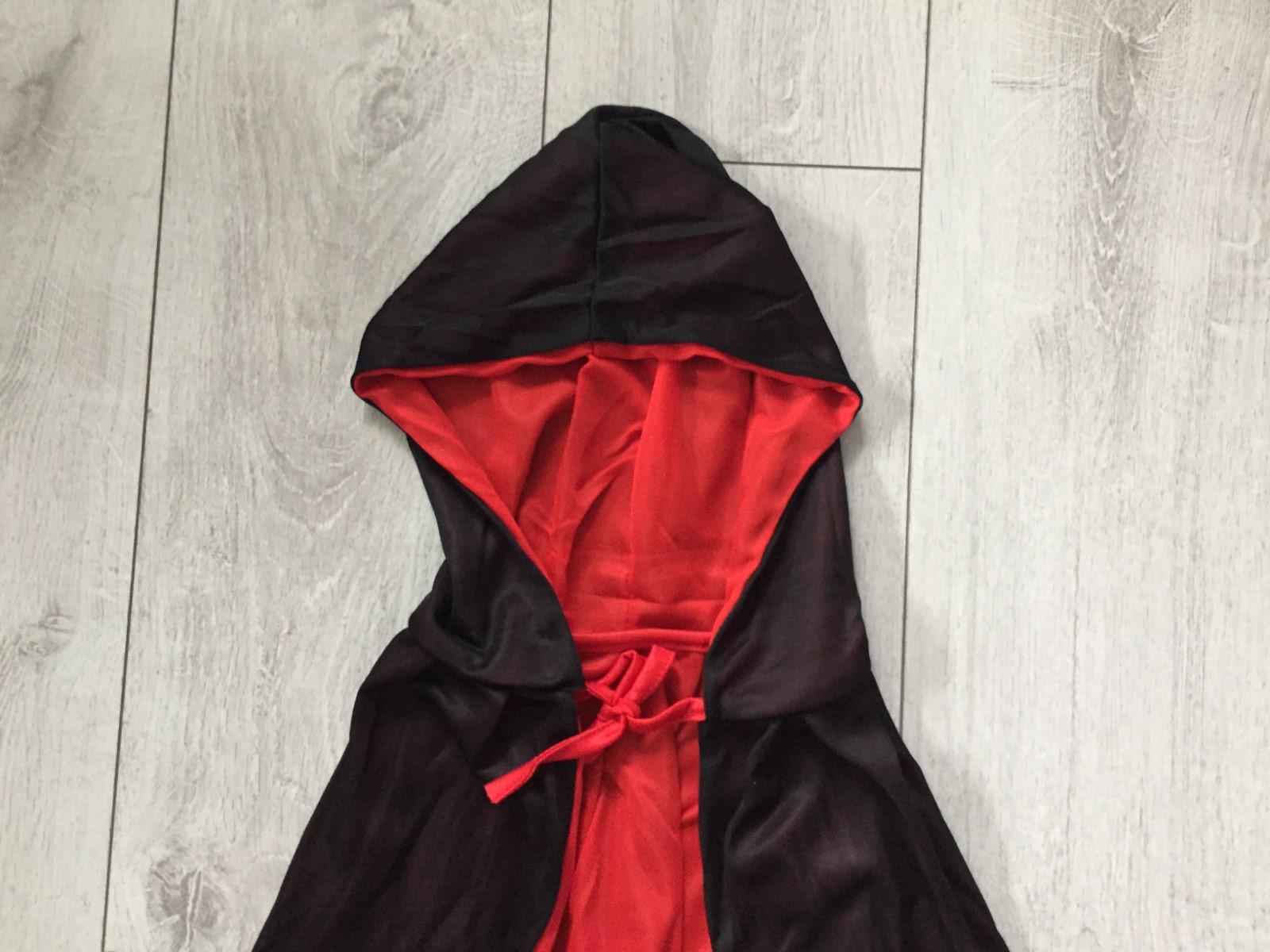 Plašť na halloween raz oblečeny je trochu na par miestach zatiahnuty. Vid foto. Pri noseni nevidno. Inak OK. Velkosť 122/128. Dlžka 82cm.