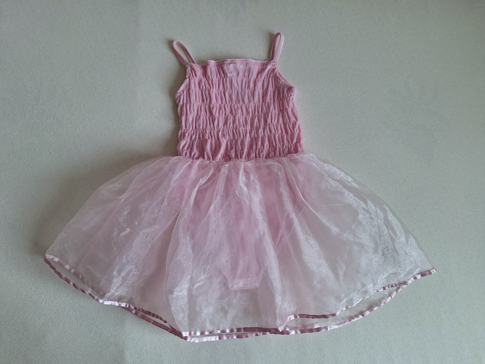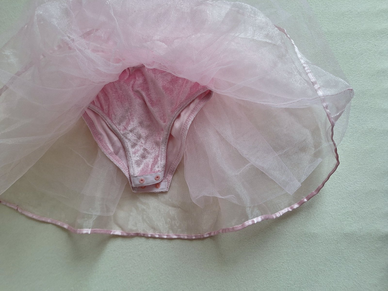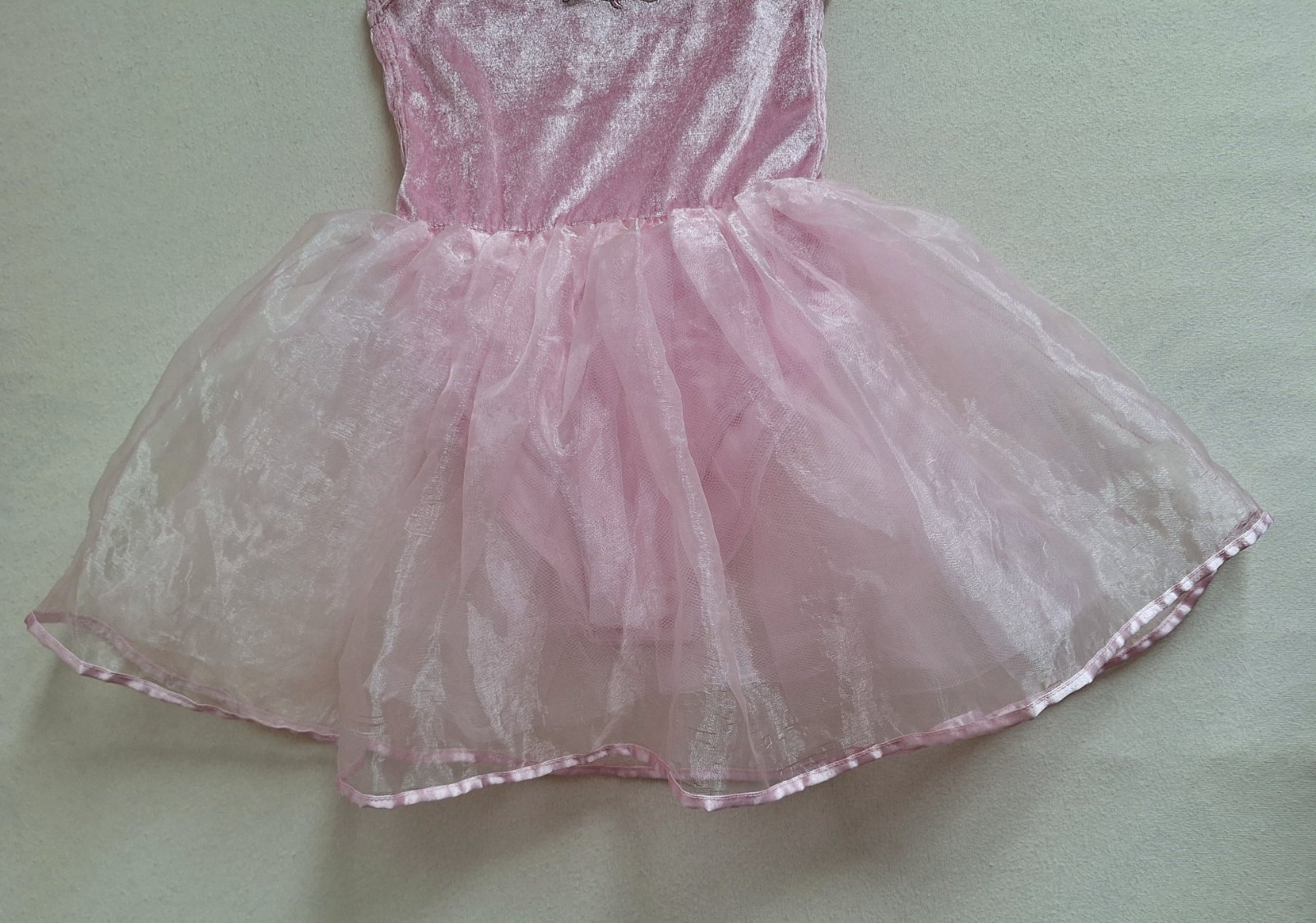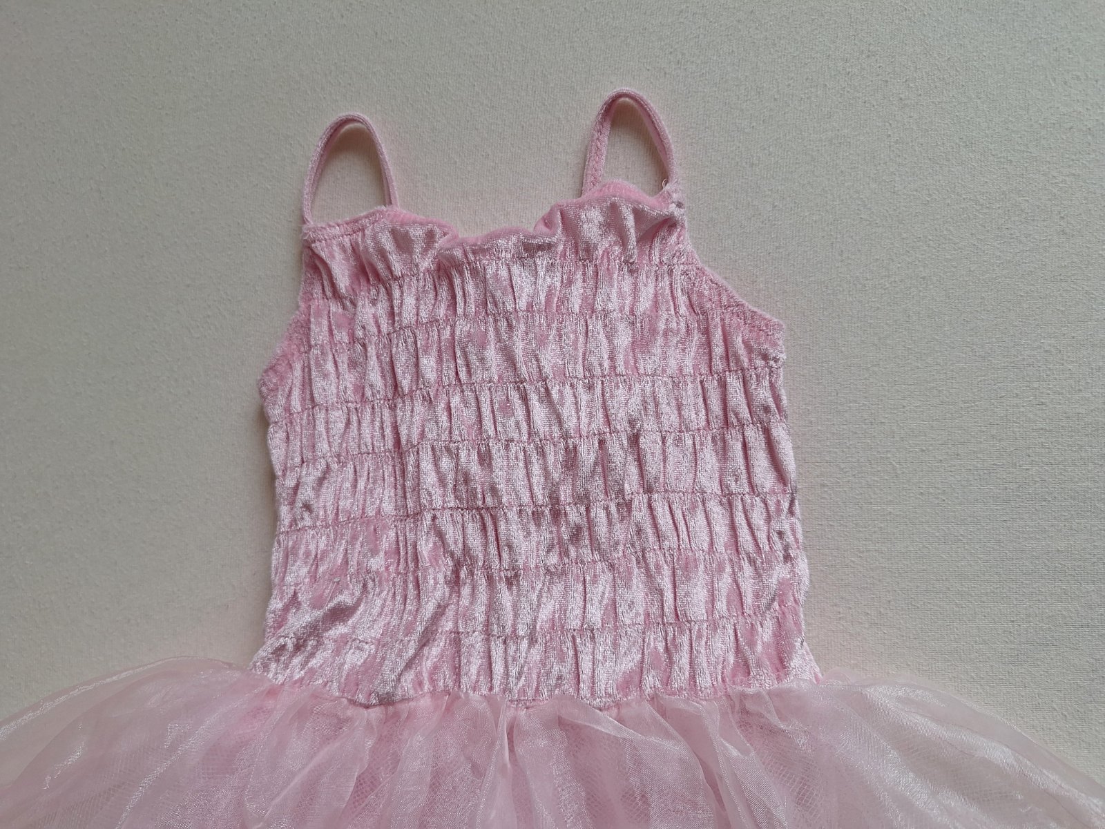 Stav: Top stav bez poškodení a známok nosenia. Lesklé zamatové body, vzadu nazberkané do gumiček, pekne sa prispôsobí postave. Bohato riasená šifónová sukňa, ukončené na štýl baletného dresu.