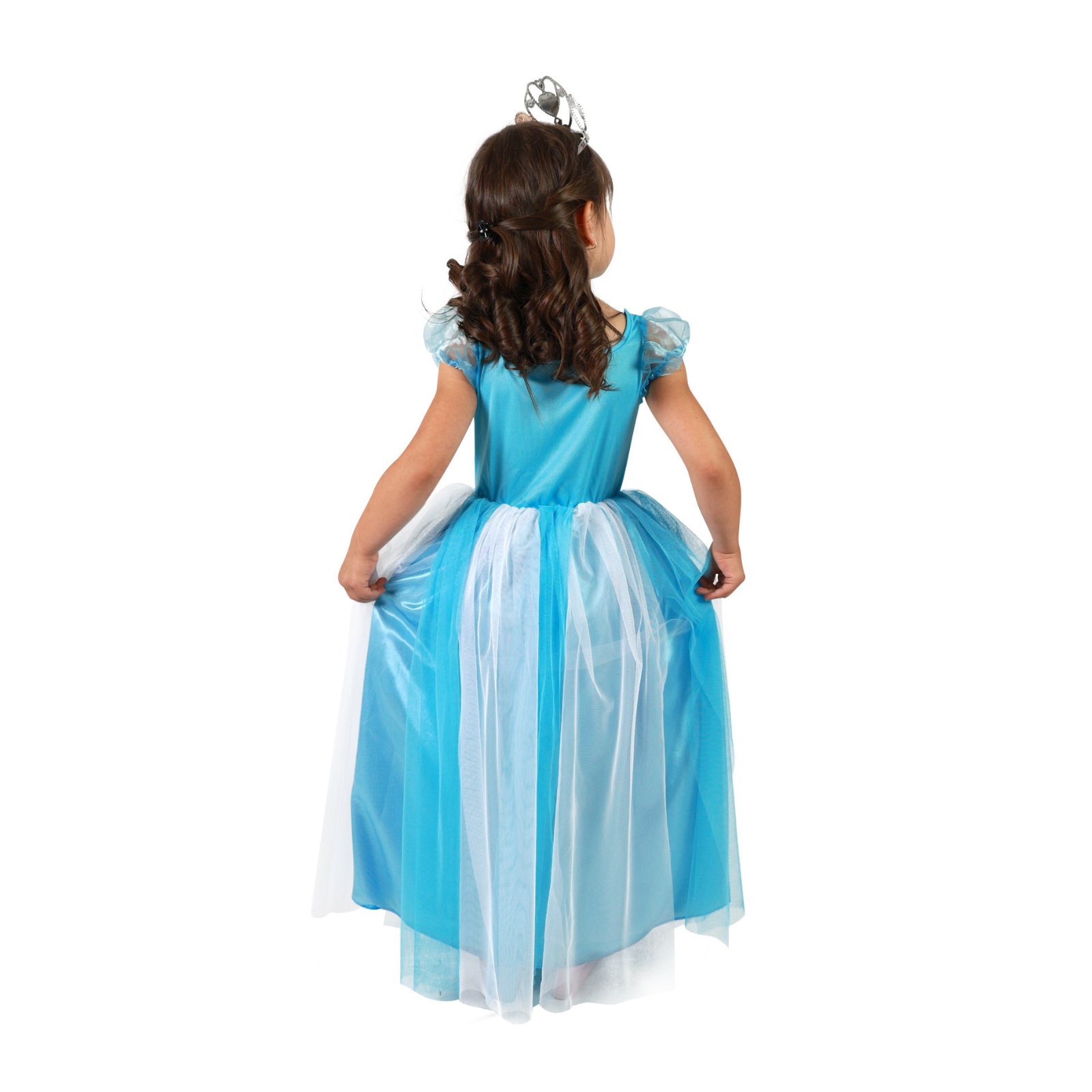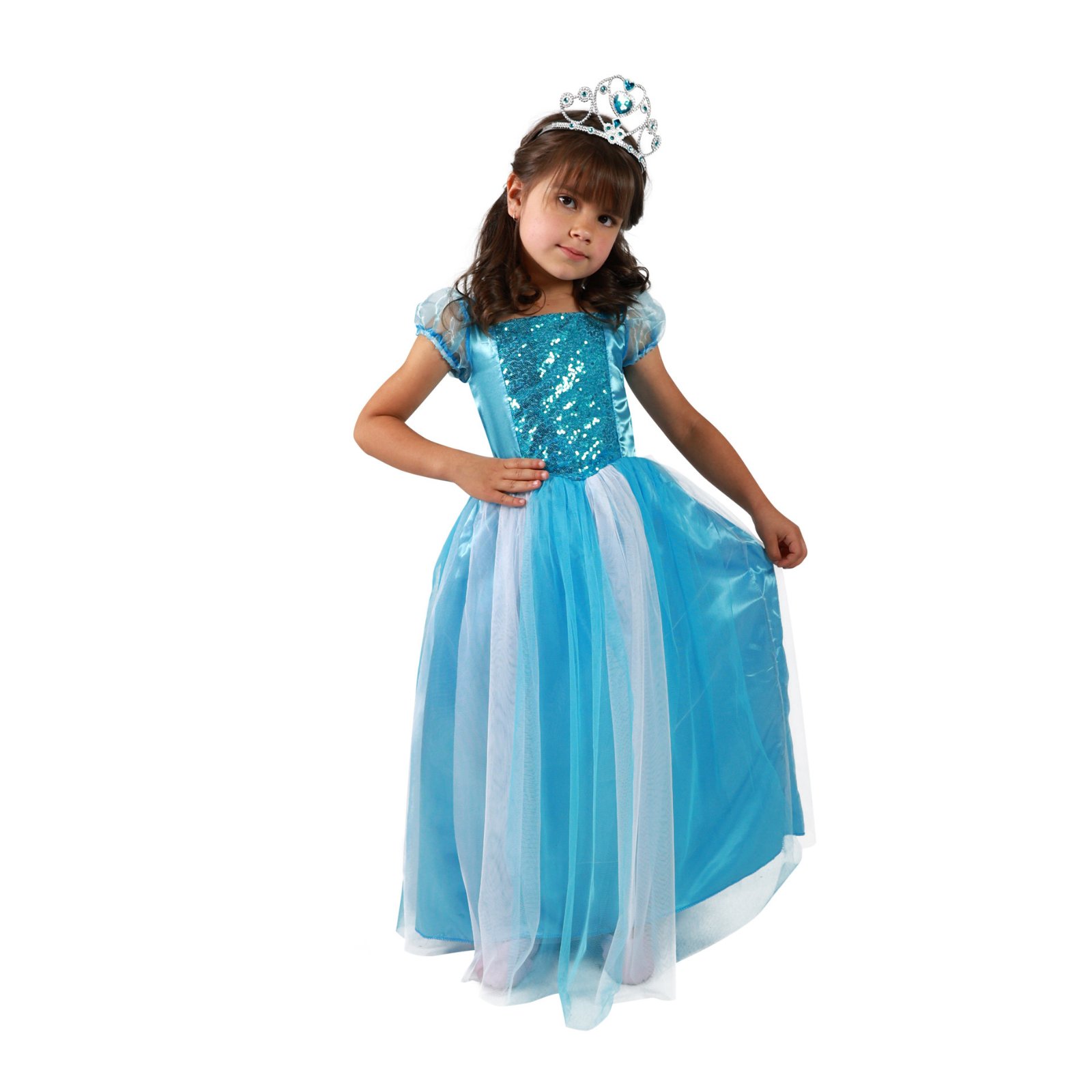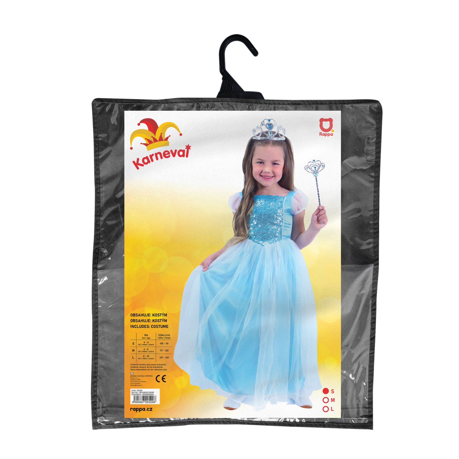 Úchvatný dievčenský kostým pre princezné! Kostým modrej farby je kombinovaný s bielym tylom a v hornej časti dekorovaný modrými flitrami. Kostým princeznej vo veľkosti S je určený pre dievčatká vo vekovom rozmedzí 4-6 rokov (105-116 cm).