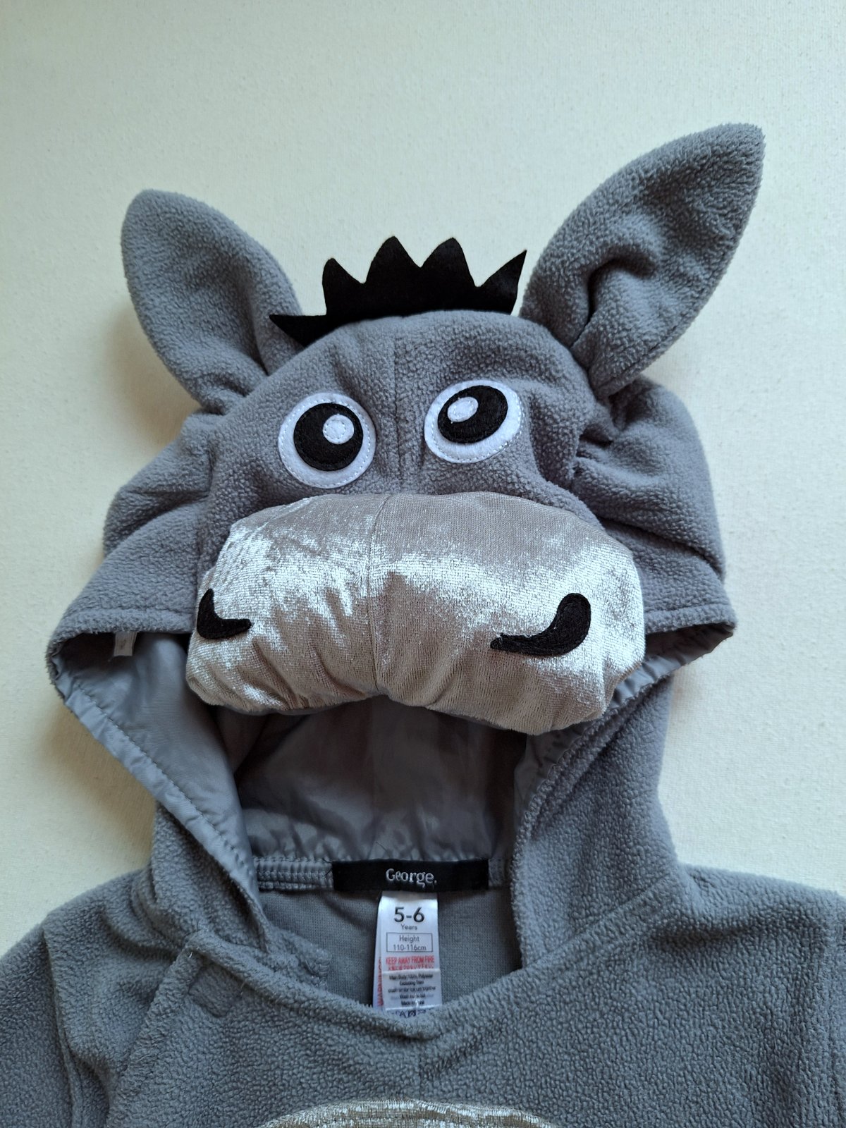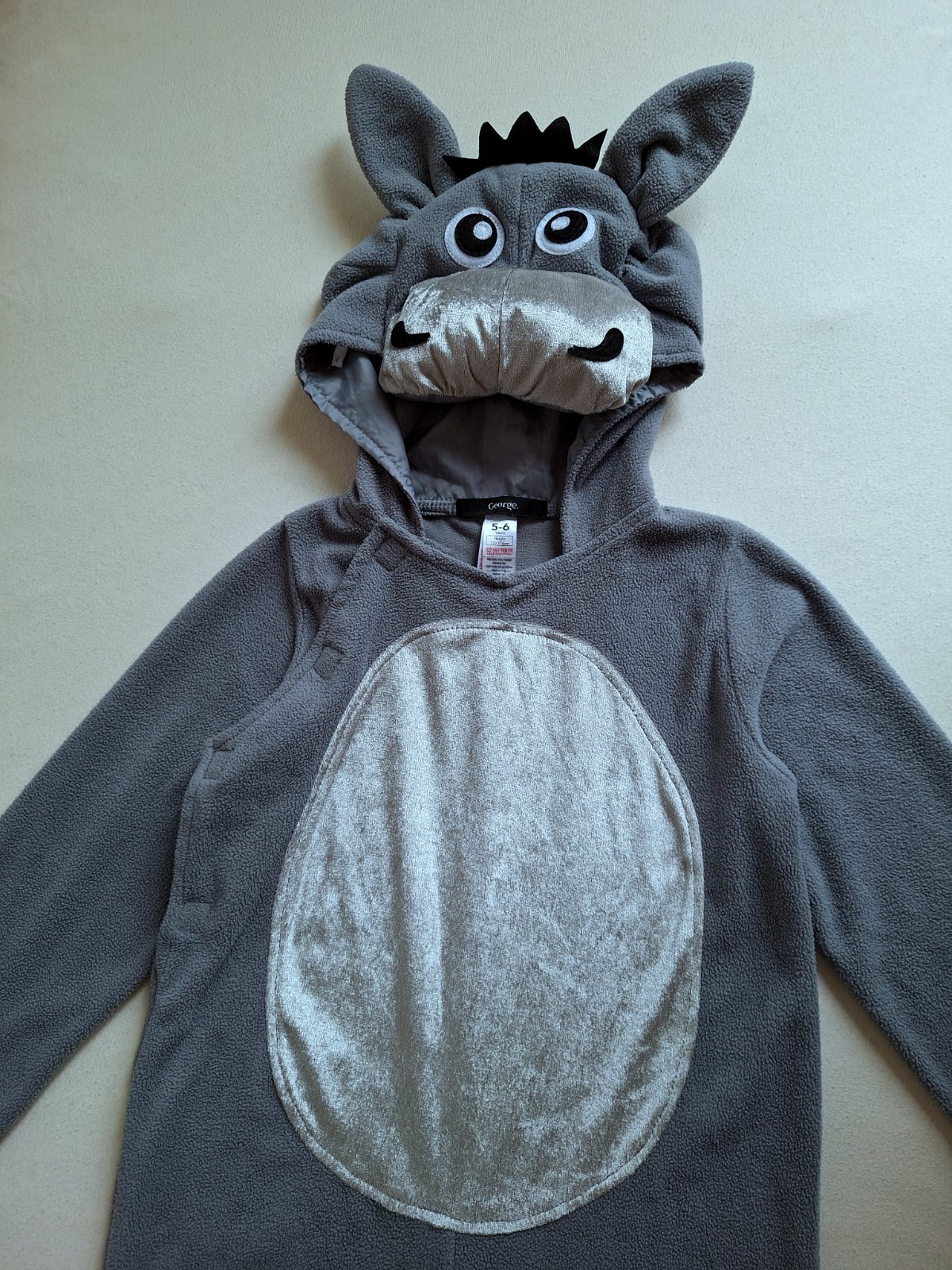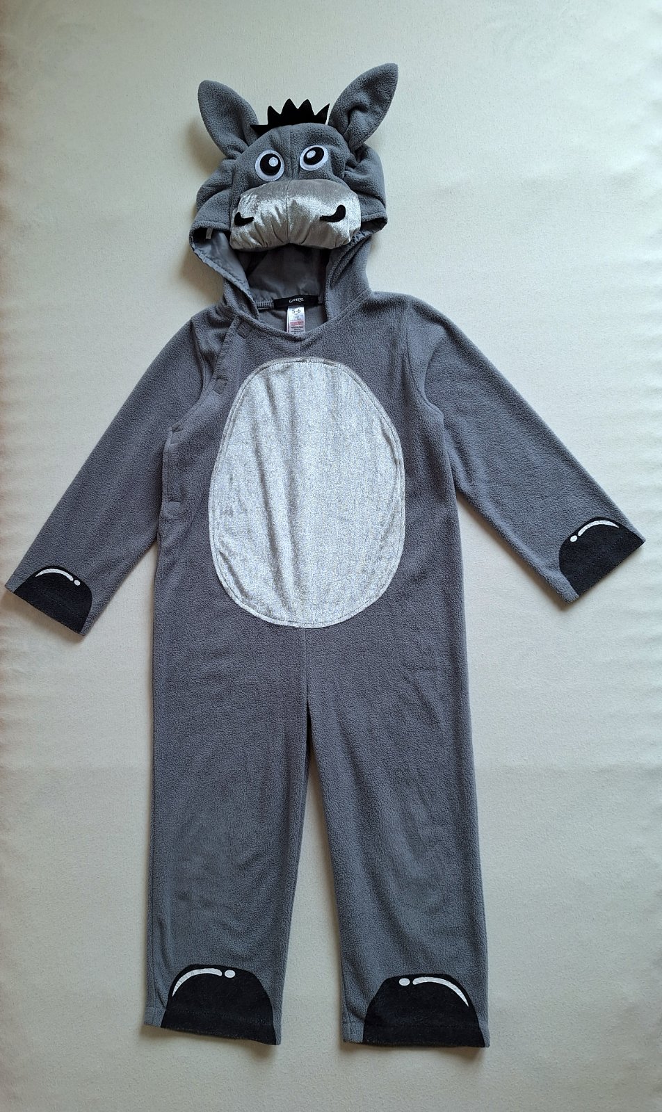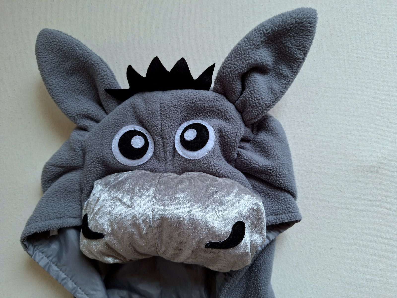 Veľmi milý overal somárika, teplejší fleesový v peknej kombinácii so zamatovým lesklým bruškom a papuľkou. Hlava vystužená s uškami očami a imitáciou hrivy. Zapínanie vpredu na boku na suché zipsy.