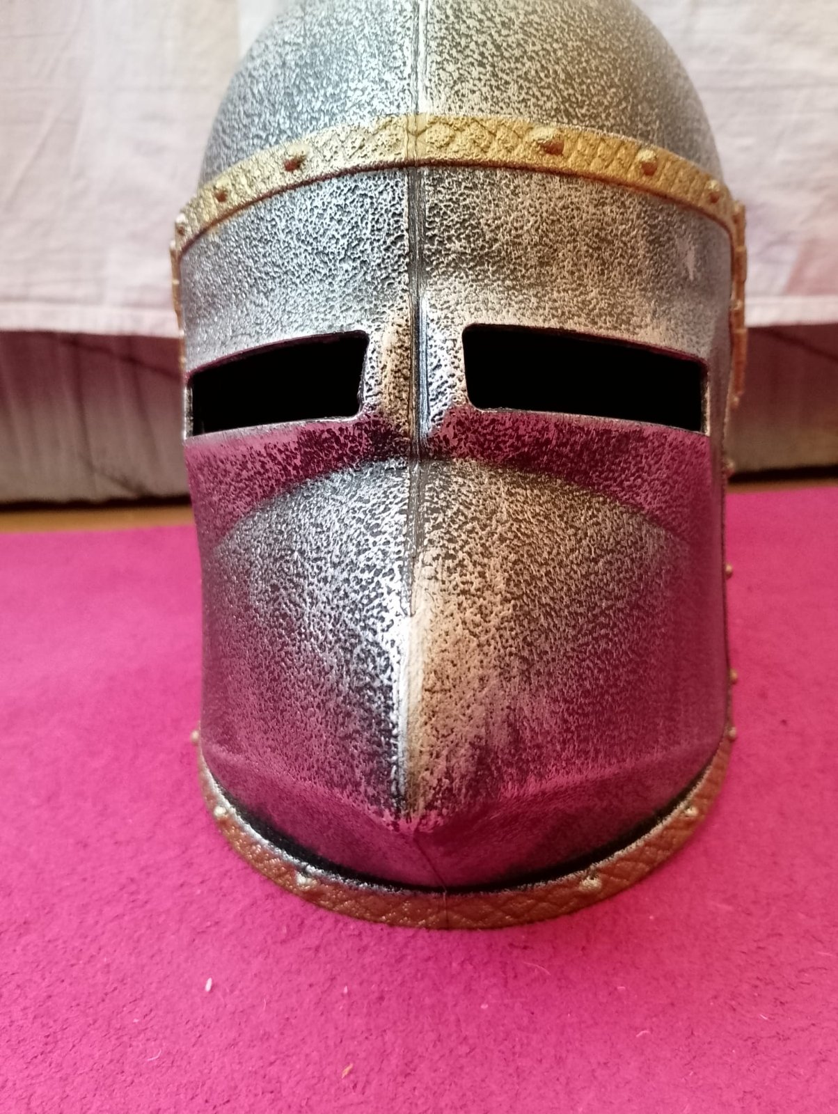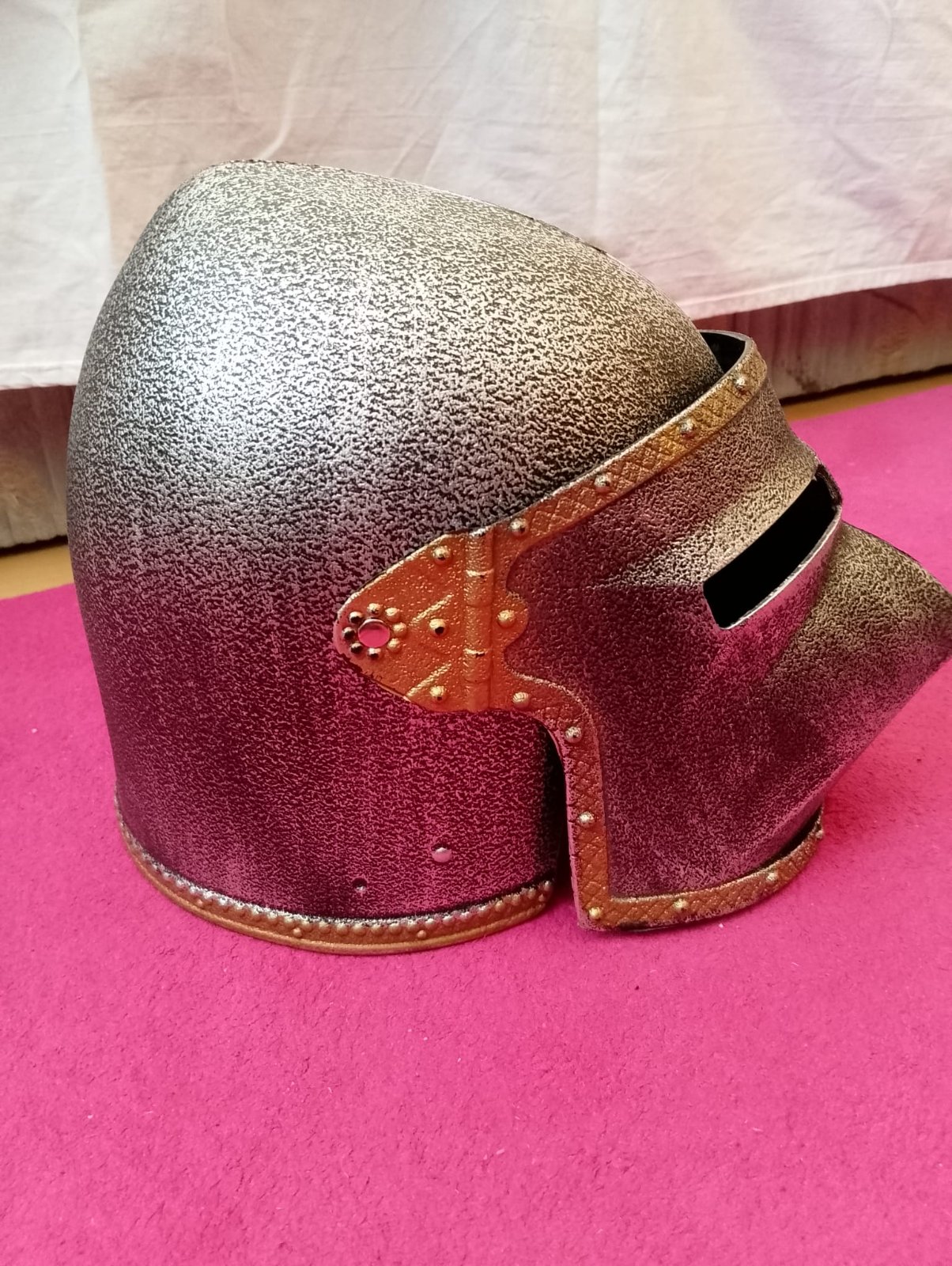 Plastova prilba tyou bascinet, vyklapacia maska s ocnym priezorom. Strieborna farba s patinou, zlatisty lem. Velmi pekna kvalita aj vzhlad.