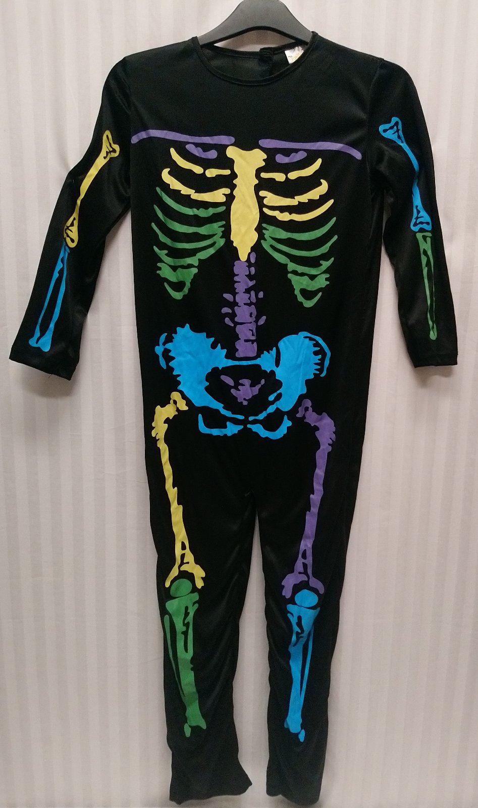 kostým Kostlivec farebný, obsahuje čierny overal s farebným motívom Kostlivca, overal má vzadu zapínanie na suchý zips, je elastický, vzadu na ľavom rameni má vyťahané vlákno,