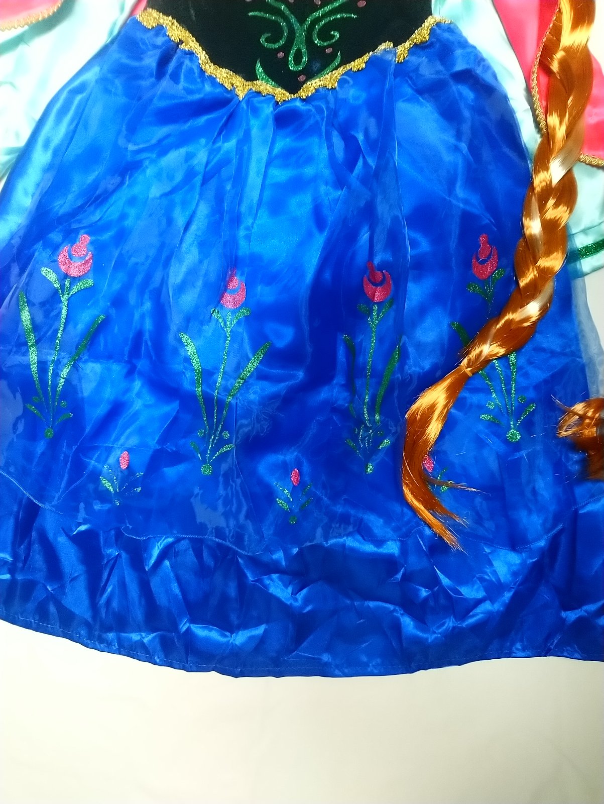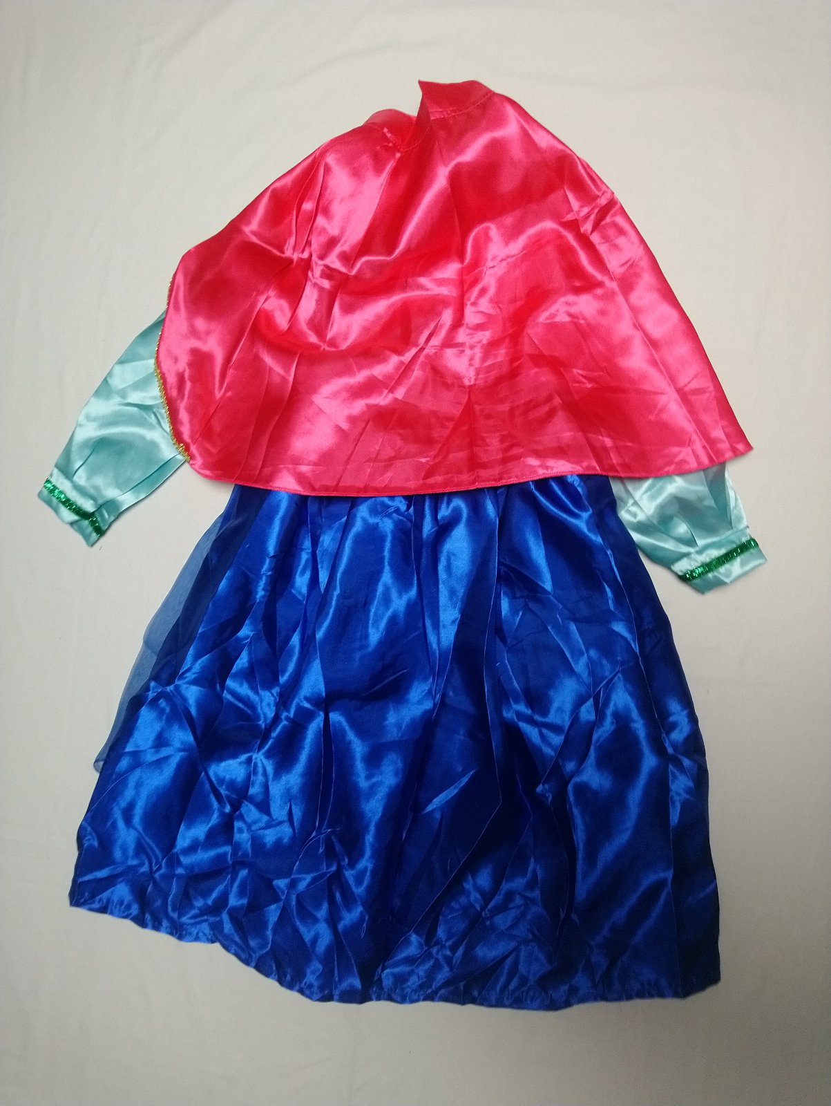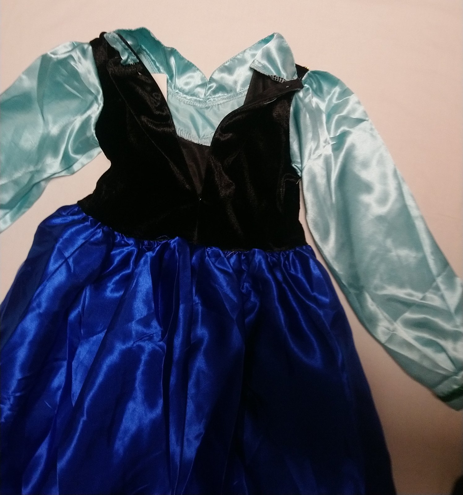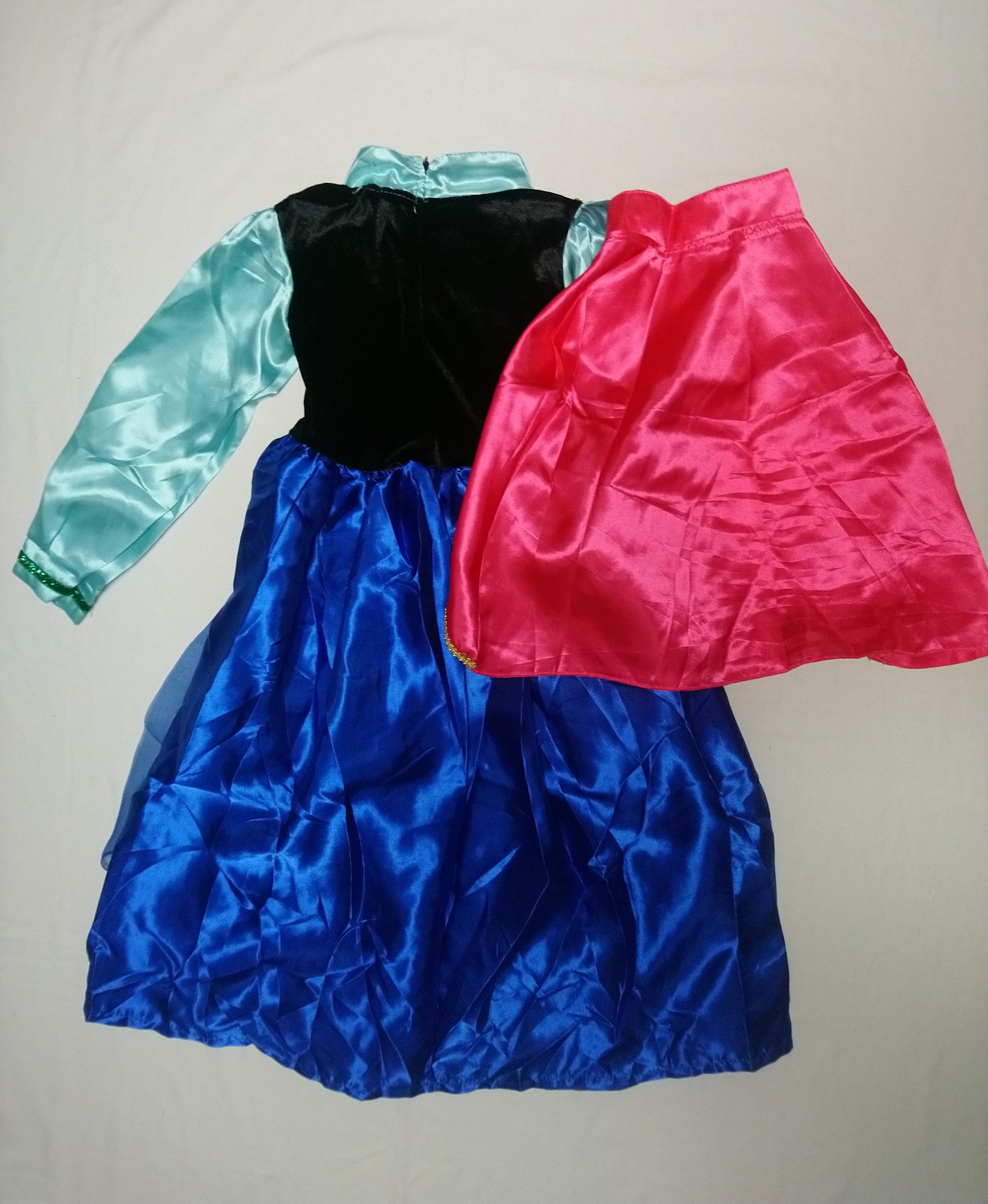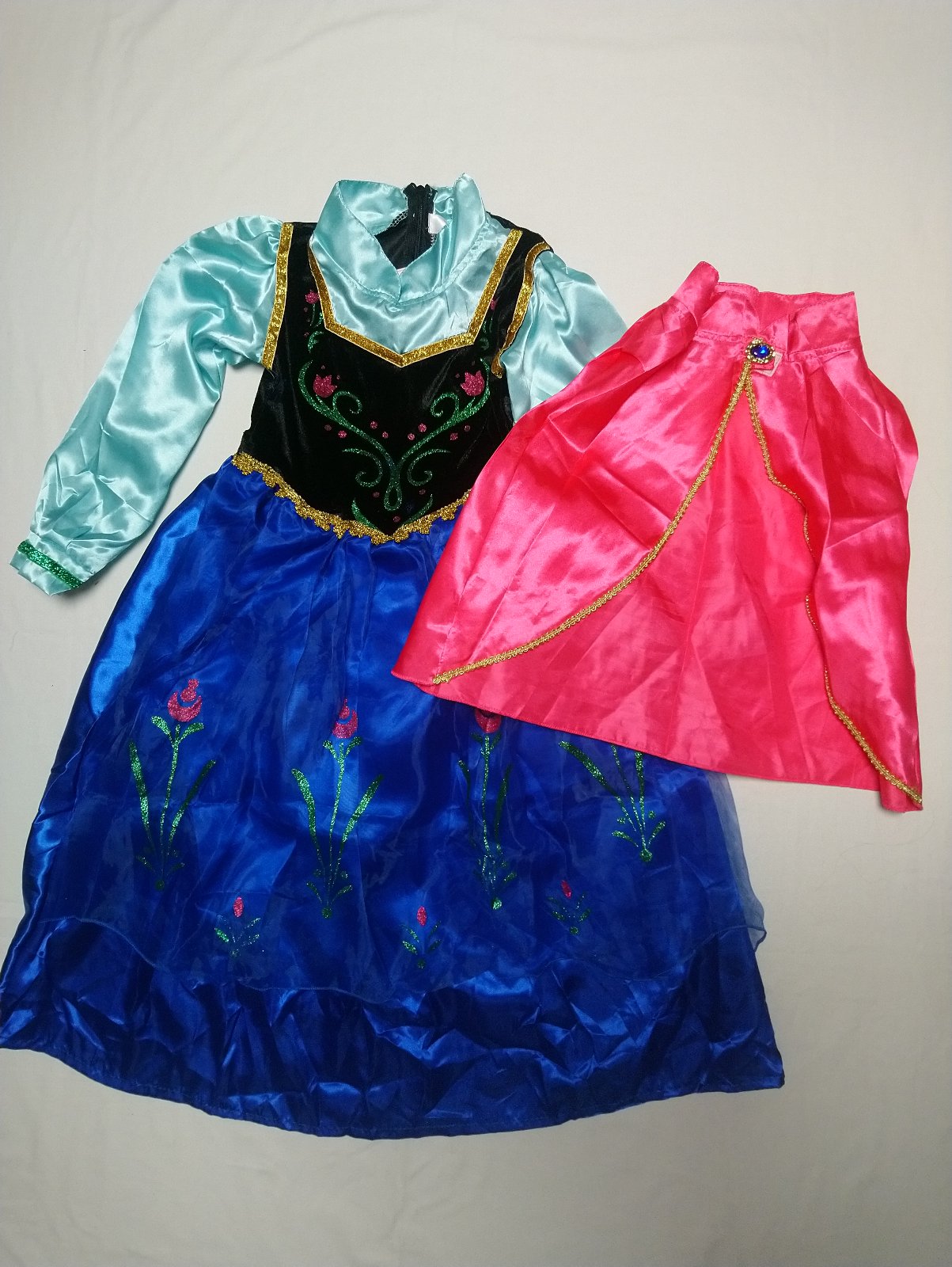1. Anna šaty s dlhým rukávom a ružovou pelerínou so zapínaním na suchý zips, šaty sú v odtieňoch modrej a námorníckej modrej so zapínaním vzadu na zips, sú krásne vyšívané a sú bohato zdobené, okraje sú lemované a pod sukňou je spodnička, ktorá dáva šatám tvar.