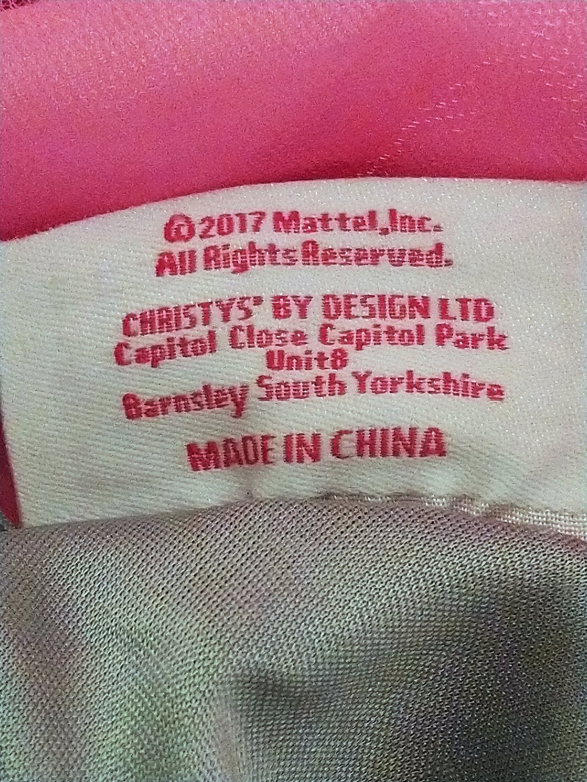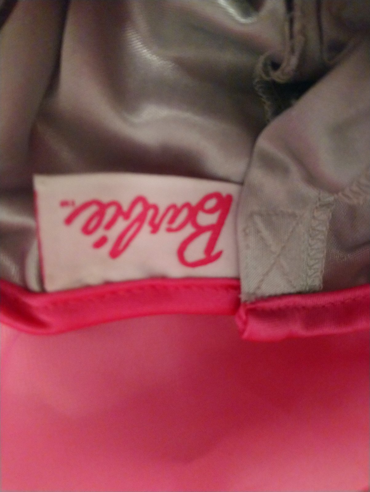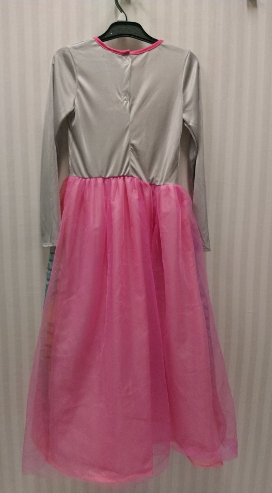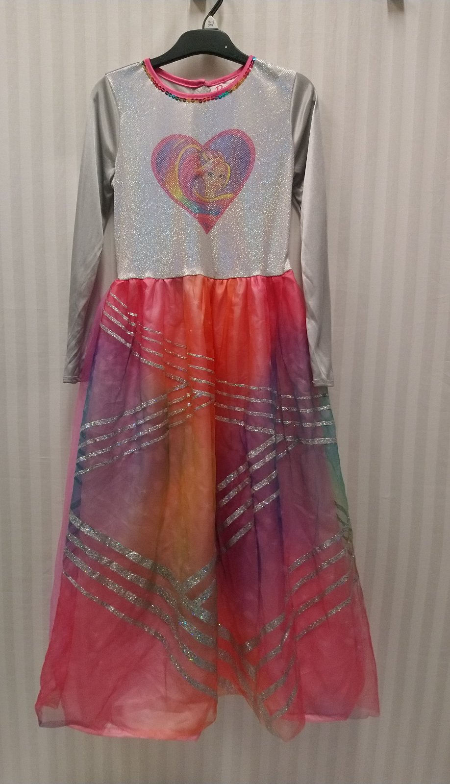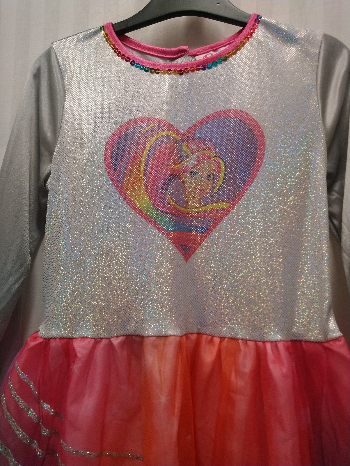 kostým Barbie, obsahuje jednodielne šaty so zapínaním suchý na zips vzadu, vzadu v páse je gumička, vrchná časť je strieborná s motívom, sukňa ružová s farebným vzorom,
