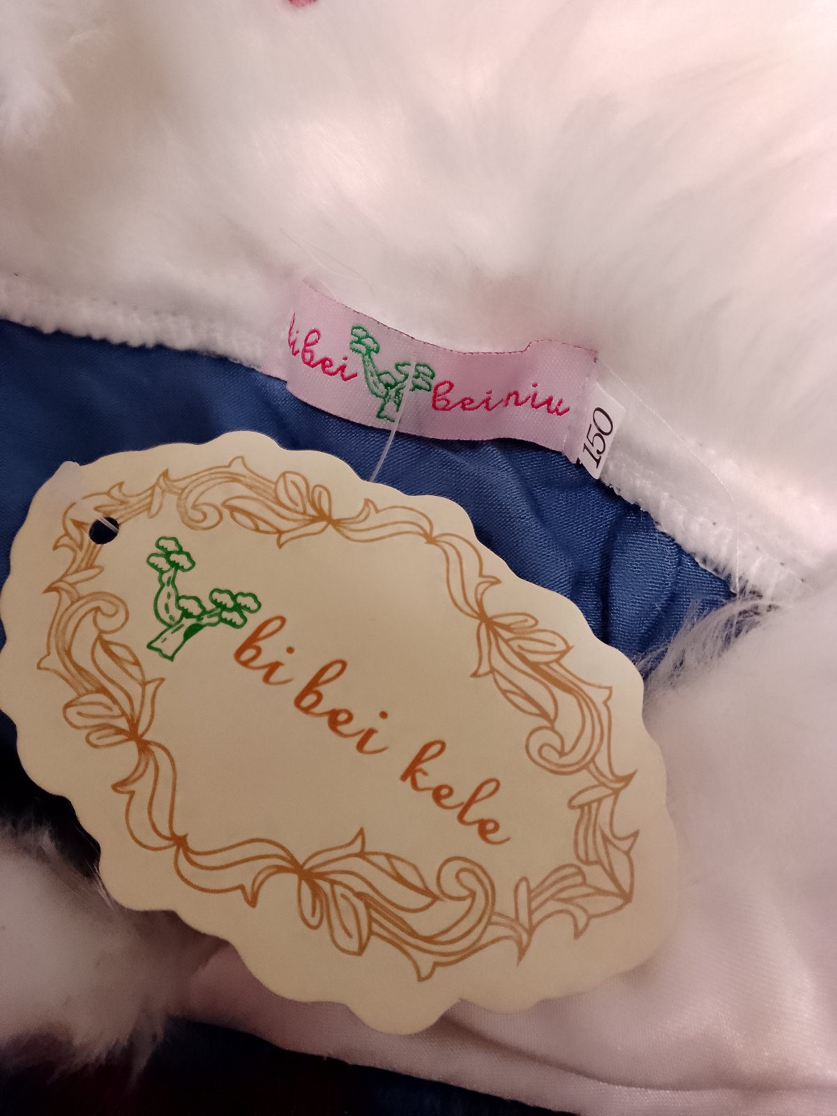 modré dlhé elastické zamatové šaty s dlhým rukávom rozšírujúceho sa strihu so závojom upevneným na pevno vzadu na ramenách, s kožušinkou s červenými diamantami okolo krku. Šaty sú ozdobené strieborným vzorom s trblietkami, v páse vzadu je gumička.