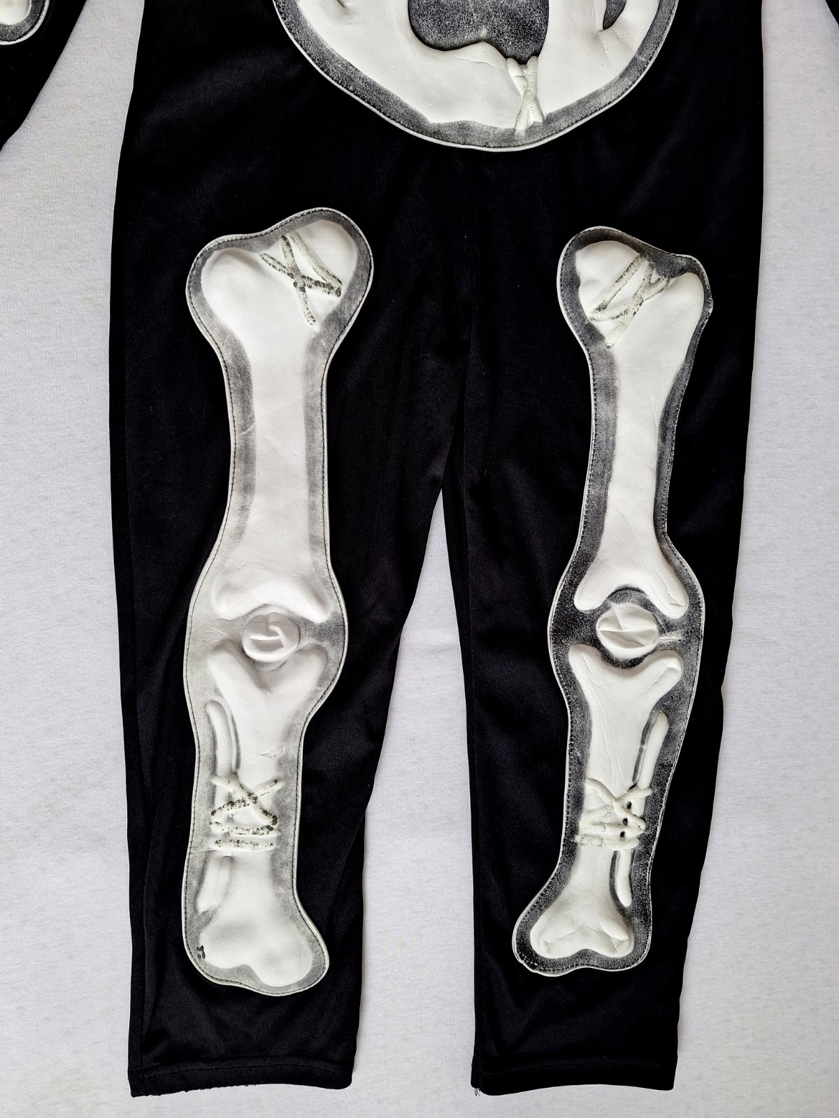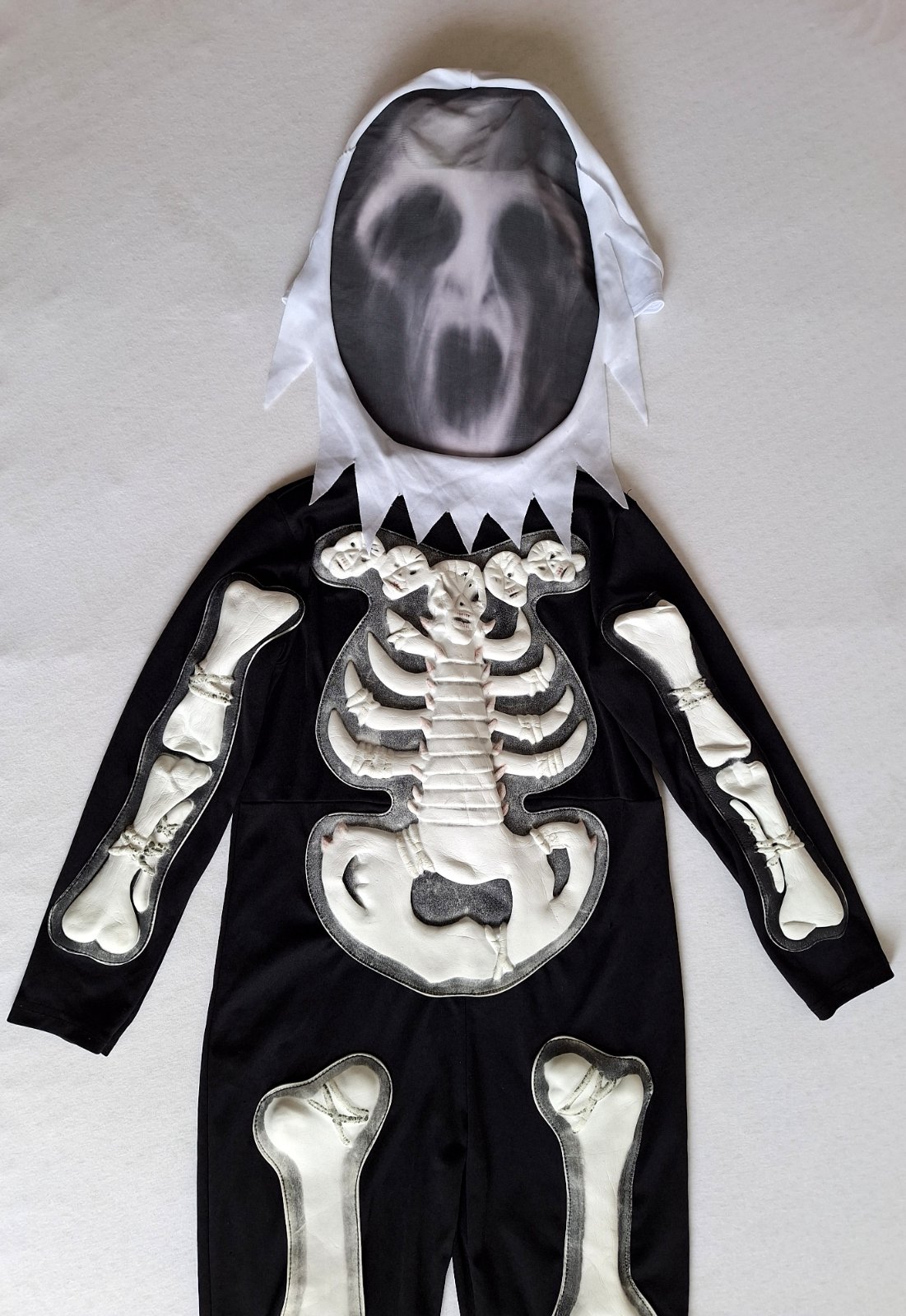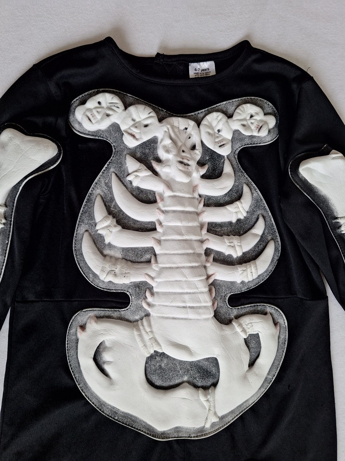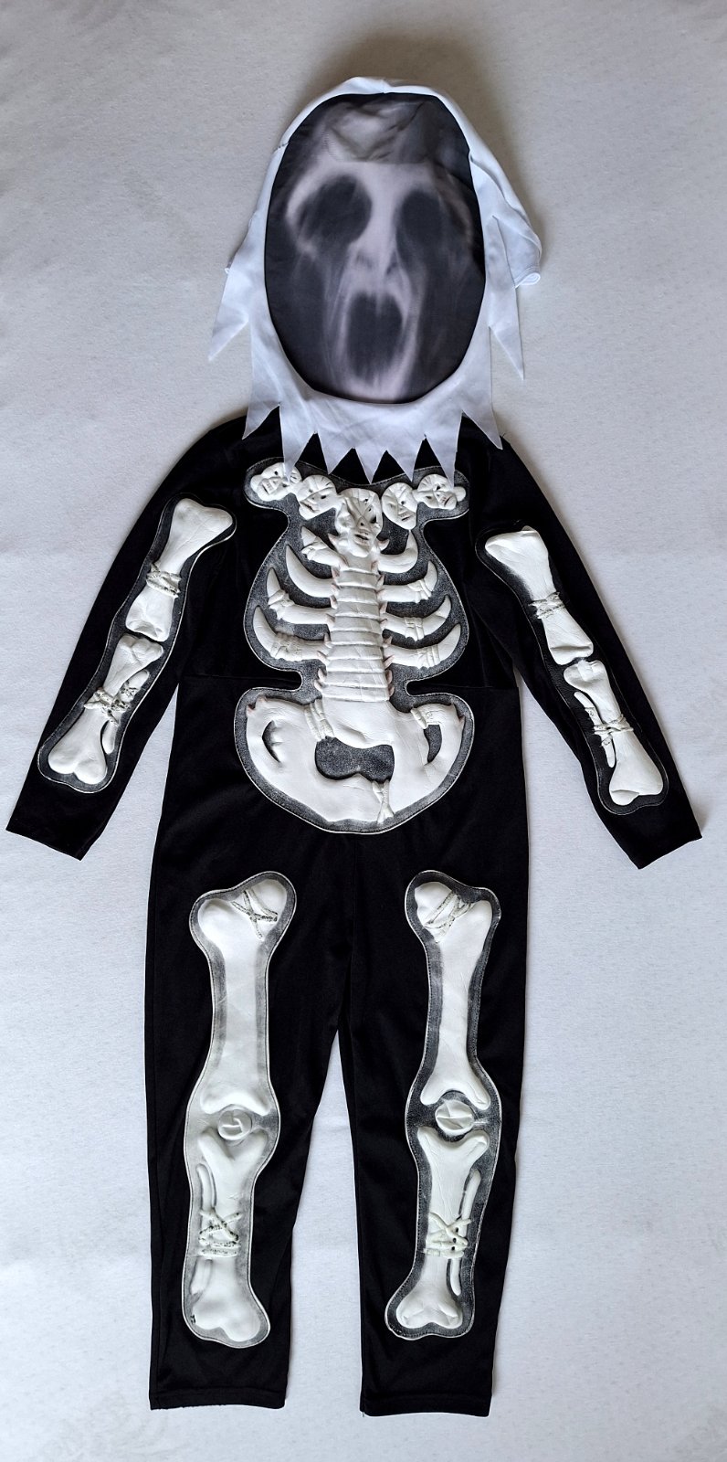 Parádny 2-dielny kostým na halloween pozostáva z elastického overalu a tvarovanej masky- Overal je celo-elastický, prispôsobí sa postave. Aplikácie kostí a lebiek sú z 3D mäkkej penovej hmoty. Maska na tvár sa navlieka na hlavu a dobre drží. Pekný stav, len drobné zatiahnutia od suchých zipsov.
