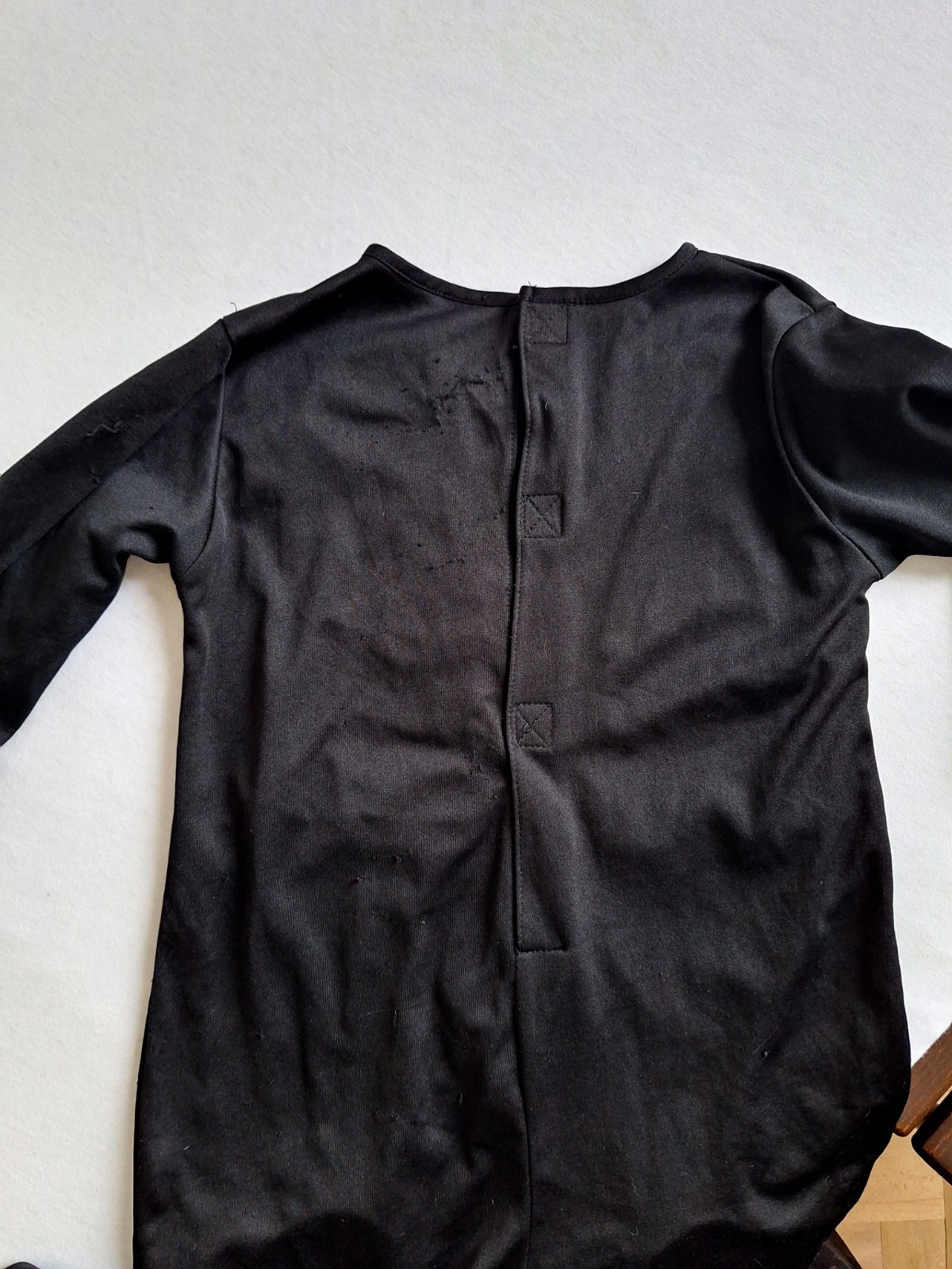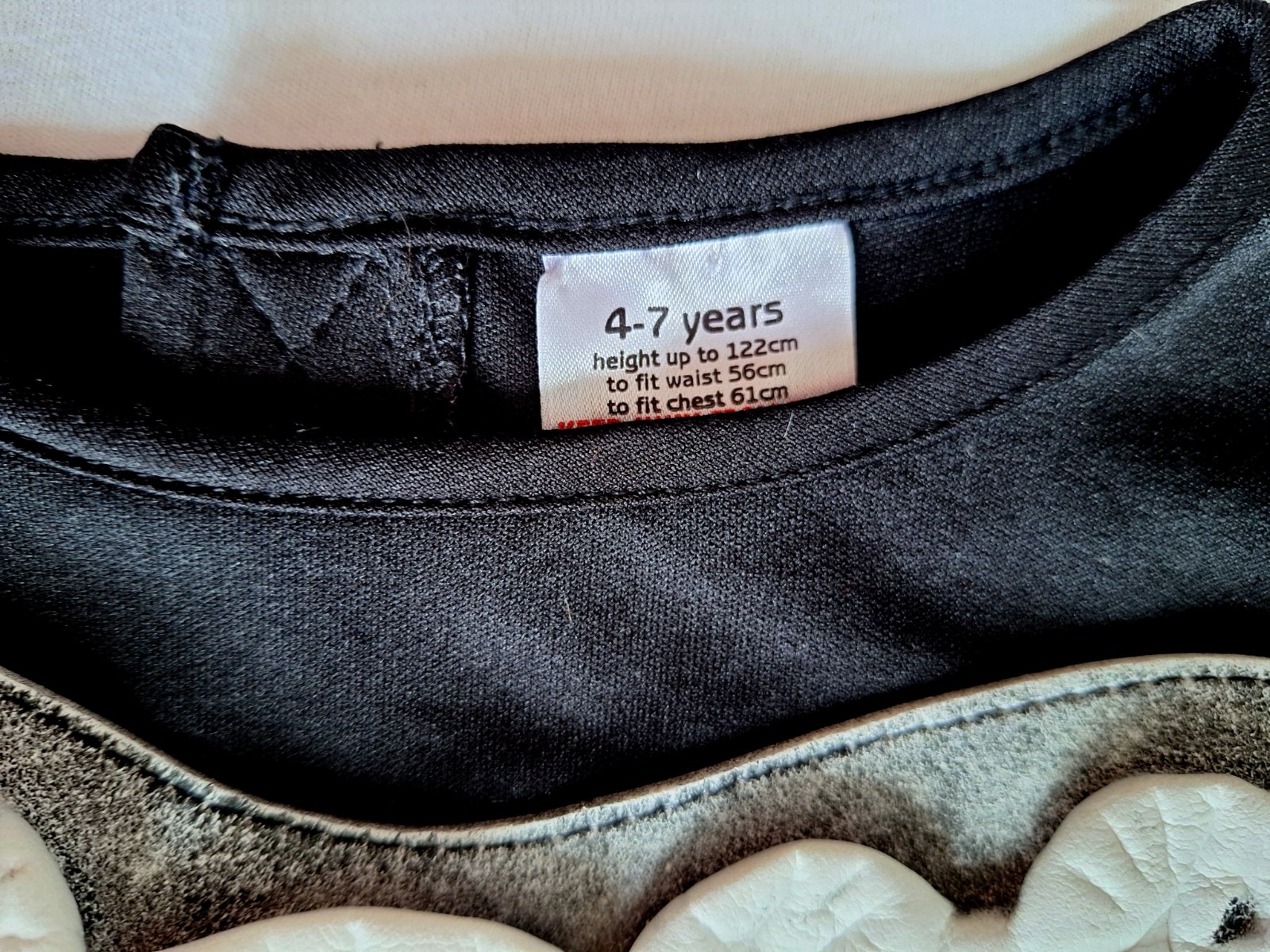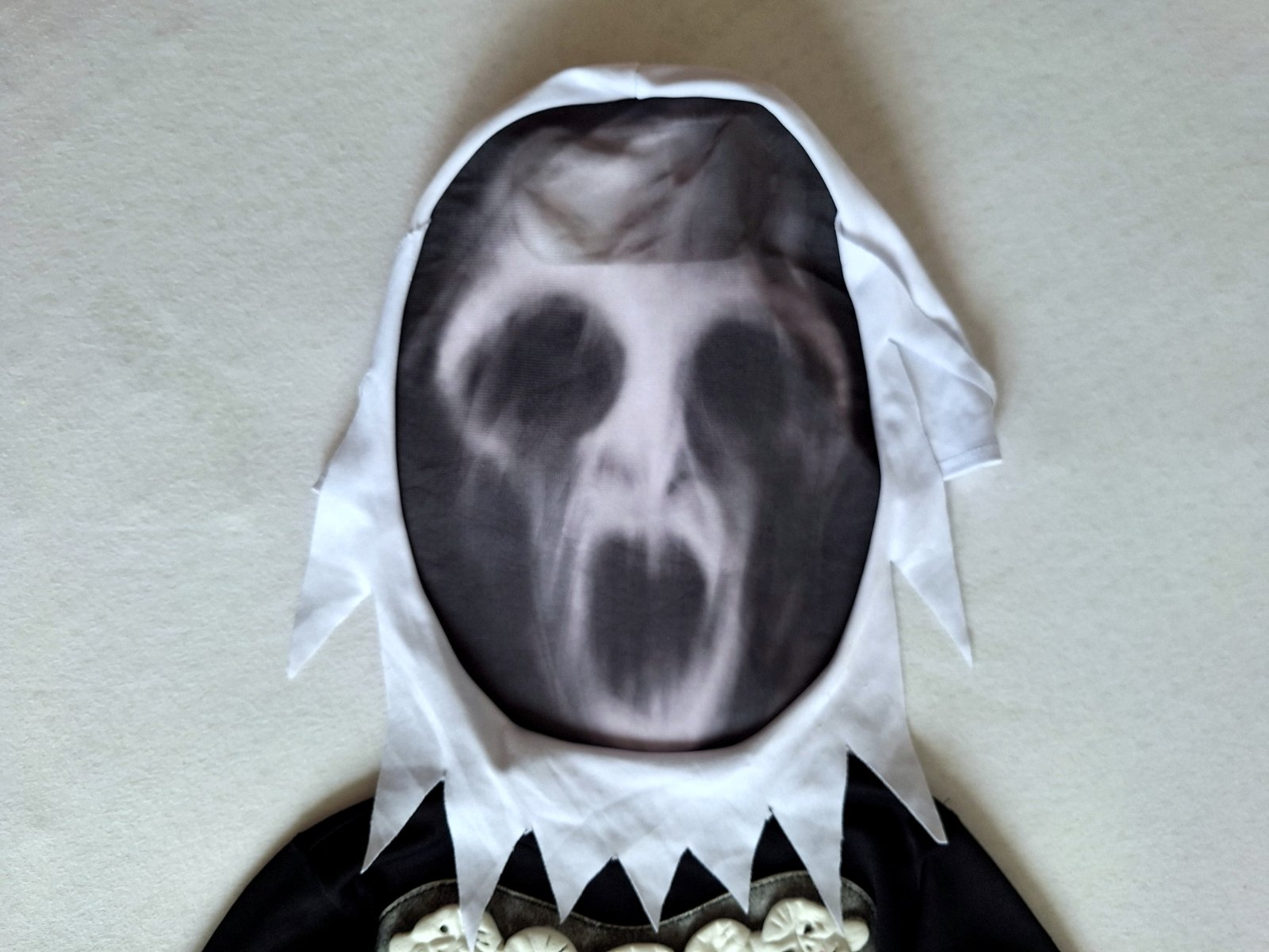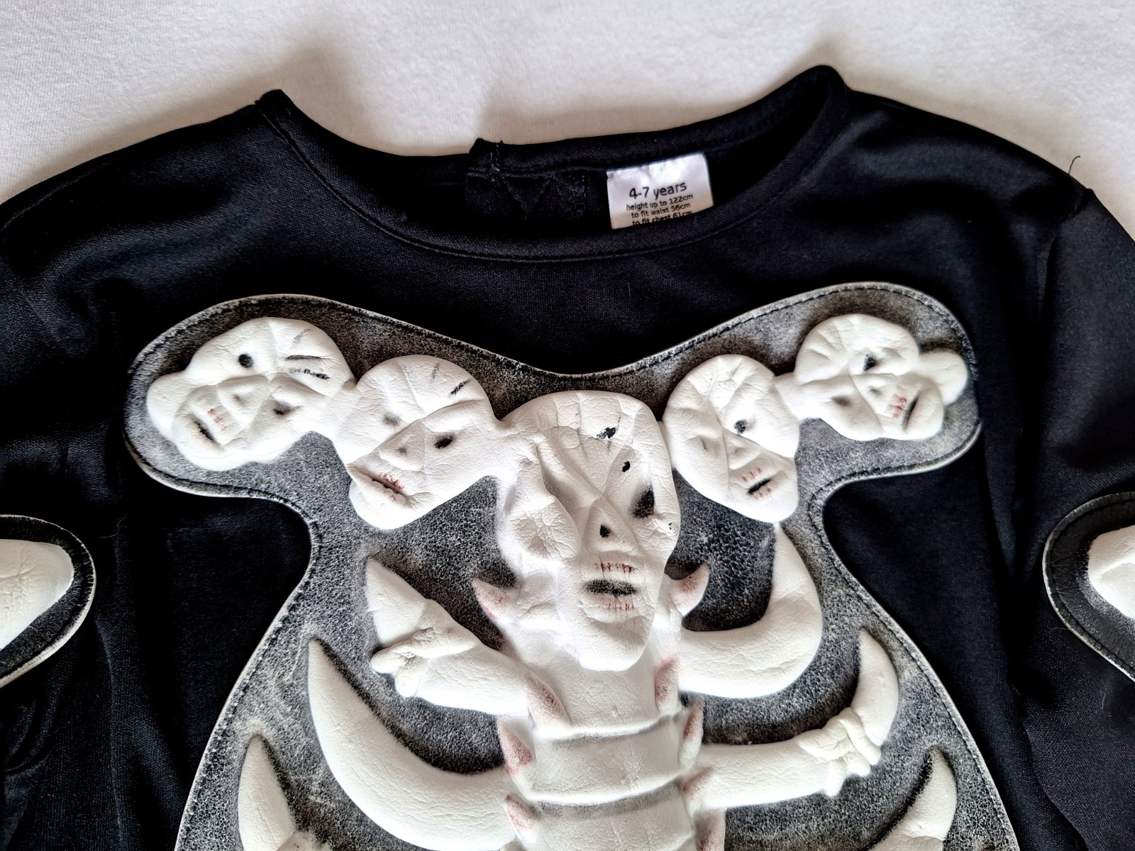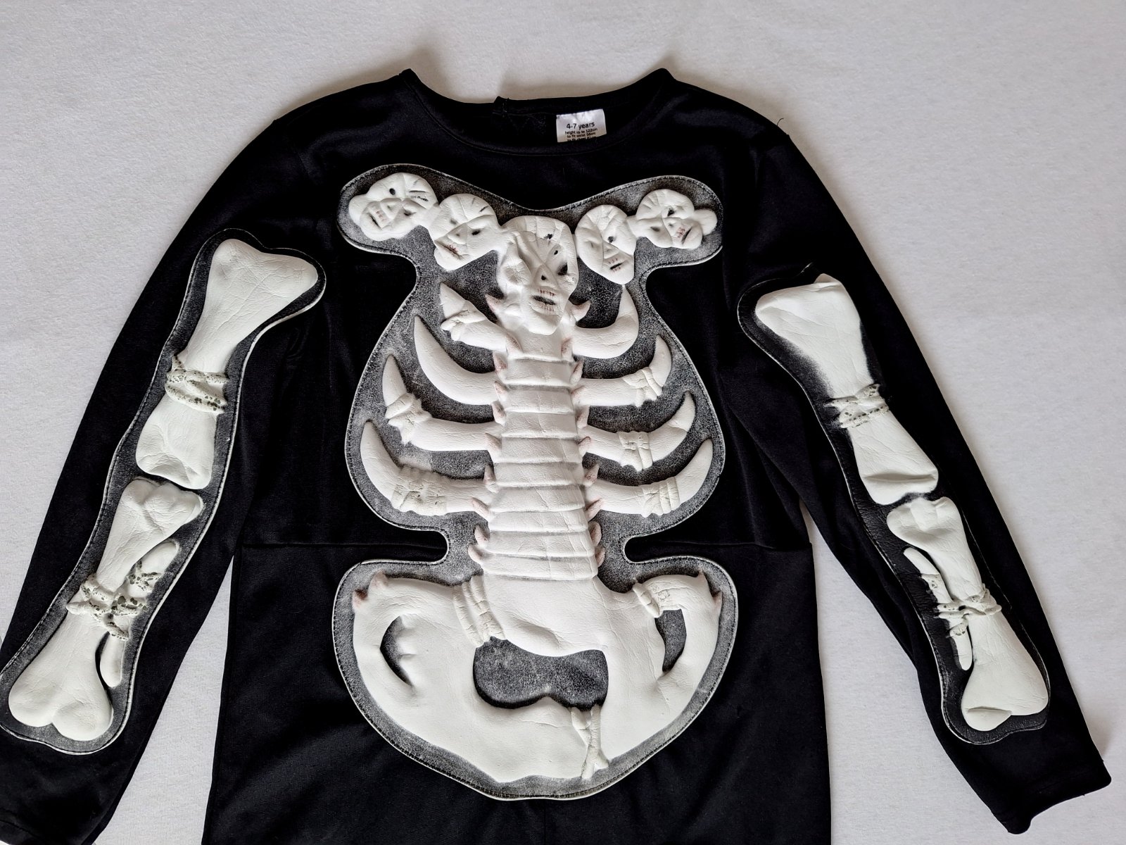 Parádny 2-dielny kostým na halloween pozostáva z elastického overalu a tvarovanej masky- Overal je celo-elastický, prispôsobí sa postave. Aplikácie kostí a lebiek sú z 3D mäkkej penovej hmoty. Maska na tvár sa navlieka na hlavu a dobre drží. Pekný stav, len drobné zatiahnutia od suchých zipsov.