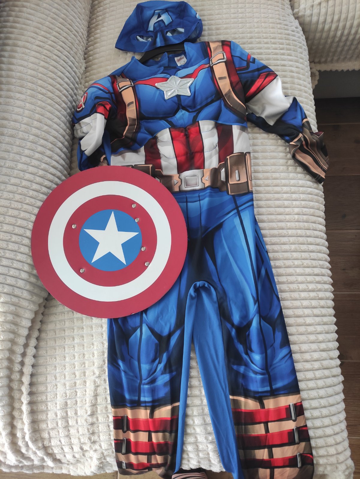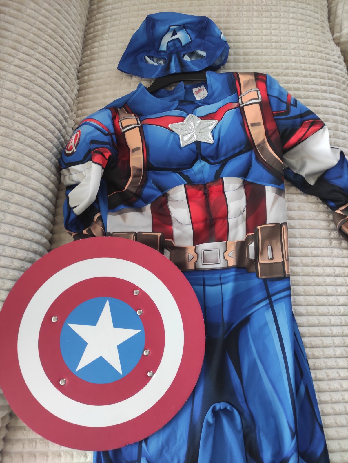Predám masku Avengers,raz oblečenú veľ. 7-8rokov,veľ. 128: set obsahuje-masku na tvár,overal a štít.