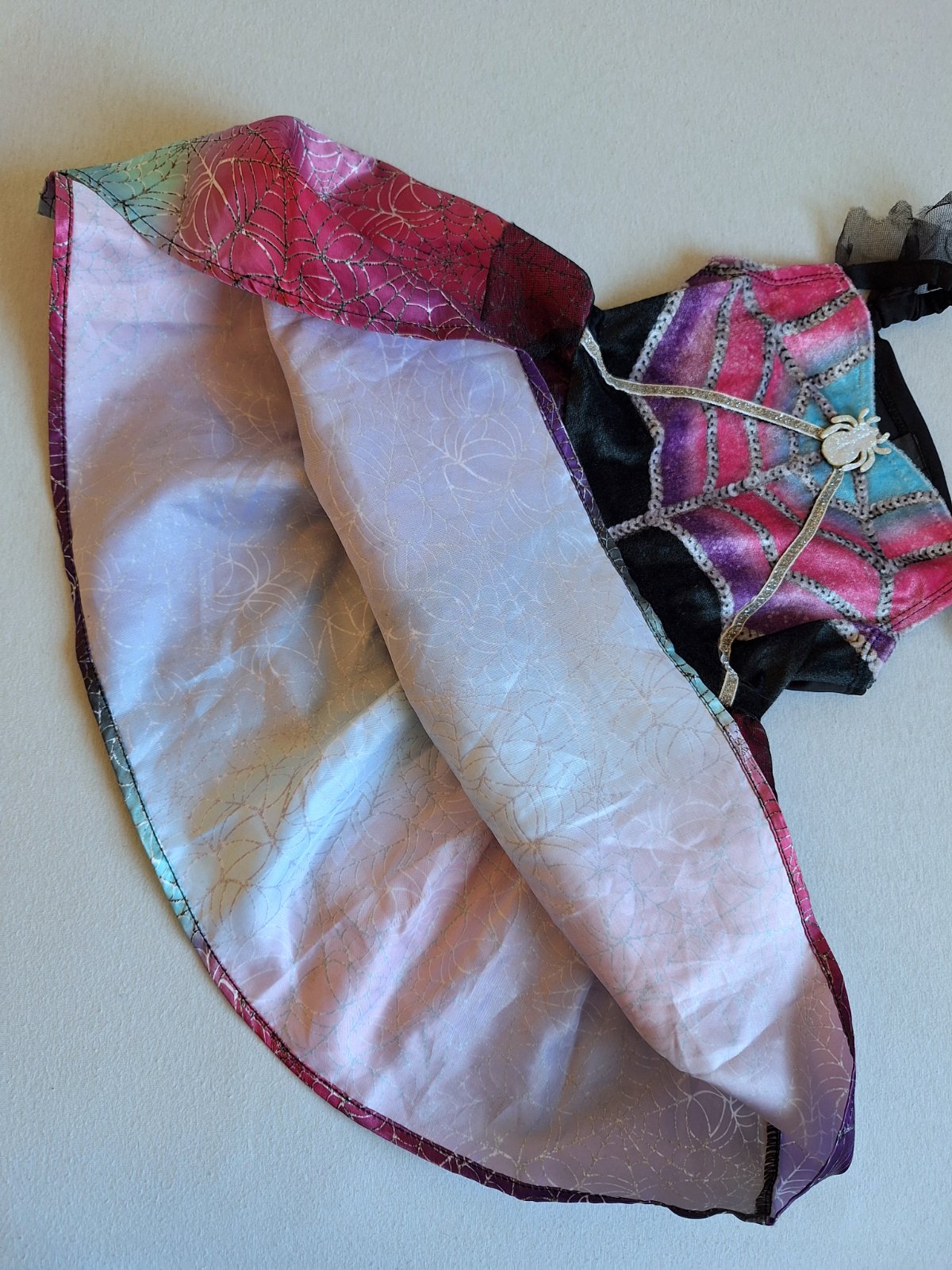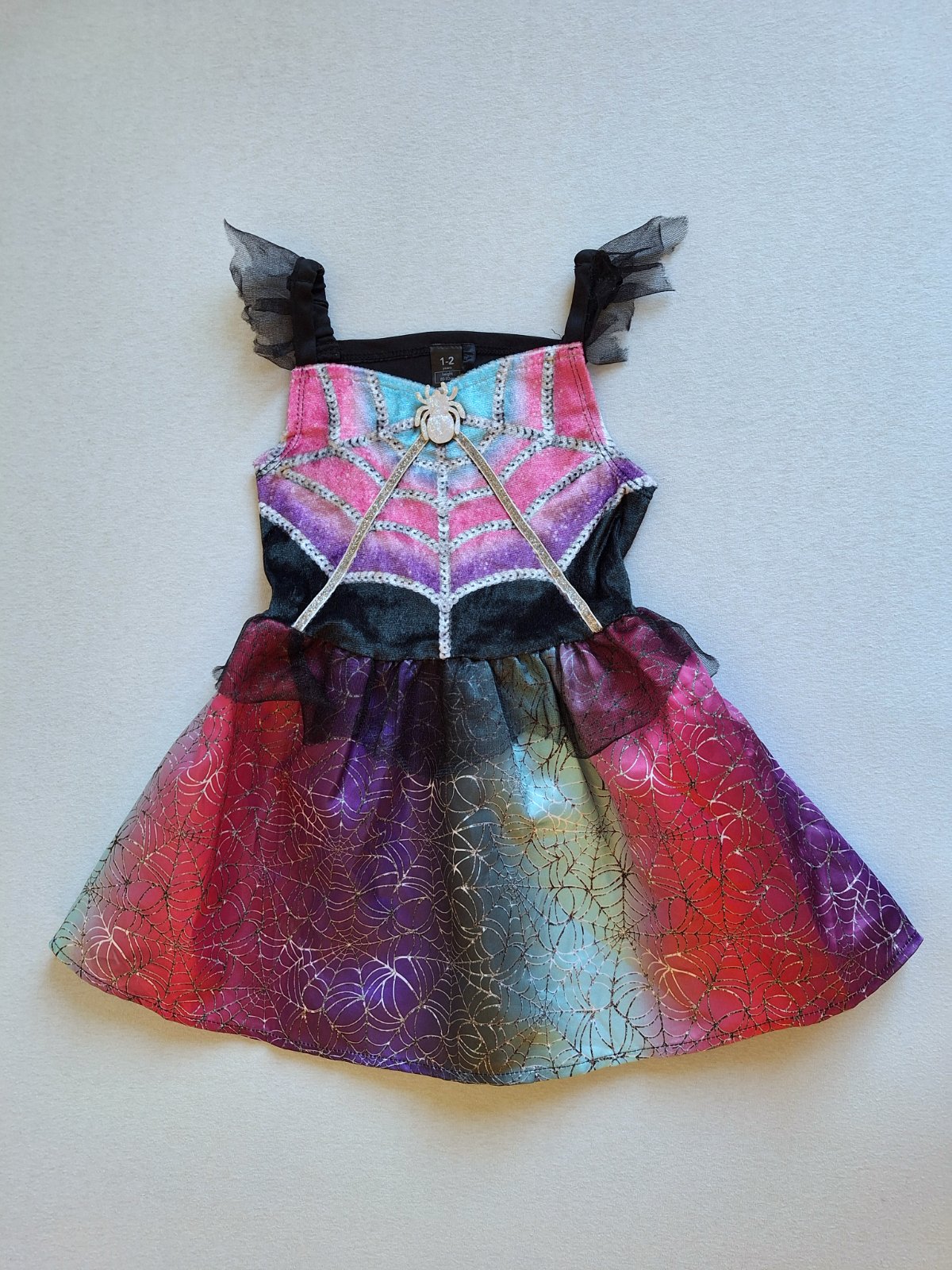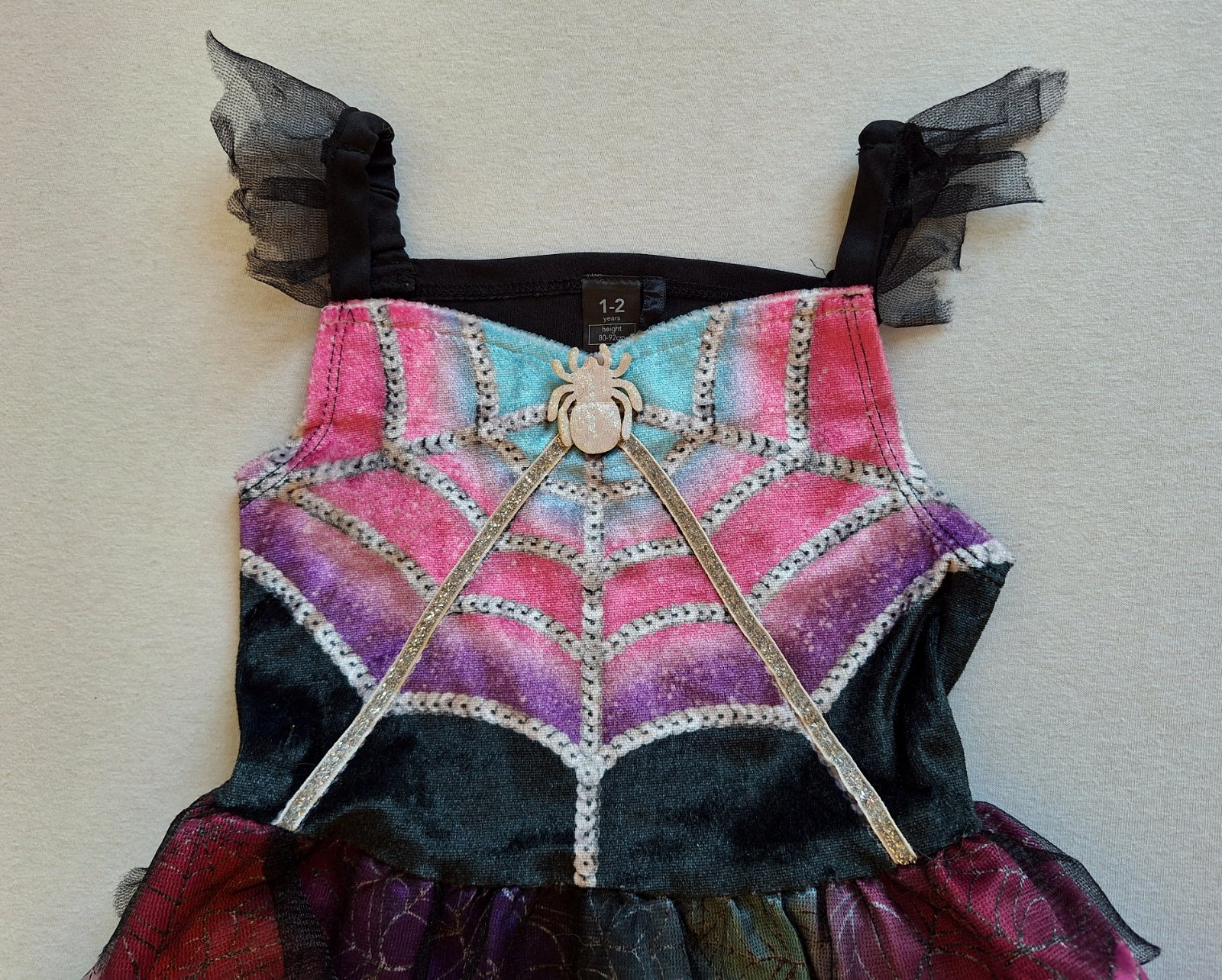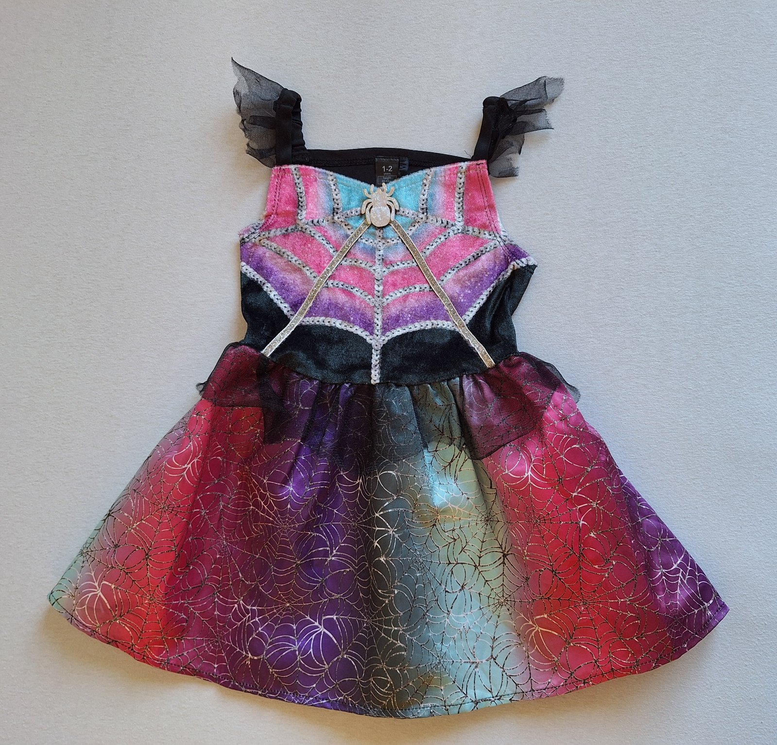 Top stav bez poškodení a známok nosenia ako nové. Šaty sa pekne prispôsobia postave- elastický živôtik. Krásne farby, živôtik lesklý zamatový s trblietavou ozdobou pavúka, v páse guma.