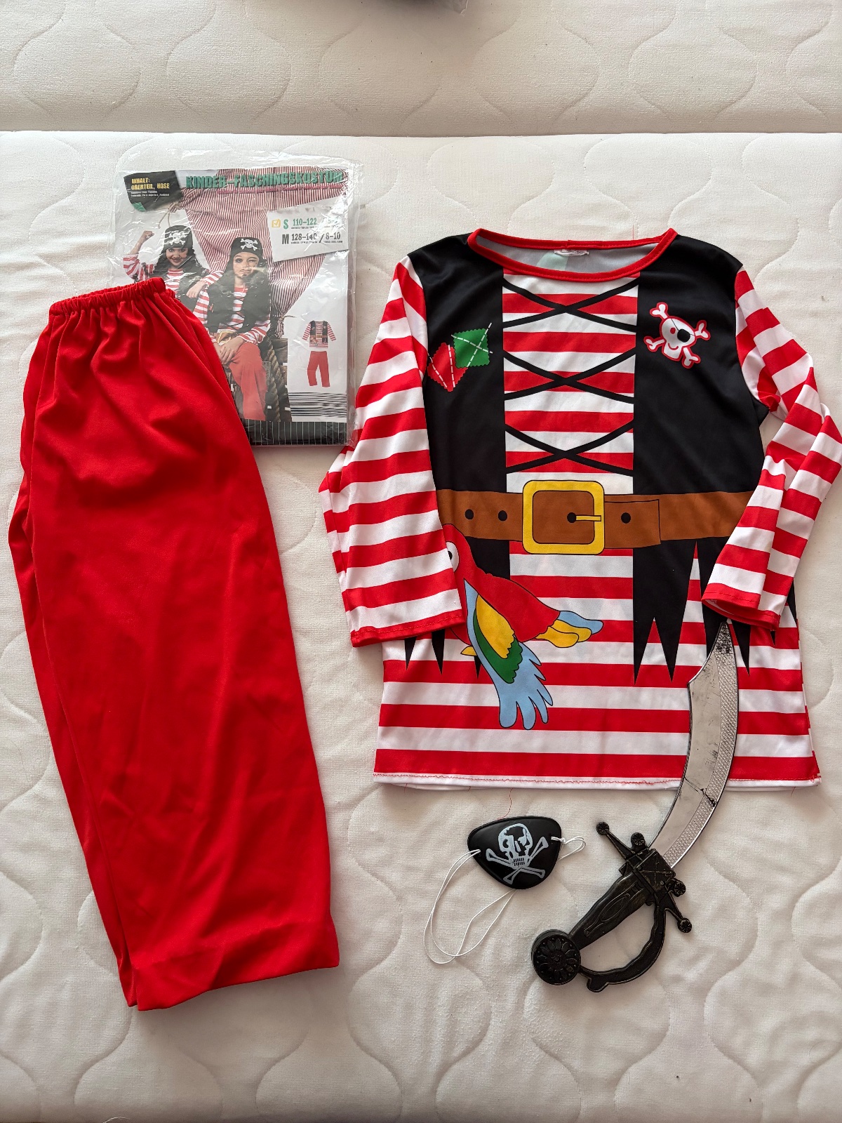 Karnevalový kostým, už nie je v top stave, ale poslúži. Aj s doplnkami. Veľkosť 110-122. Cena spolu.