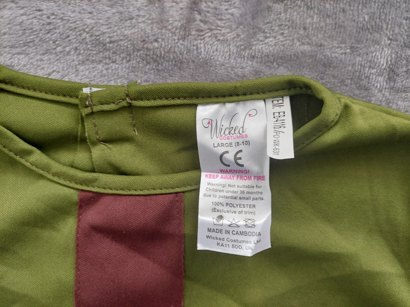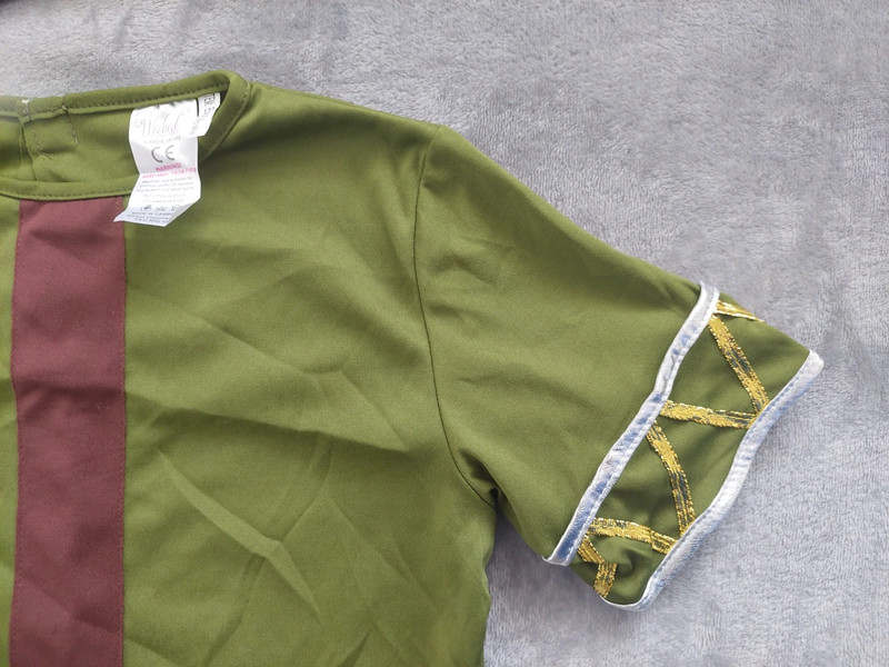Stav: na ľavej strane malinké zatiahnutie v látke, inak v top stave, 1xoblečený kostým - dlhá tunika, plášť, helma a návleky na zápästia. Chýba opasok a čierne nohavice.