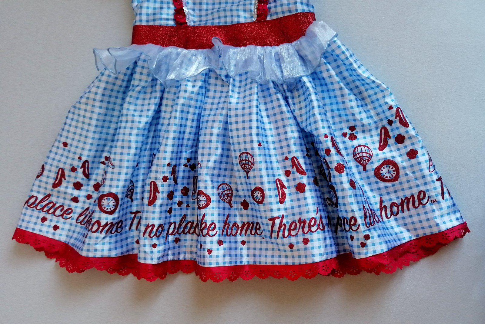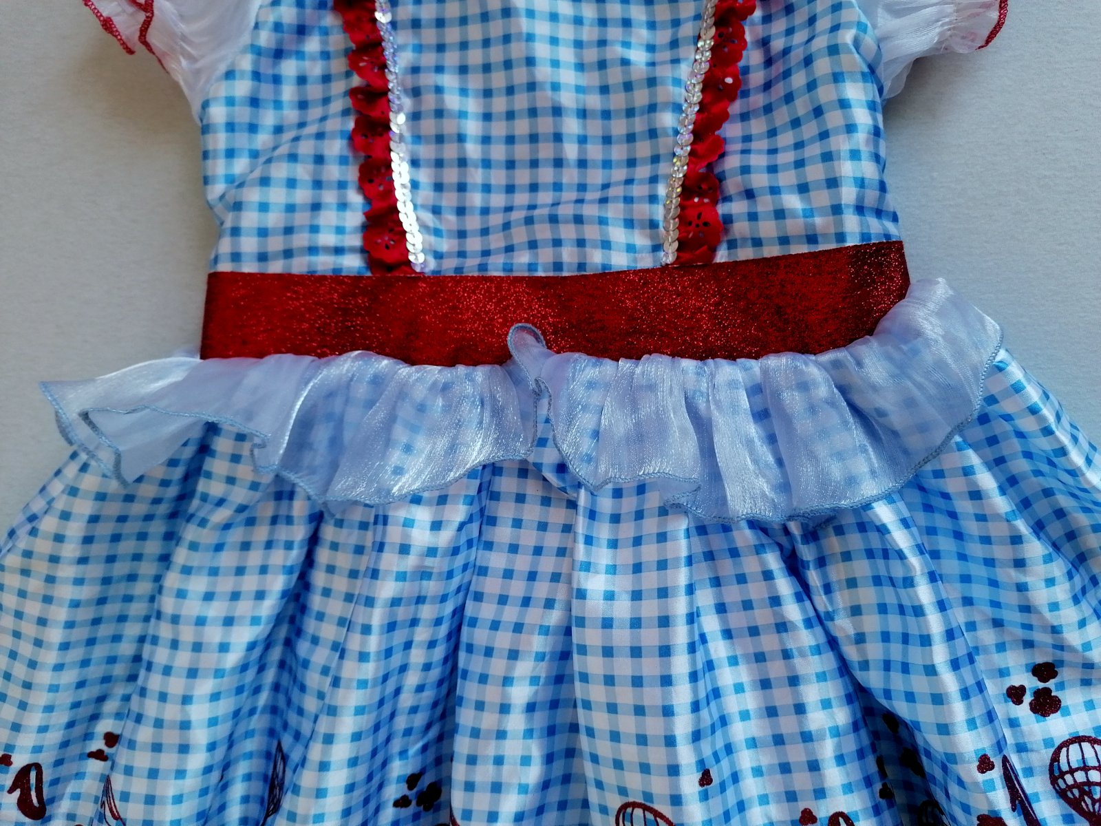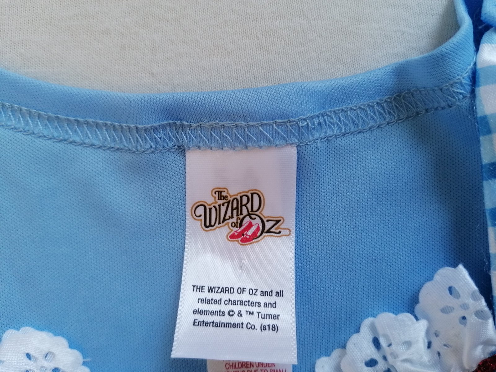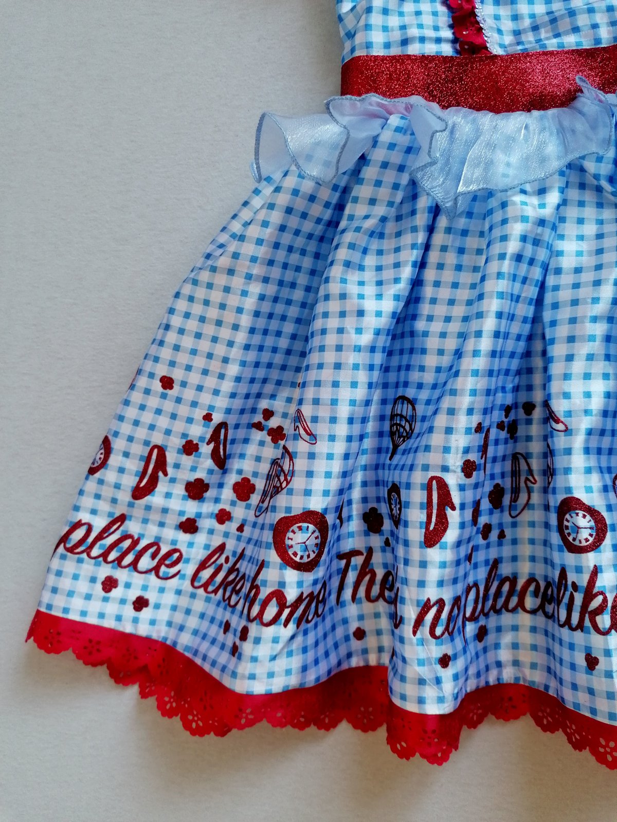 Stav: top stav, bez poškodení a známok nosenia. Pekné trblietavé šaty, z lesklého saténu, živôtik elastický na hrudi výrazná brošňa s obrázkom Dorothy, suknička je z lesklého saténu, celá zdobená trblietavými motívmi z rozprávky. Málinko elastické, v páse guma, pekne sa prispôsobia na postavu