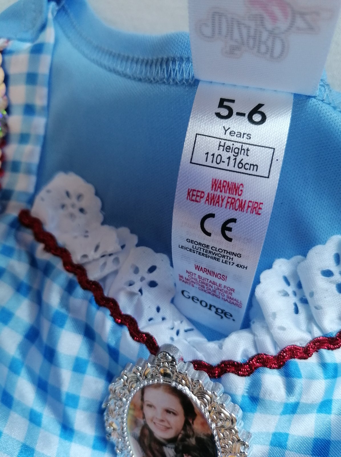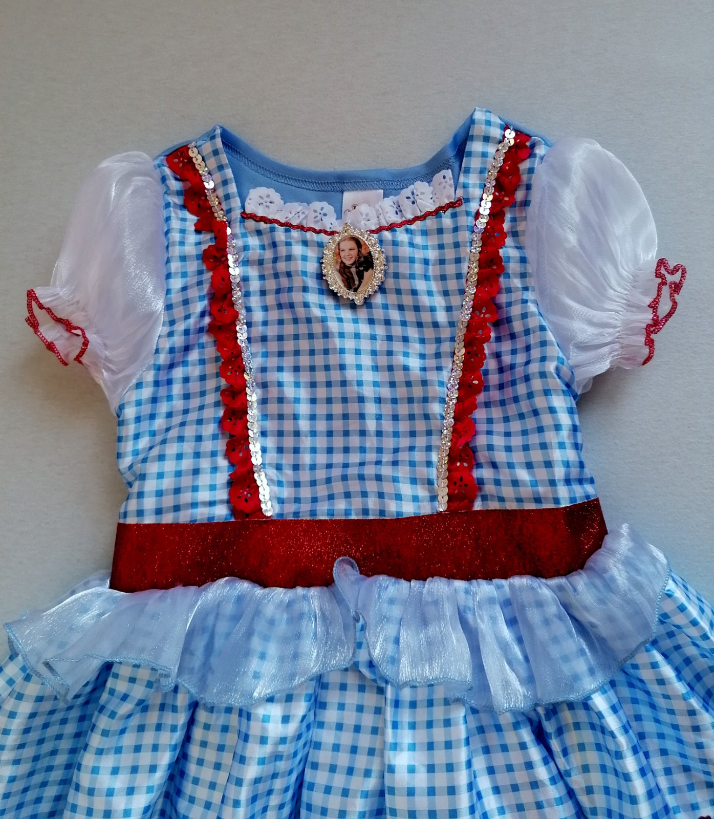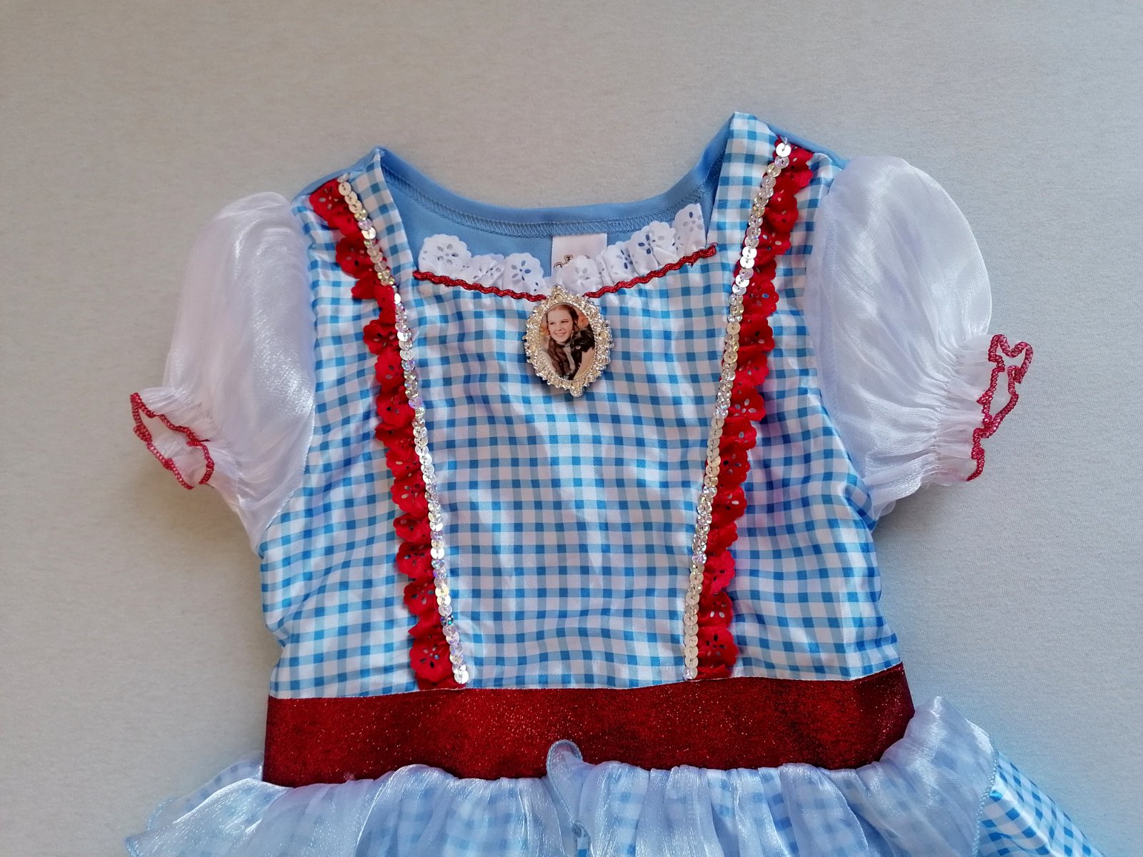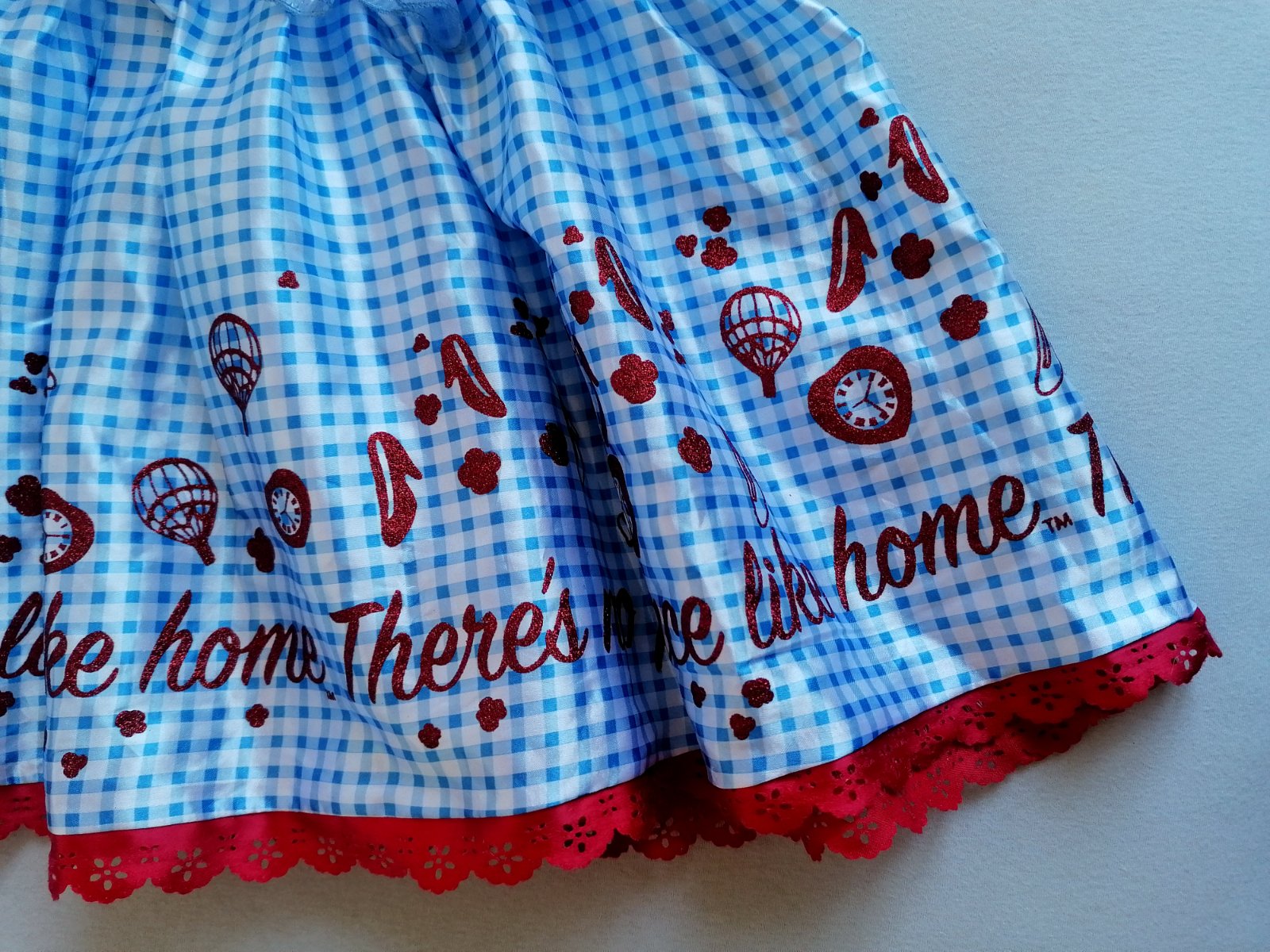 Stav: top stav, bez poškodení a známok nosenia. Pekné trblietavé šaty, z lesklého saténu, živôtik elastický na hrudi výrazná brošňa s obrázkom Dorothy, suknička je z lesklého saténu, celá zdobená trblietavými motívmi z rozprávky. Málinko elastické, v páse guma, pekne sa prispôsobia na postavu