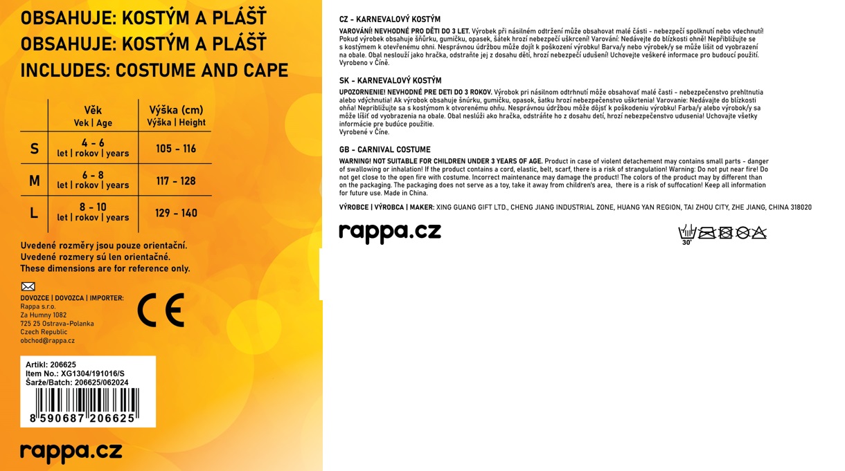 Kostým o veľkosti S je určený pre dievčatká vo vekovom rozmedzí 4-6 rokov (105-116 cm).