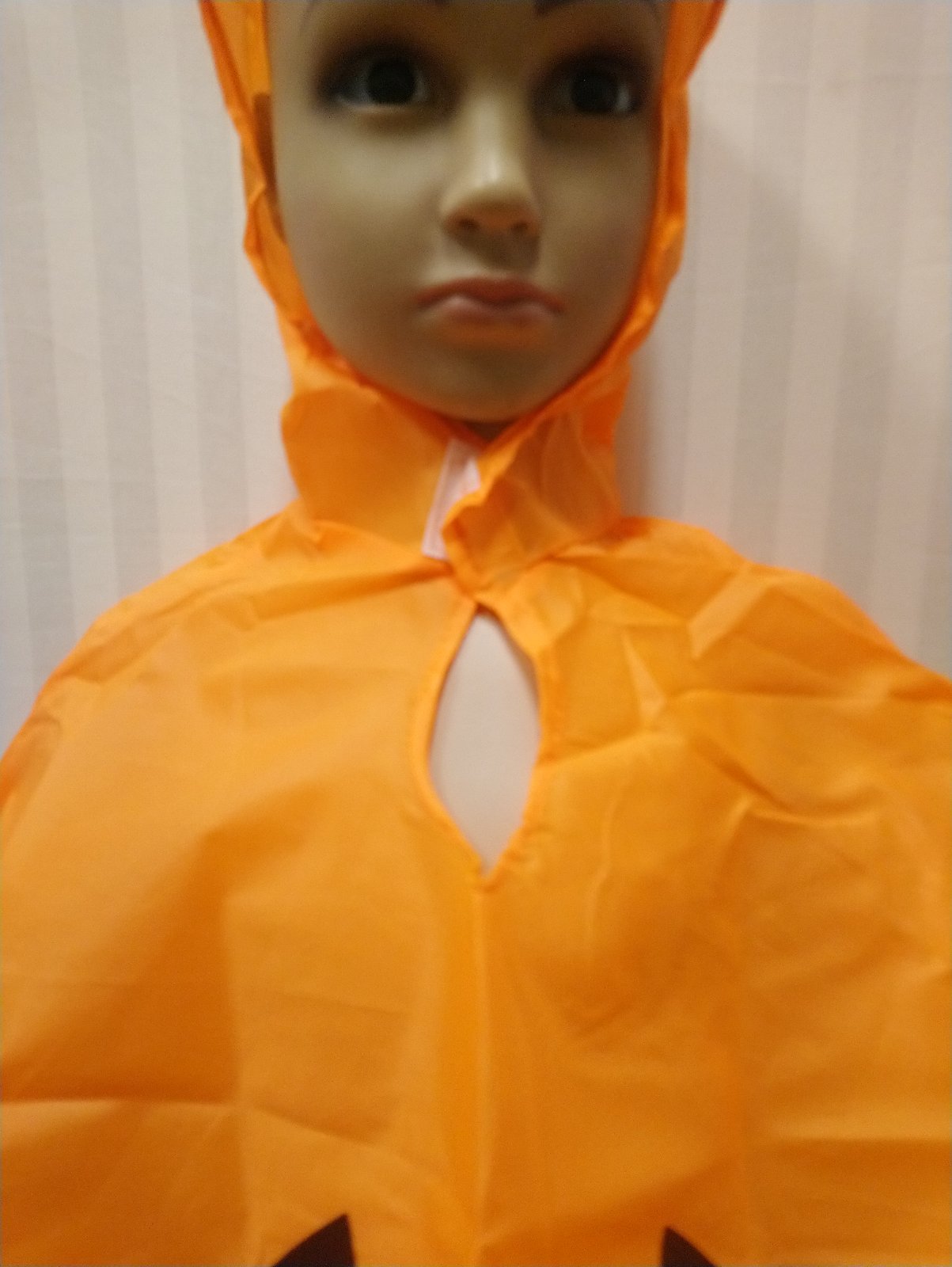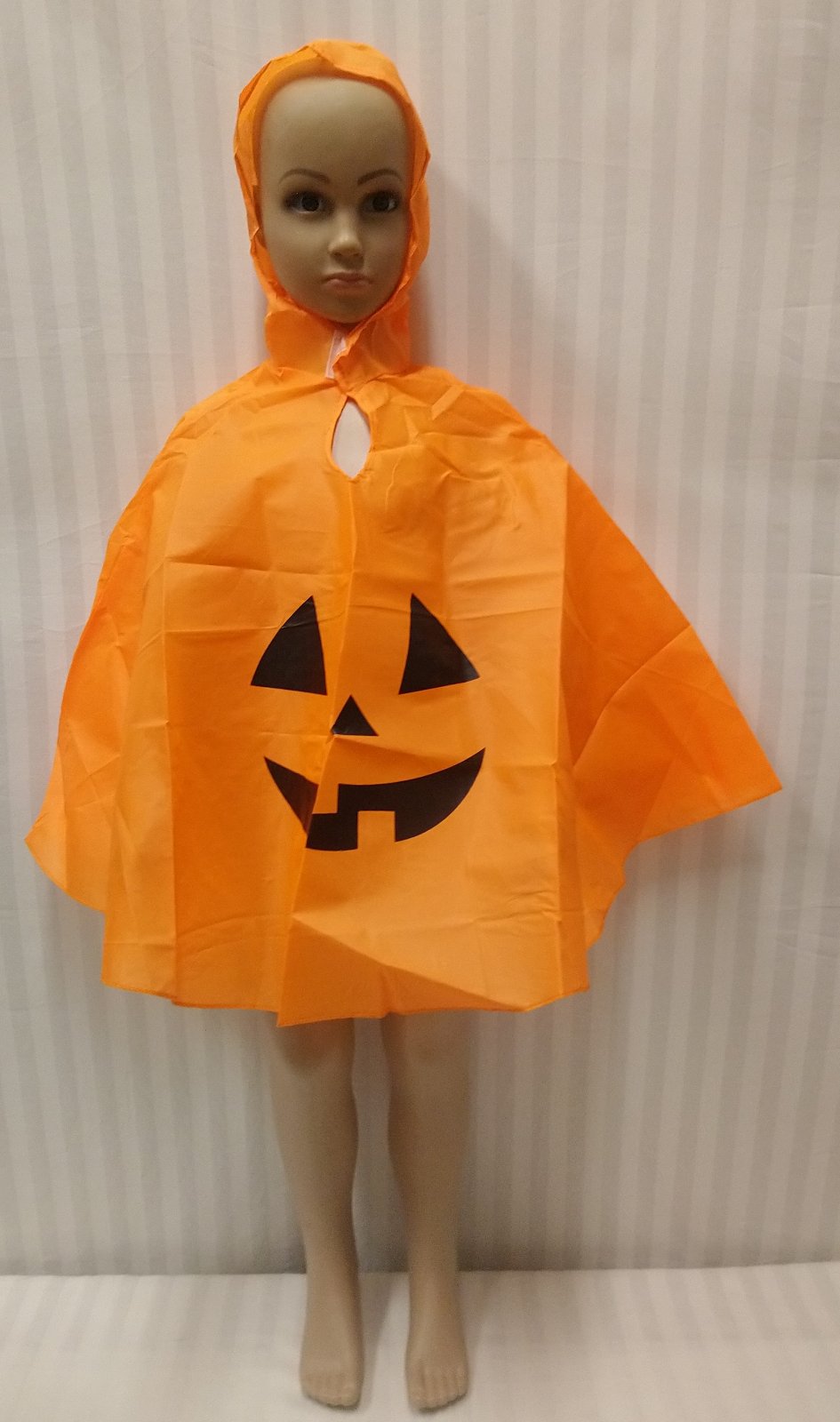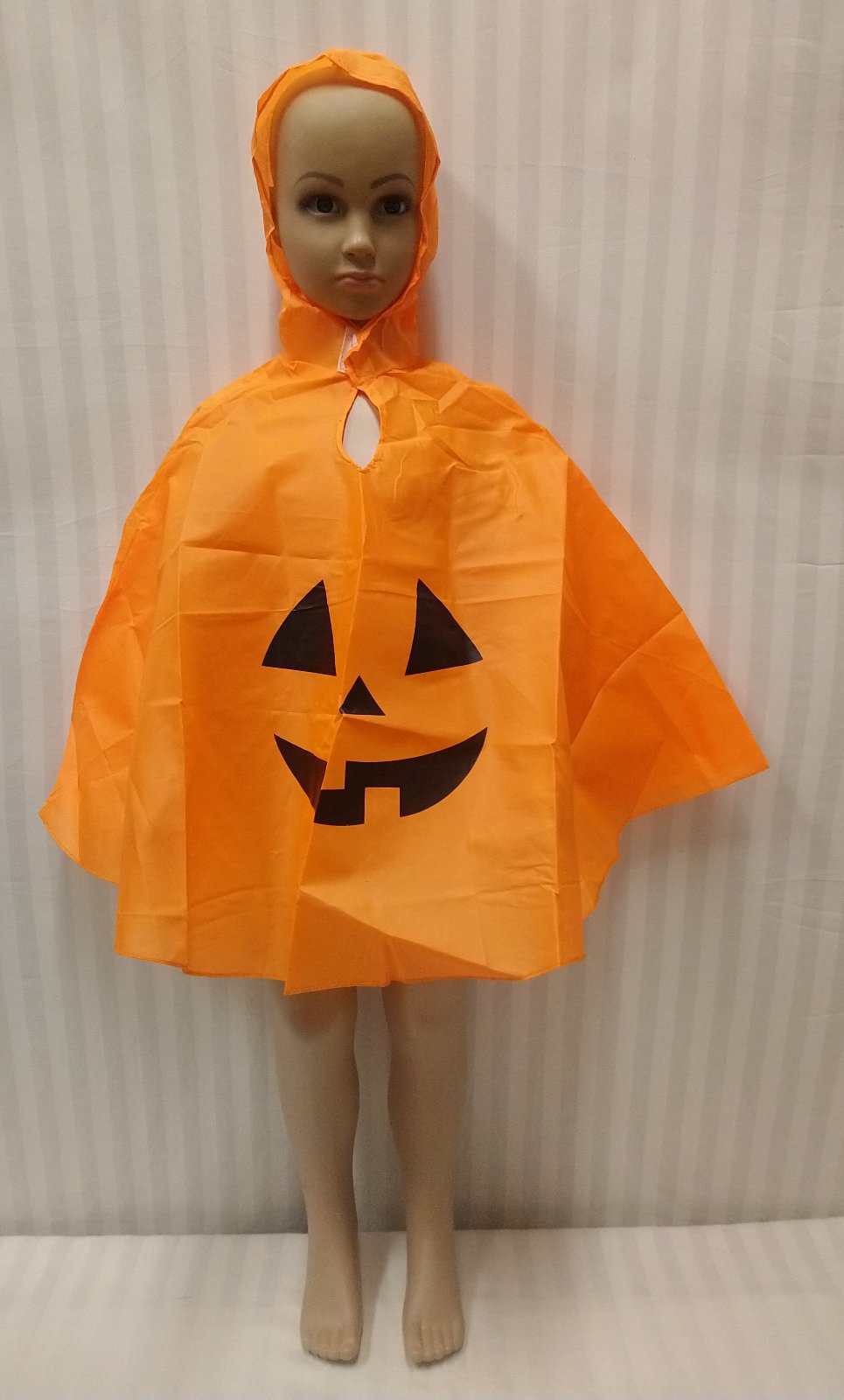 nové Halloween pončo kapucňa Tekvica obsahuje detský kostým pomarančové - sýto oranžové pončo s kapucňou so zapínaním na suchý zips pod krkom a čiernou potlačou,