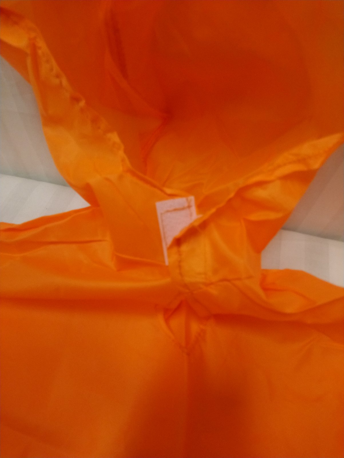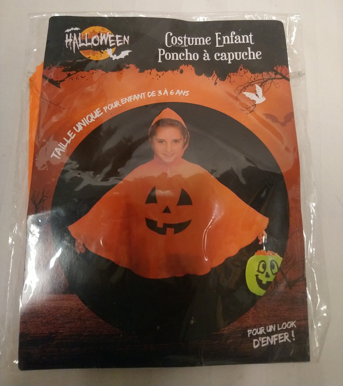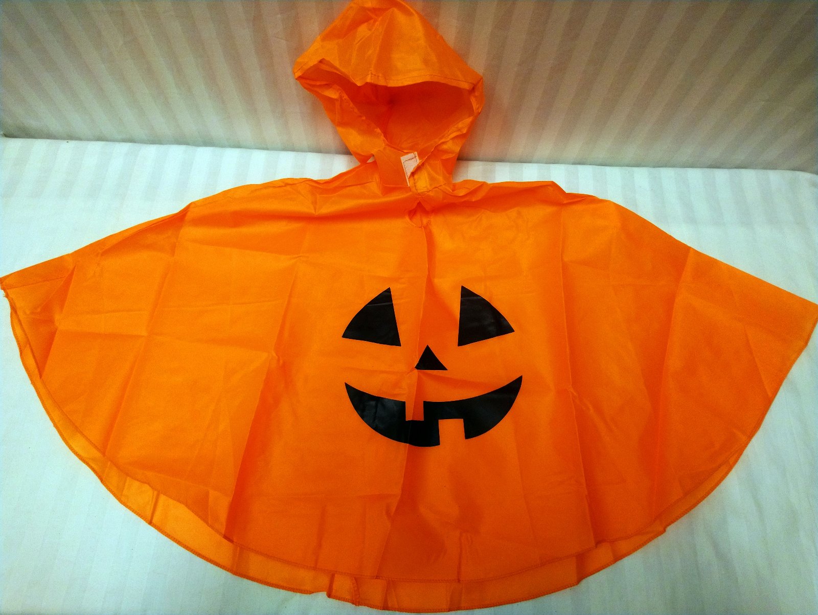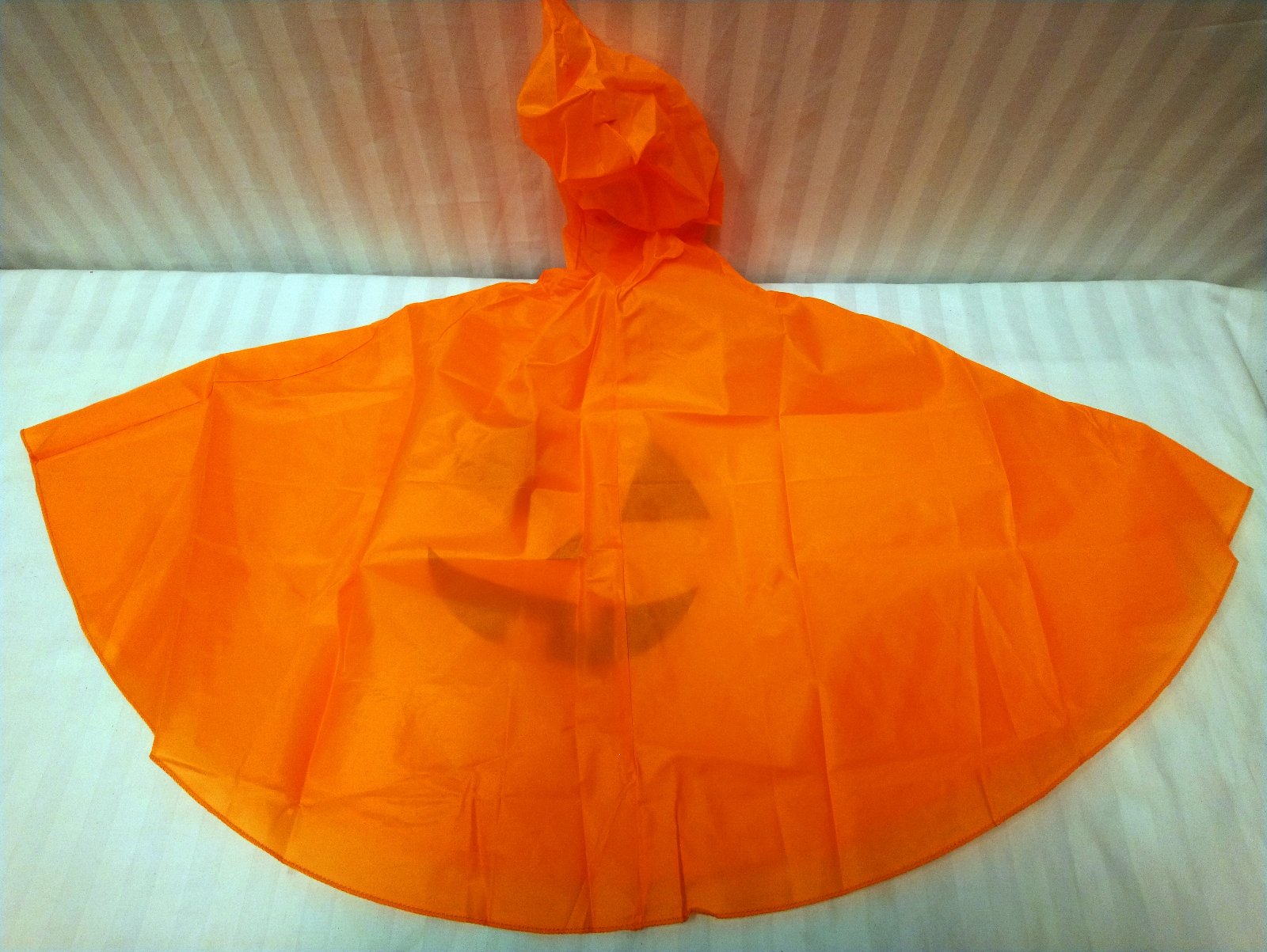 nové Halloween pončo kapucňa Tekvica obsahuje detský kostým pomarančové - sýto oranžové pončo s kapucňou so zapínaním na suchý zips pod krkom a čiernou potlačou,