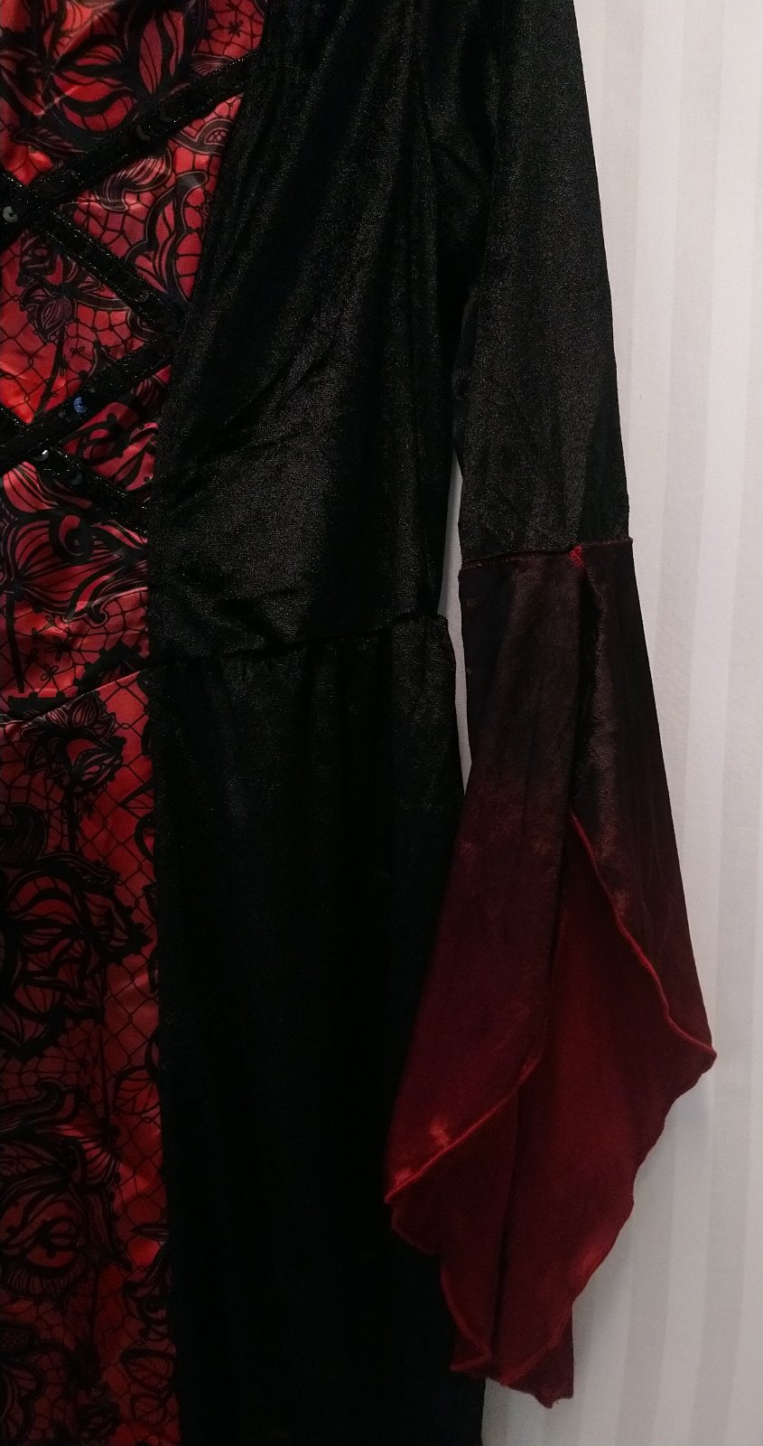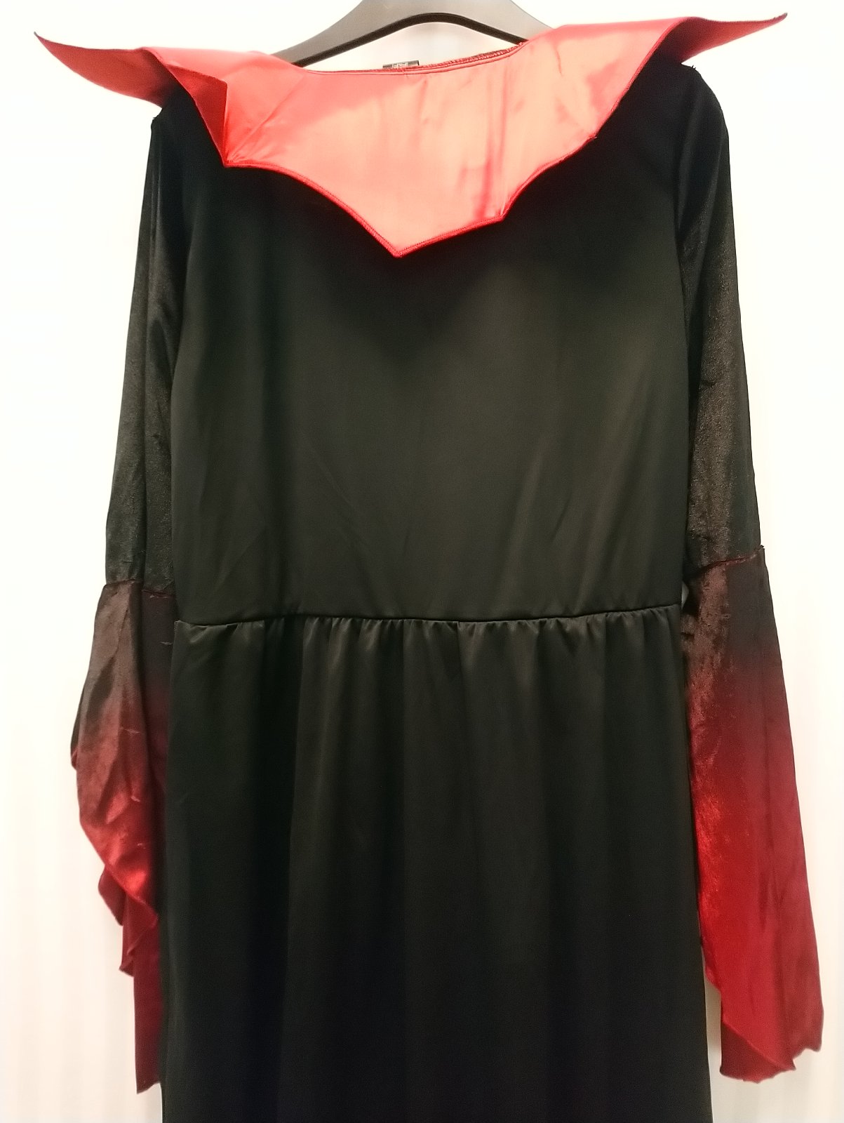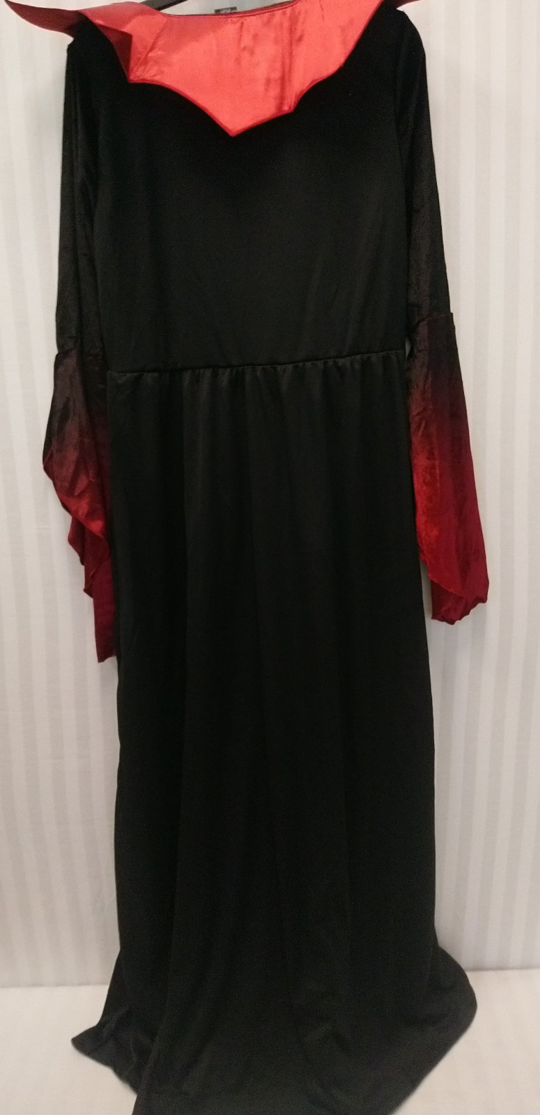 Nový dámsky červeno čierny kostým Upír dlhé šaty s dlhými rukávmi a s vysokým golierom, v páse vzadu gumička,