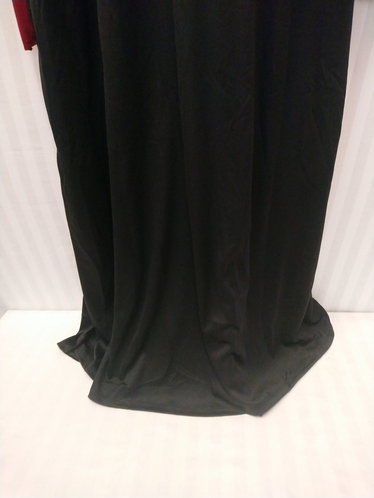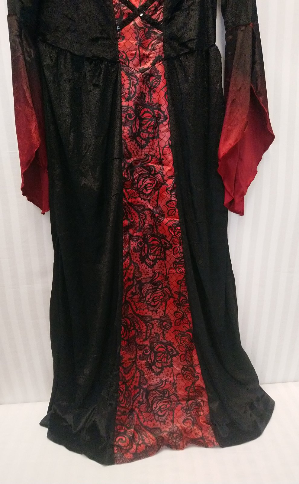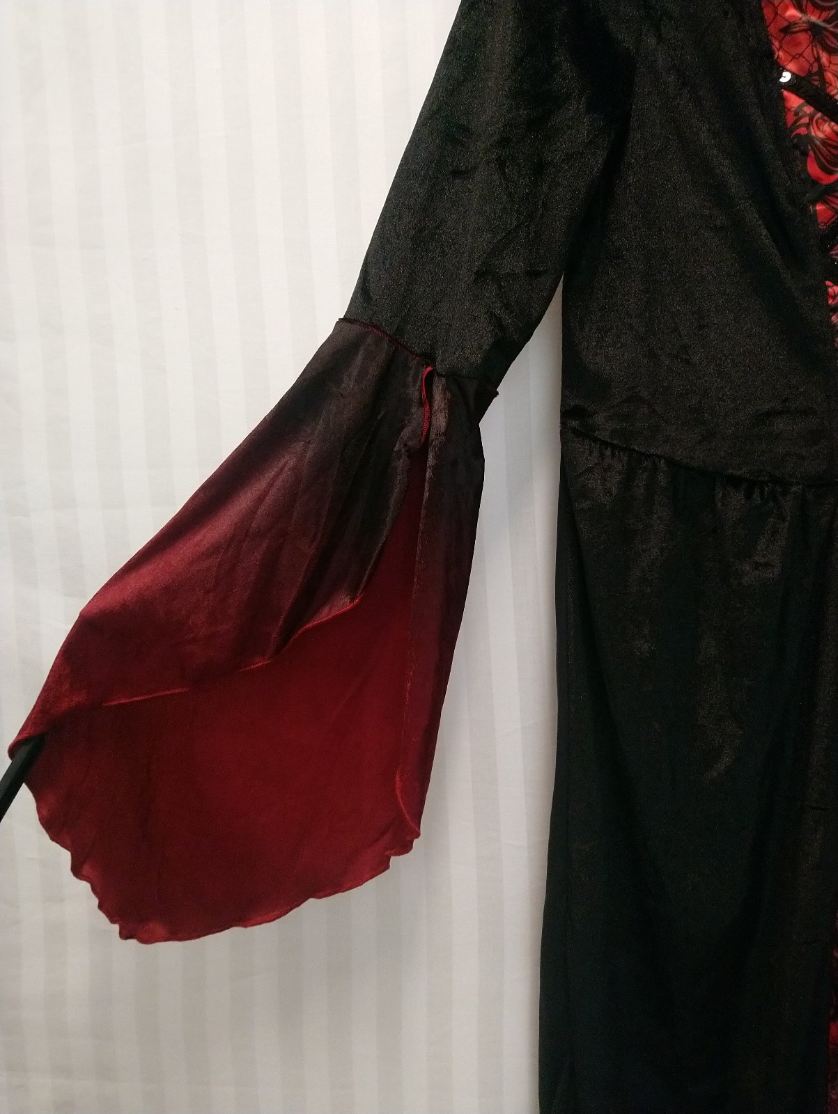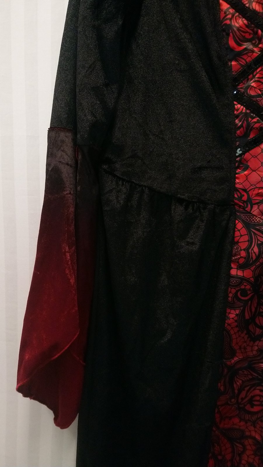 Nový dámsky červeno čierny kostým Upír dlhé šaty s dlhými rukávmi a s vysokým golierom, v páse vzadu gumička,