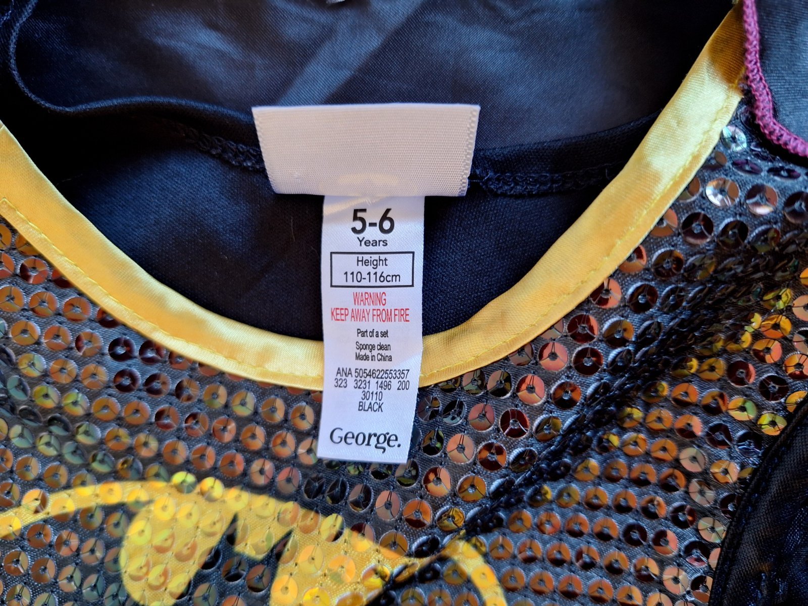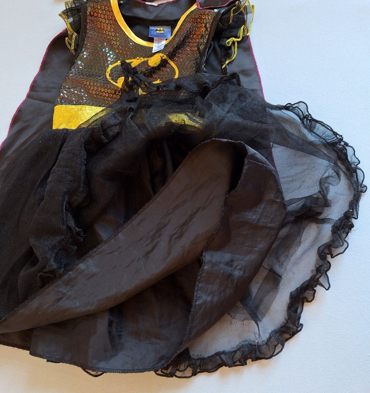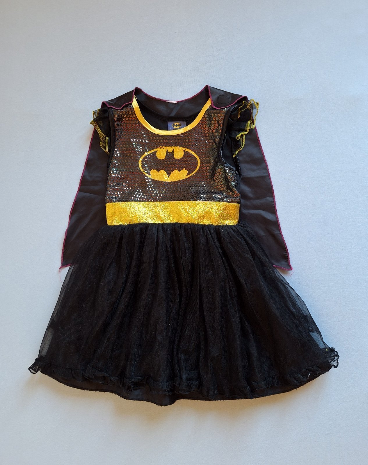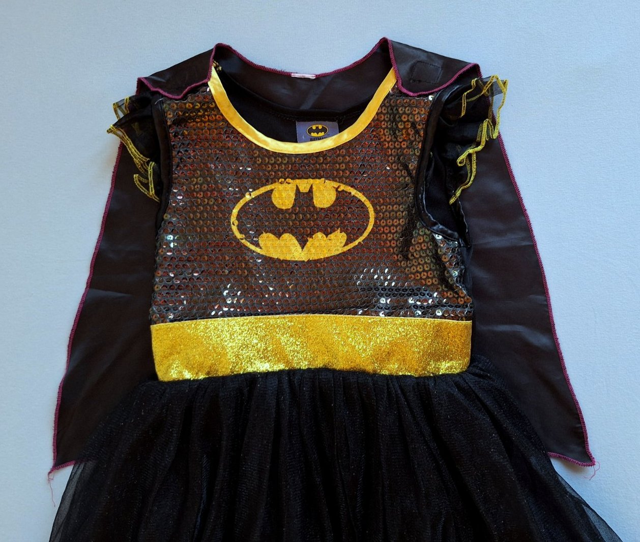 Stav: top stav, bez poškodení a známok nosenia. 2-dielny kostým (šaty + plášť) je veľmi pekne kombinovaný so zlatou. Živôtik celý zdobený flitrami, čo vytvára ligotavý vzhľad. Detailne prepracovaný, živôtik na hrudi má trblietavý znak Batmana, je elastický, prispôsobí sa postave, v páse guma. Bohato riasená sukňa s trblietkami s pevnou spodničkou. Na šaty sa na ramená upína plášť na suché zipsy.
