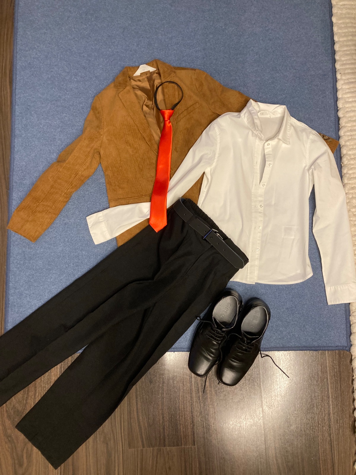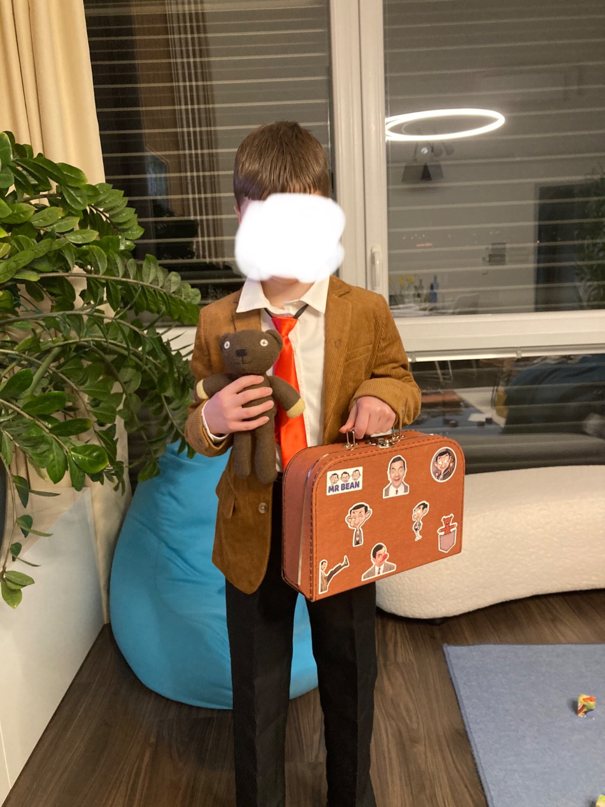 Predávam kostým Mr. Bean. Kostým pozostáva z menčestroveho saka, kravaty, košele, nohavice, kufrík, macik