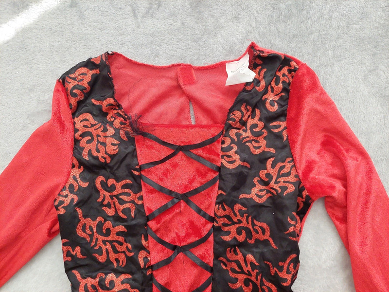 Stav: v páse odpáraný spoj asi 1cm + čierna stužka pod krkom odpáraná + chýba stojatý golierik na upírske šaty. Inak sú šaty krásne, v top stave po zašití ako nové. Celozamatové, zdobené pevnejšou čiernou látkou zdobenou flitrami, v páse guma. Vhodné na kostým princeznej, kráľovnej, upírky a pod.